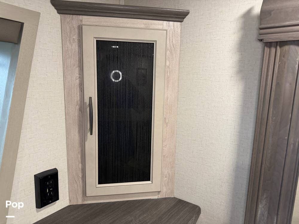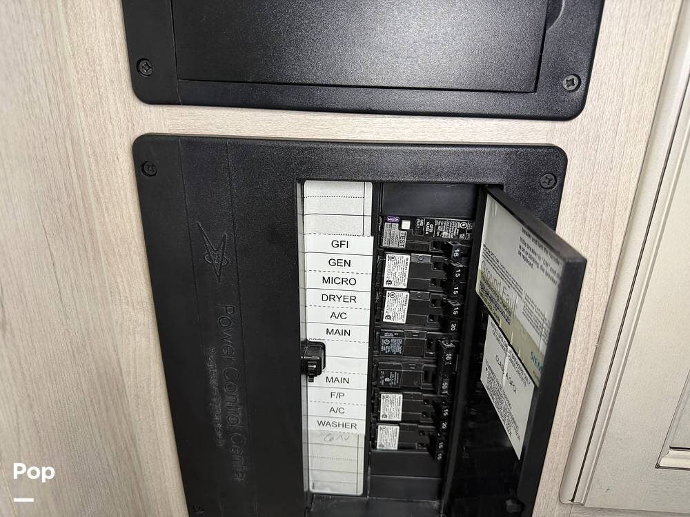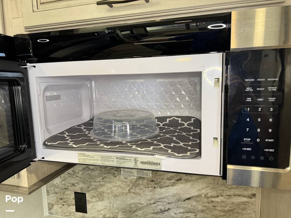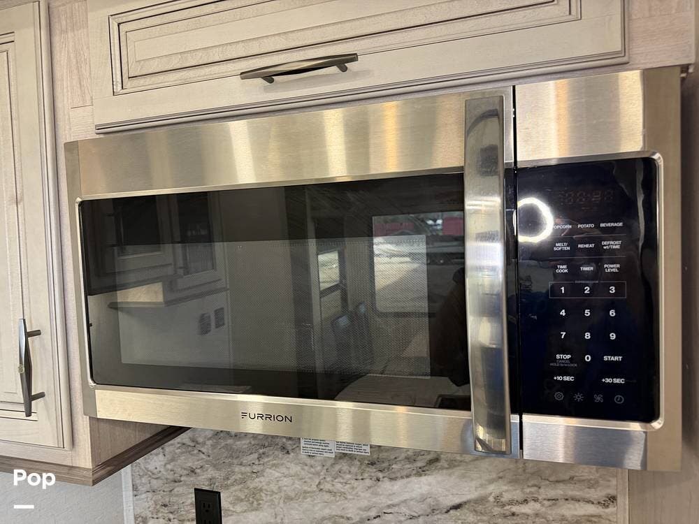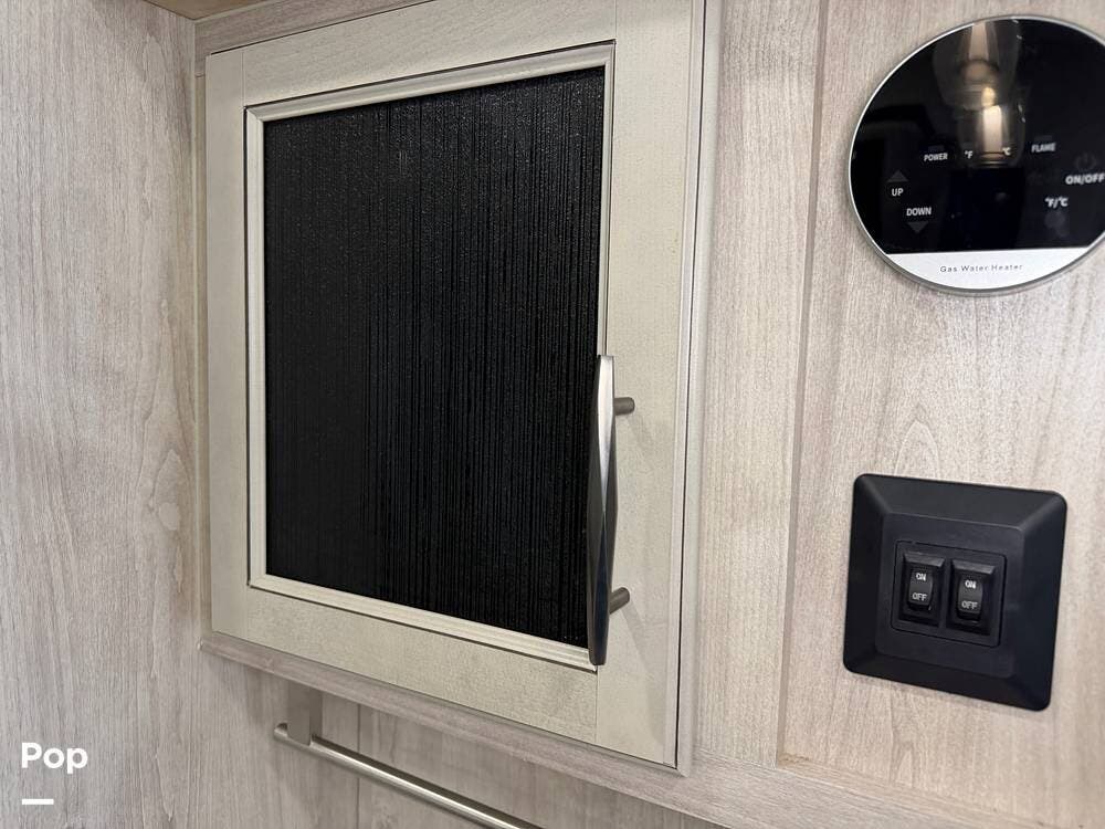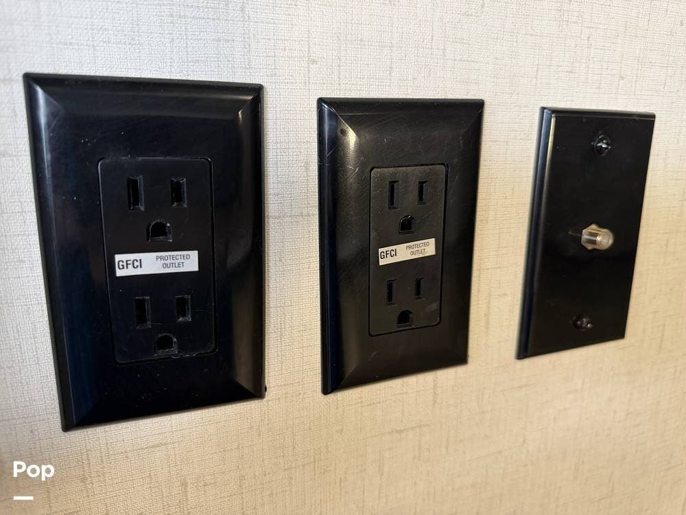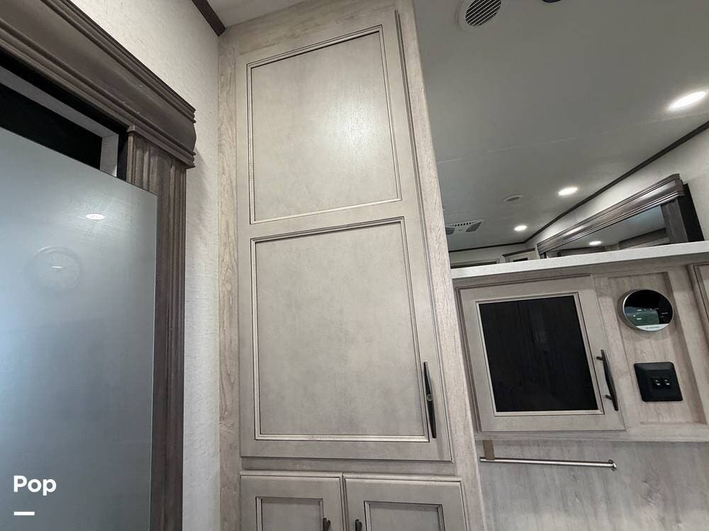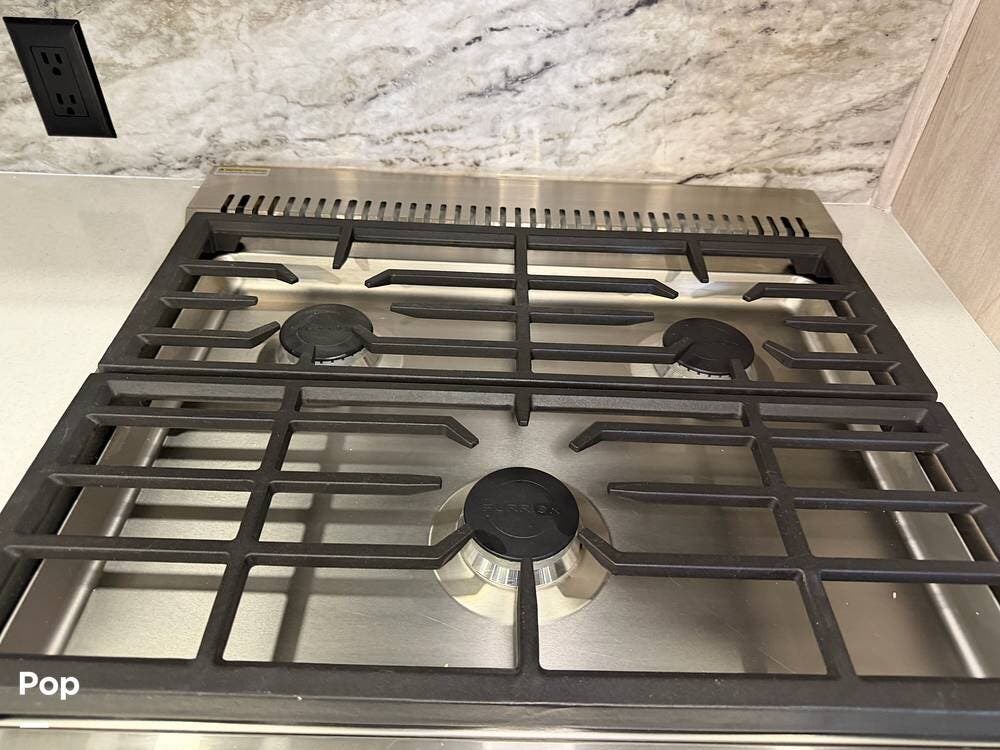 Head up the steps in front to a dual slide front living area with a 50" pop-up TV and a fireplace beneath the window. There is also theater seating opposite the TV, and a tri-fold hide-a-bed in each slide, allowing added sleeping space when needed.