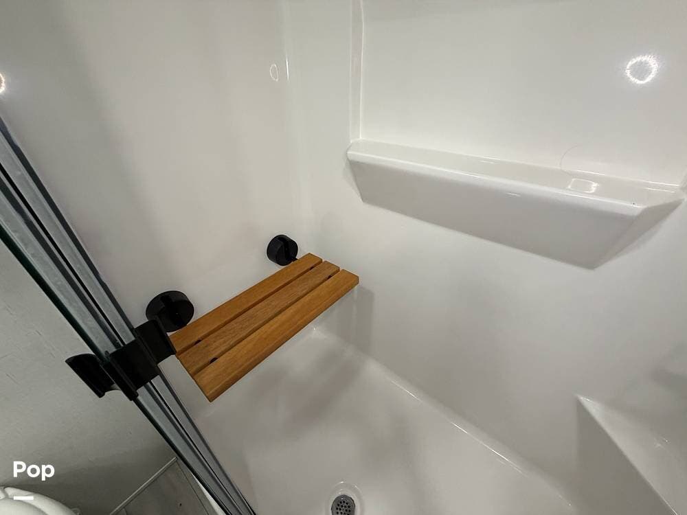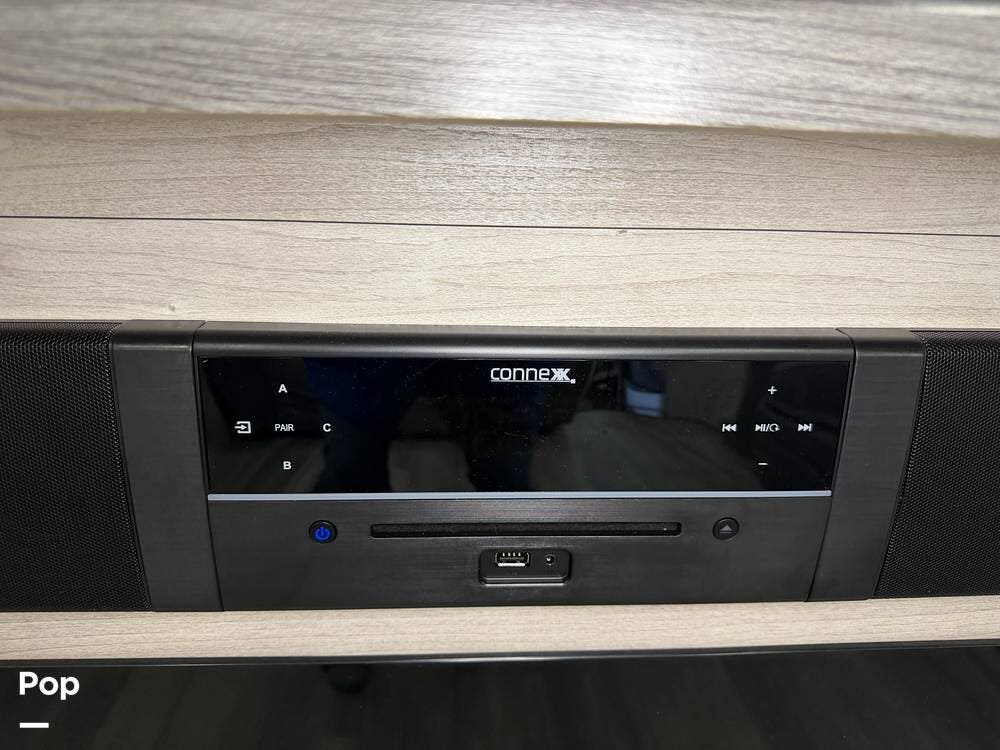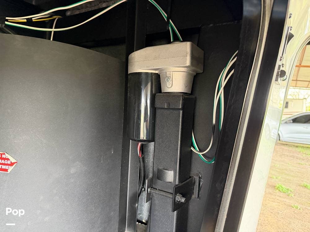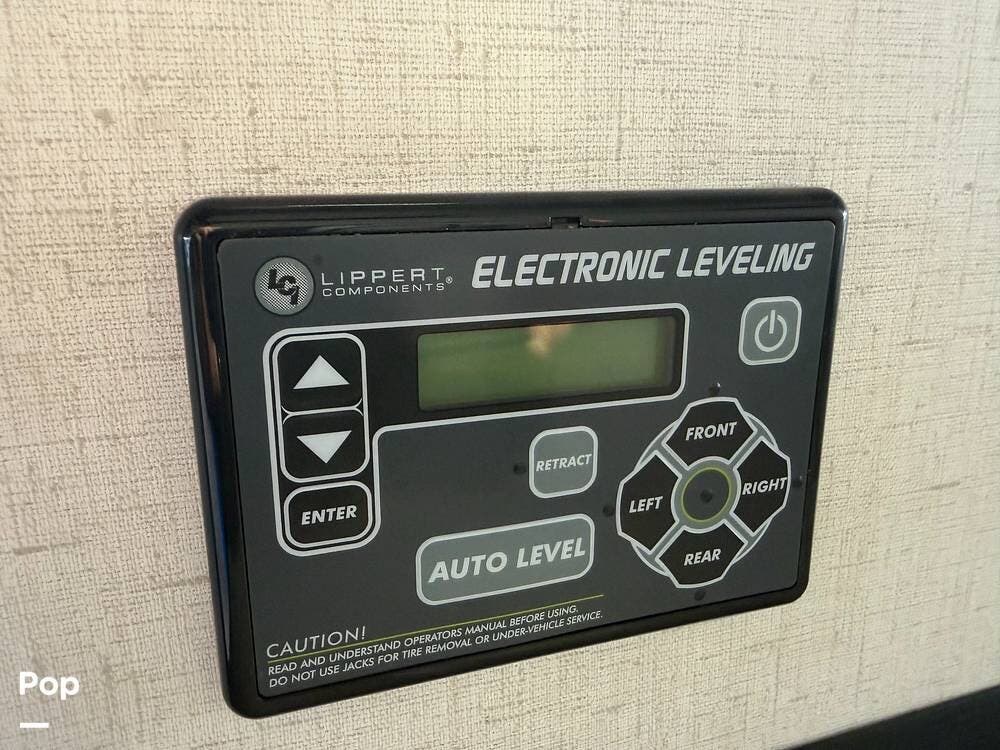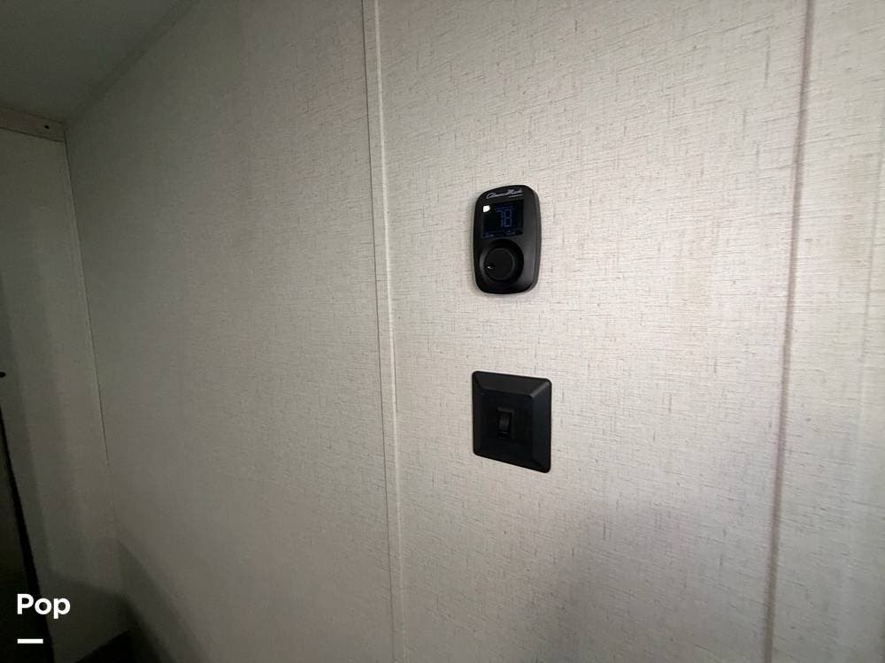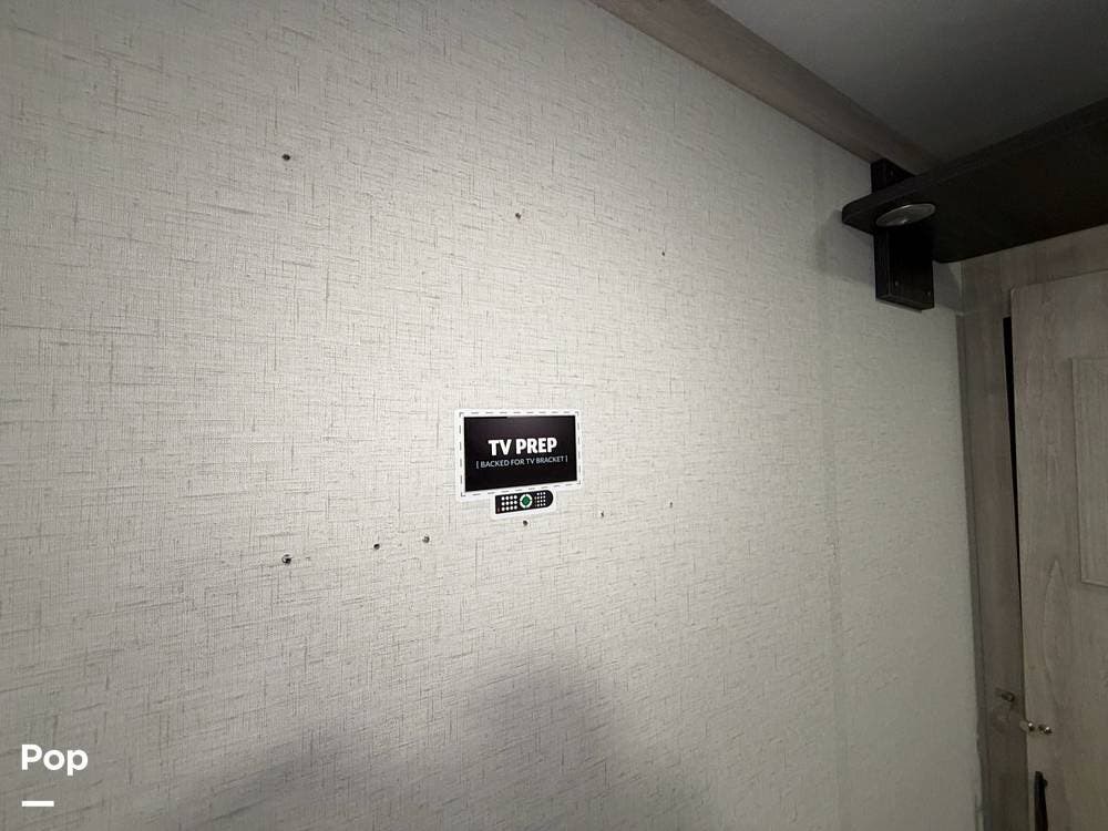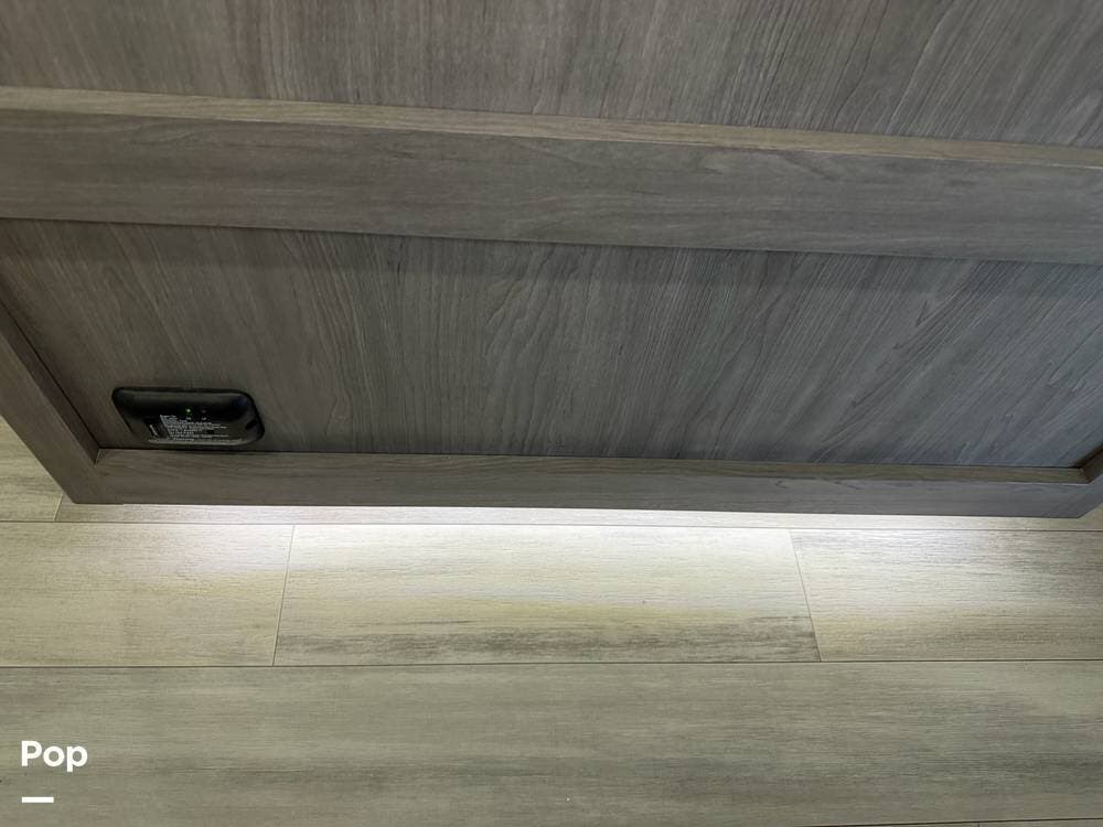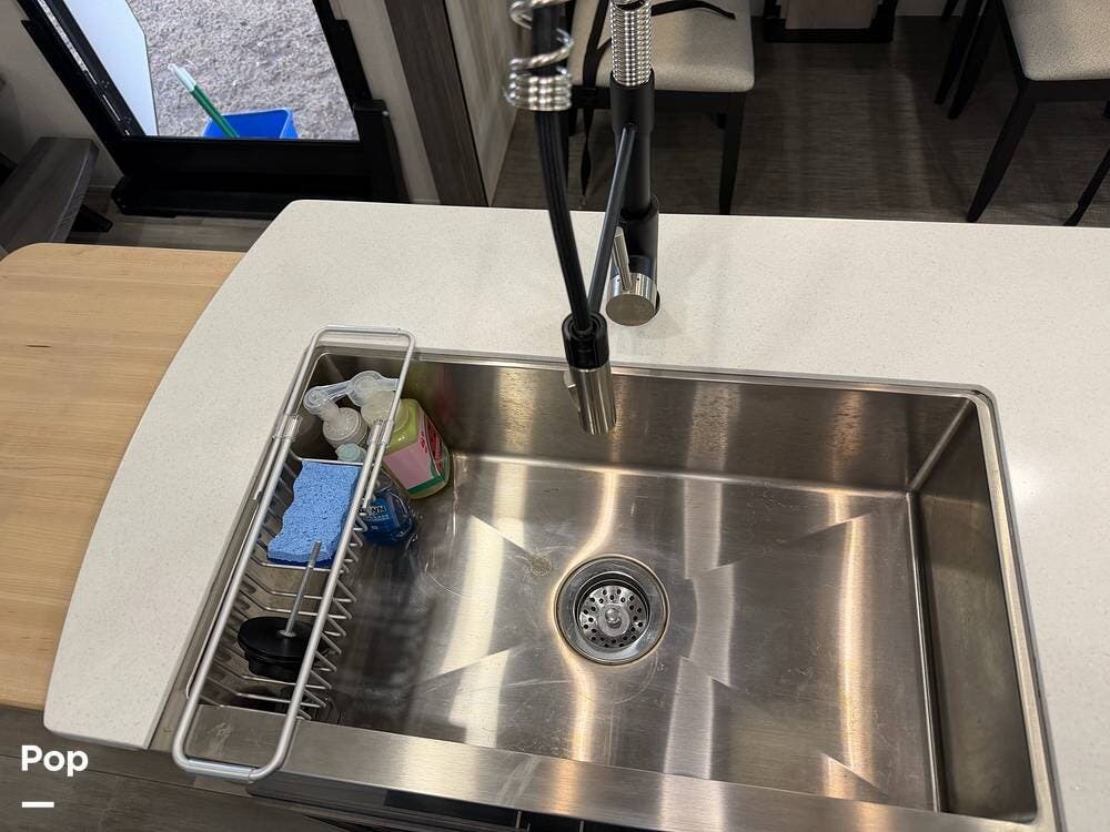 Head up the steps in front to a dual slide front living area with a 50" pop-up TV and a fireplace beneath the window. There is also theater seating opposite the TV, and a tri-fold hide-a-bed in each slide, allowing added sleeping space when needed.
