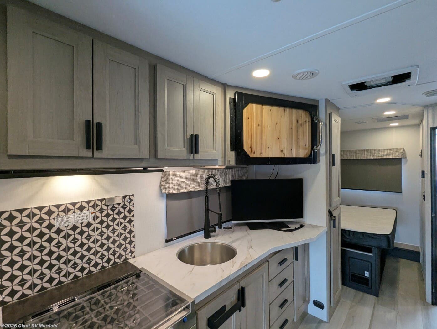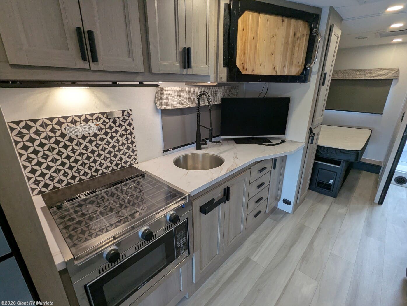 - Modern Amenities: Features air conditioning, a kitchen with a 10 cu ft 12V refrigerator, convection microwave, and a 40” LED TV for entertainment.