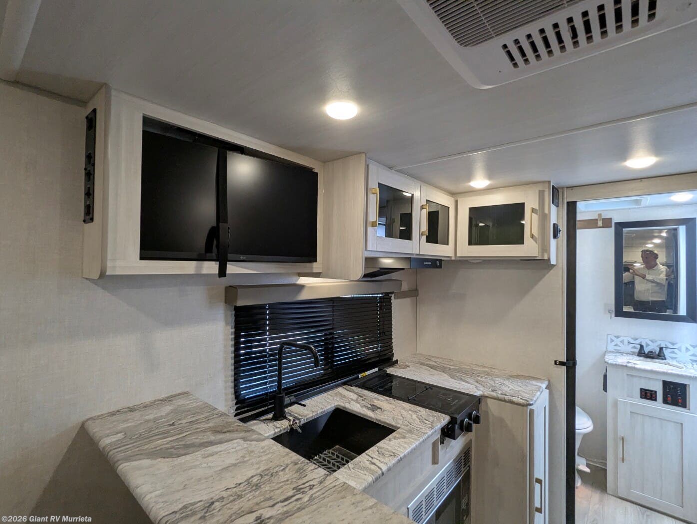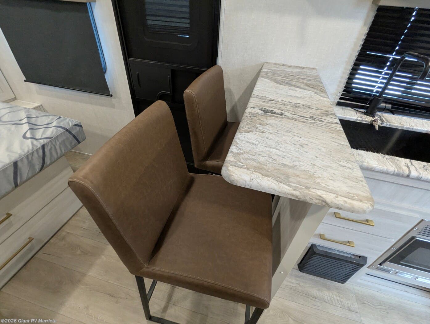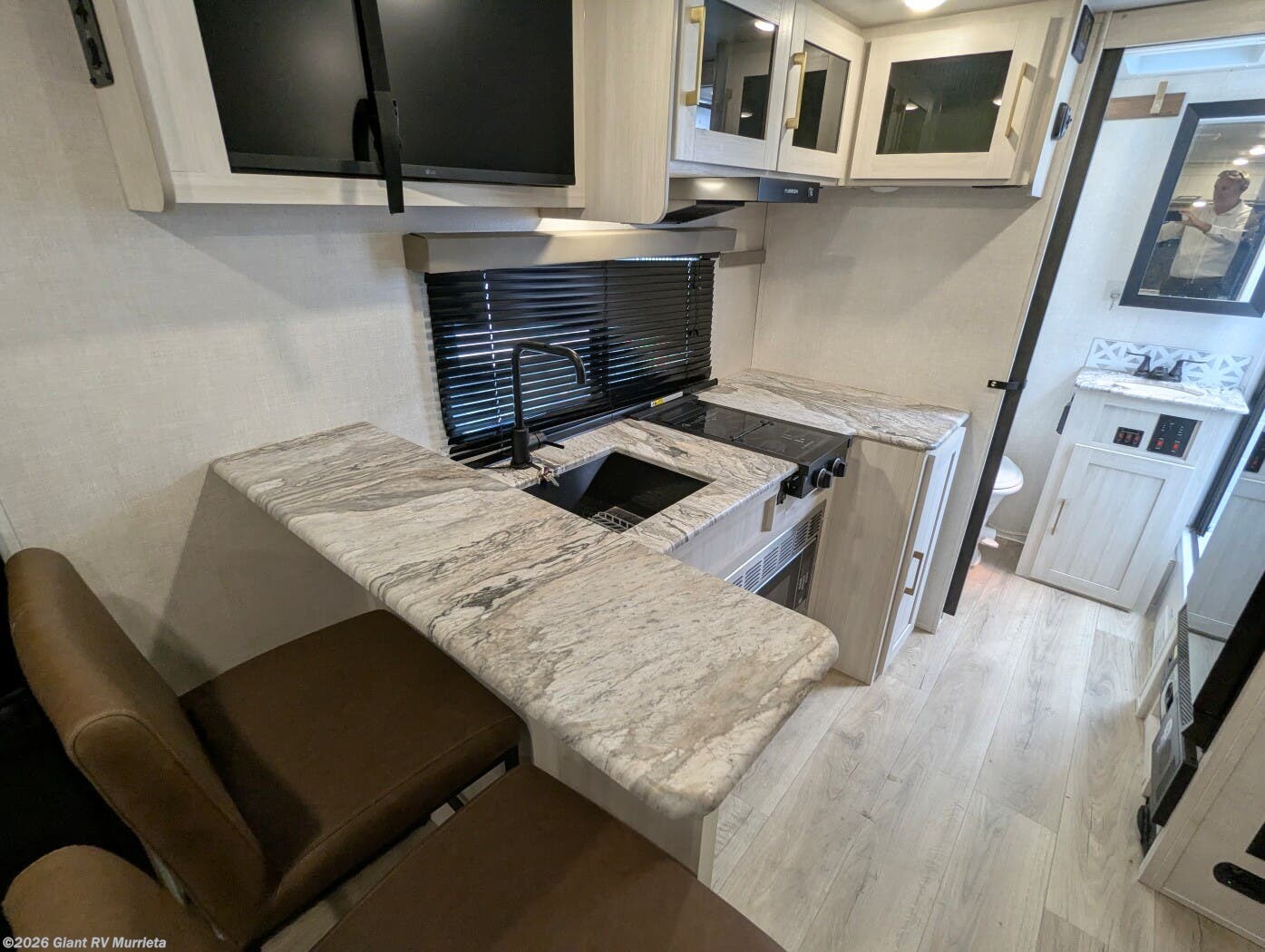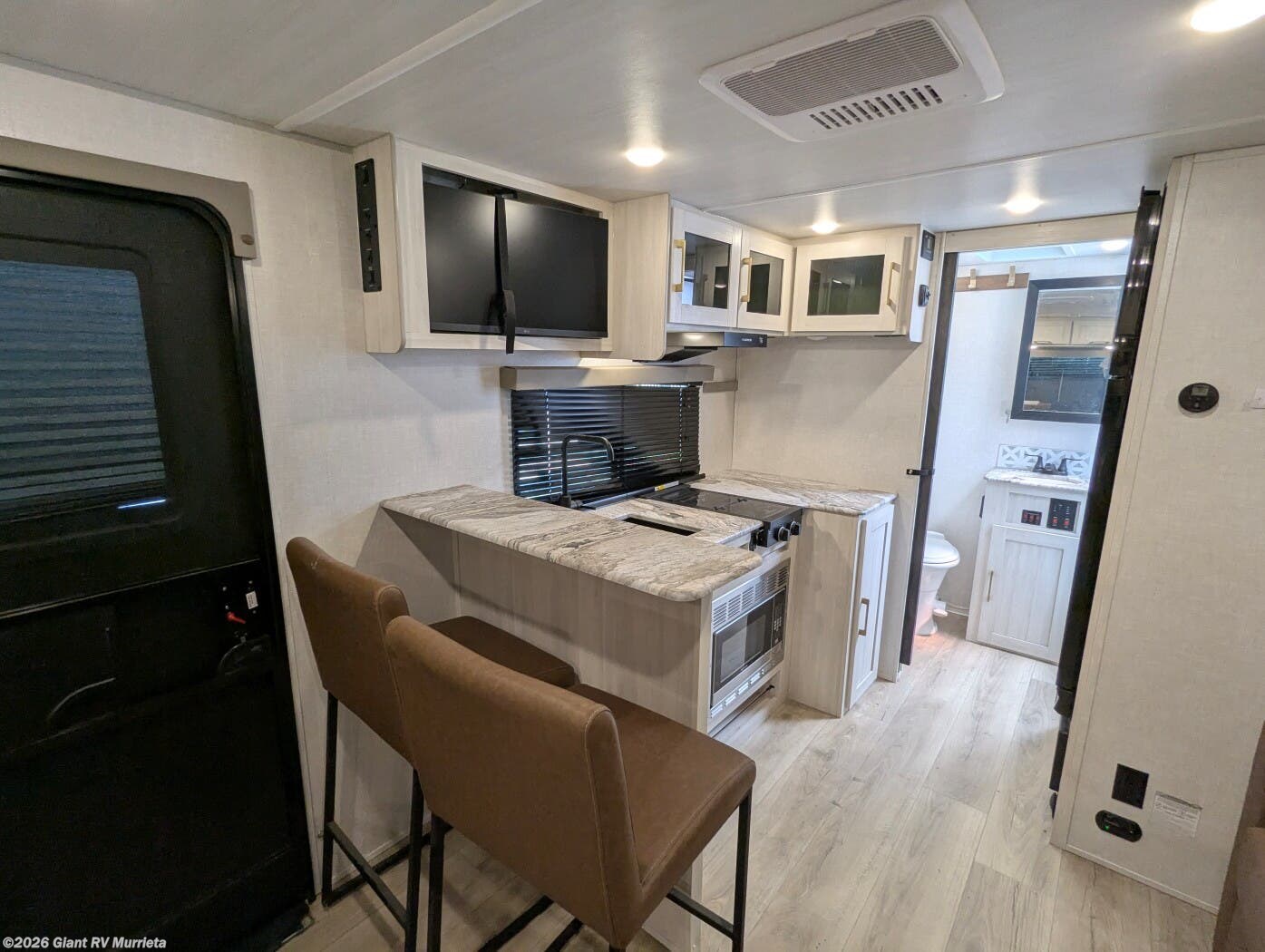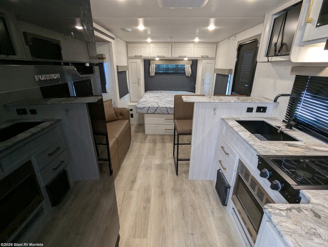 - Gourmet Kitchen: 10 cu. ft. 12V fridge, 2-burner cooktop, microwave
