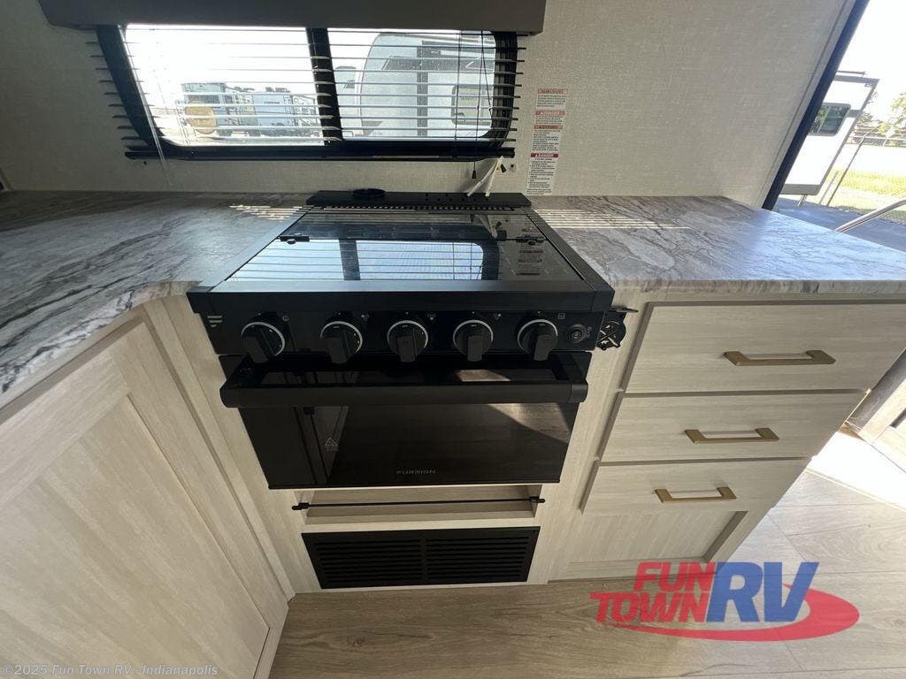 This dual entry, front kitchen travel trailer is perfect for three to four campers. You will have a rear private bedroom with a walk-around queen bed, dual wardrobes, TV prep, plus your own exterior entry door. Your guests can sleep on the booth dinette within the slide out, or you can choose the optional tri-fold sofa with a removable table. Preparing meals each day will be a breeze in the front kitchen that includes ample counter space, a residential range top with a glass cover, plus a spacious walk-in pantry. There is also an outside kitchen with a refrigerator, an 18' power awning with LED lights, and a pass-through storage for camp gear!