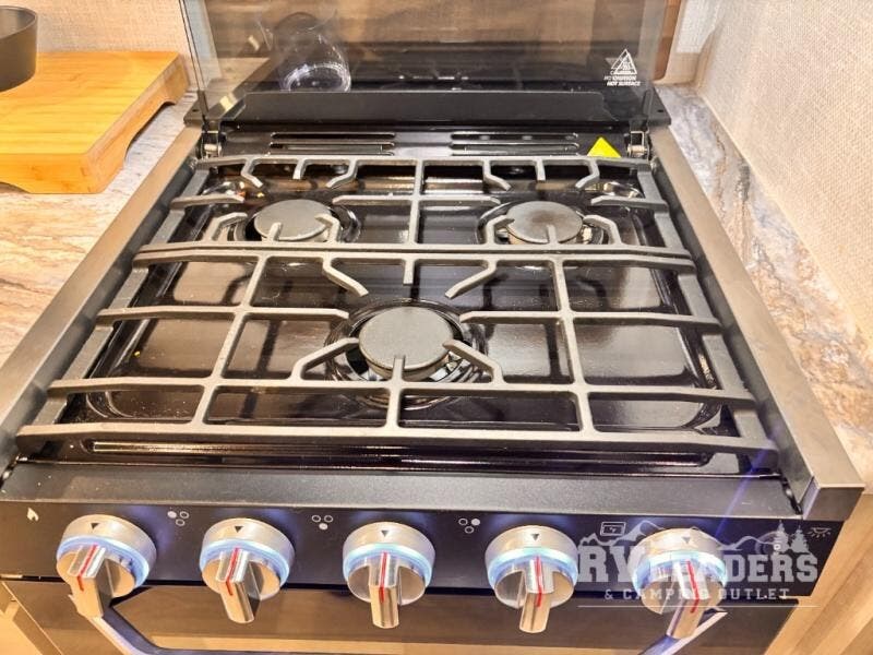 Whether you're camping with friends or family, you'll love the space and comfort found in this travel trailer. The outside kitchen is packed with features, such as a gas griddle, sink, refrigerator, and a shelf, plus there is a 21' electric awning for shade. Head inside to relax on the tri-fold sofa, or play a game at the booth dinette. You will also love the HD TV for your favorite shows at night. This model includes a full rear bath with a linen closet for clean towels and an upgraded slow-close shower door.