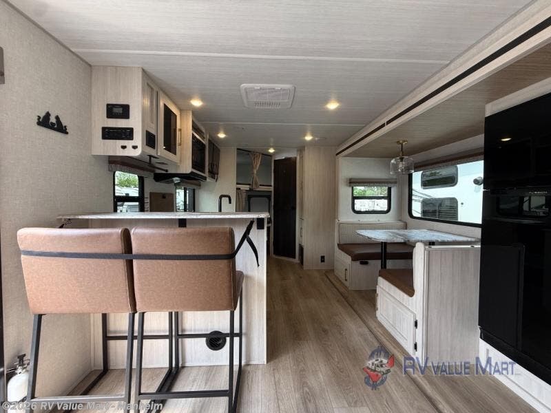 Every trip to the campground will be spent in comfort with this single slide out travel trailer. Once you arrive at the site, remove the kayaks or bikes from the rear storage door, start lunch on the outside kitchen, and put out the 15' power awning with LED lights. The interior includes a booth dinette slide with storage, a bar top with stools, plus an HD TV for movie nights. After a day of fun, head to the front private bedroom for a great night's rest on the queen bed, and you can store your belongings in the dual bedroom wardrobes!