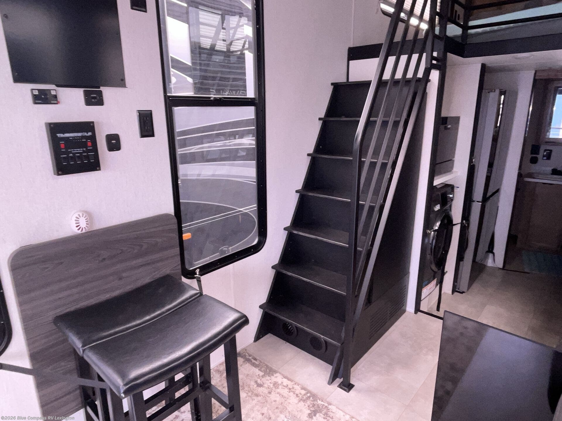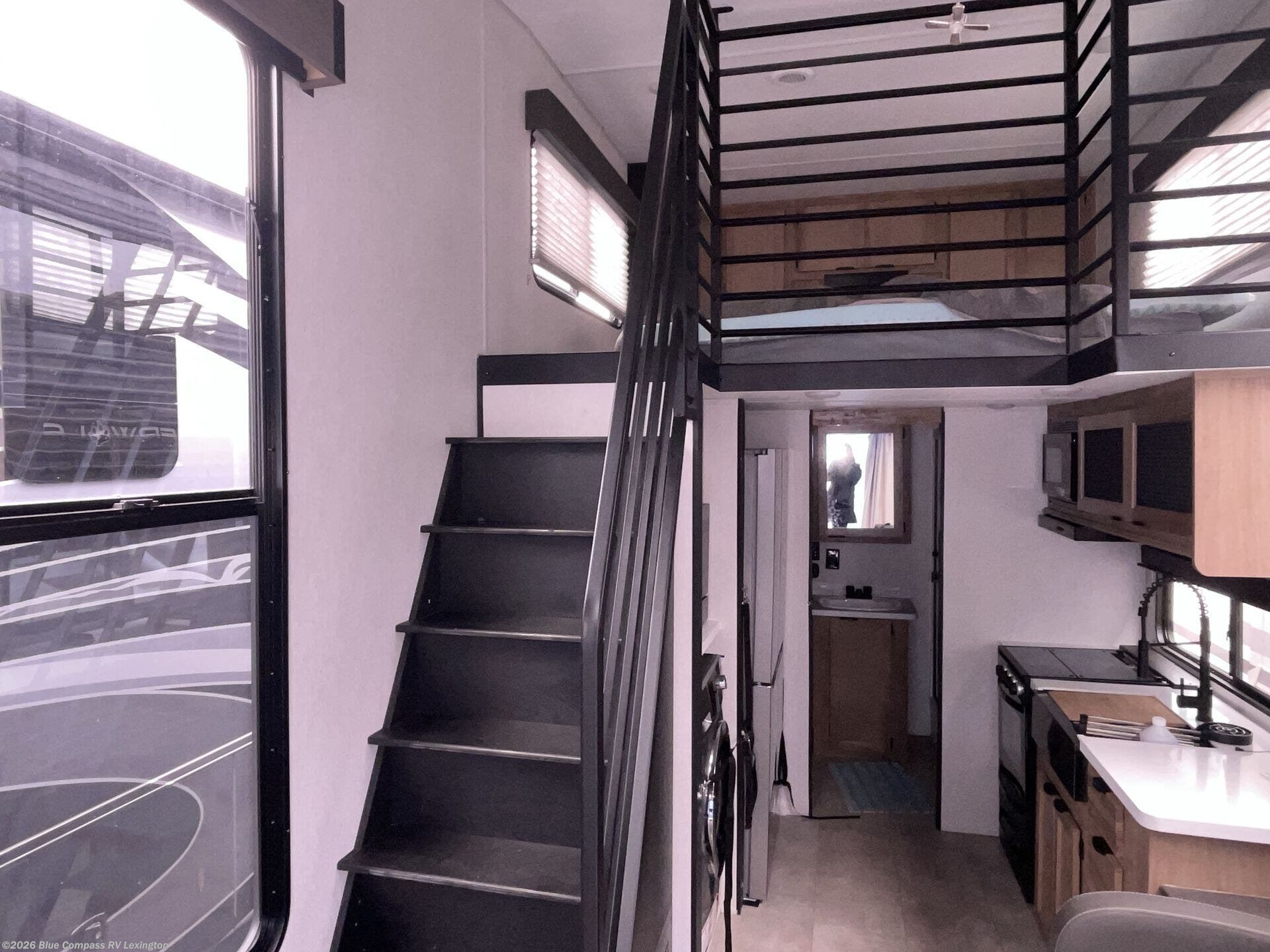 You will fall in love with this mini-loft Timberwolf that will feel more like a tiny home. There are steps leading up to the loft with a queen bed, cabinets, and even a fireplace! The kitchen includes a cooktop and a microwave oven to prepare meals, plus a refrigerator to keep perishables fresh. You'll enjoy relaxing on the 58" sofa, dining at the high top table, or reading a book on the lounge chair. There is also a rear deck with patio doors where you can spend your evenings together, and there is even a second loft above the deck for added sleeping or storage space!