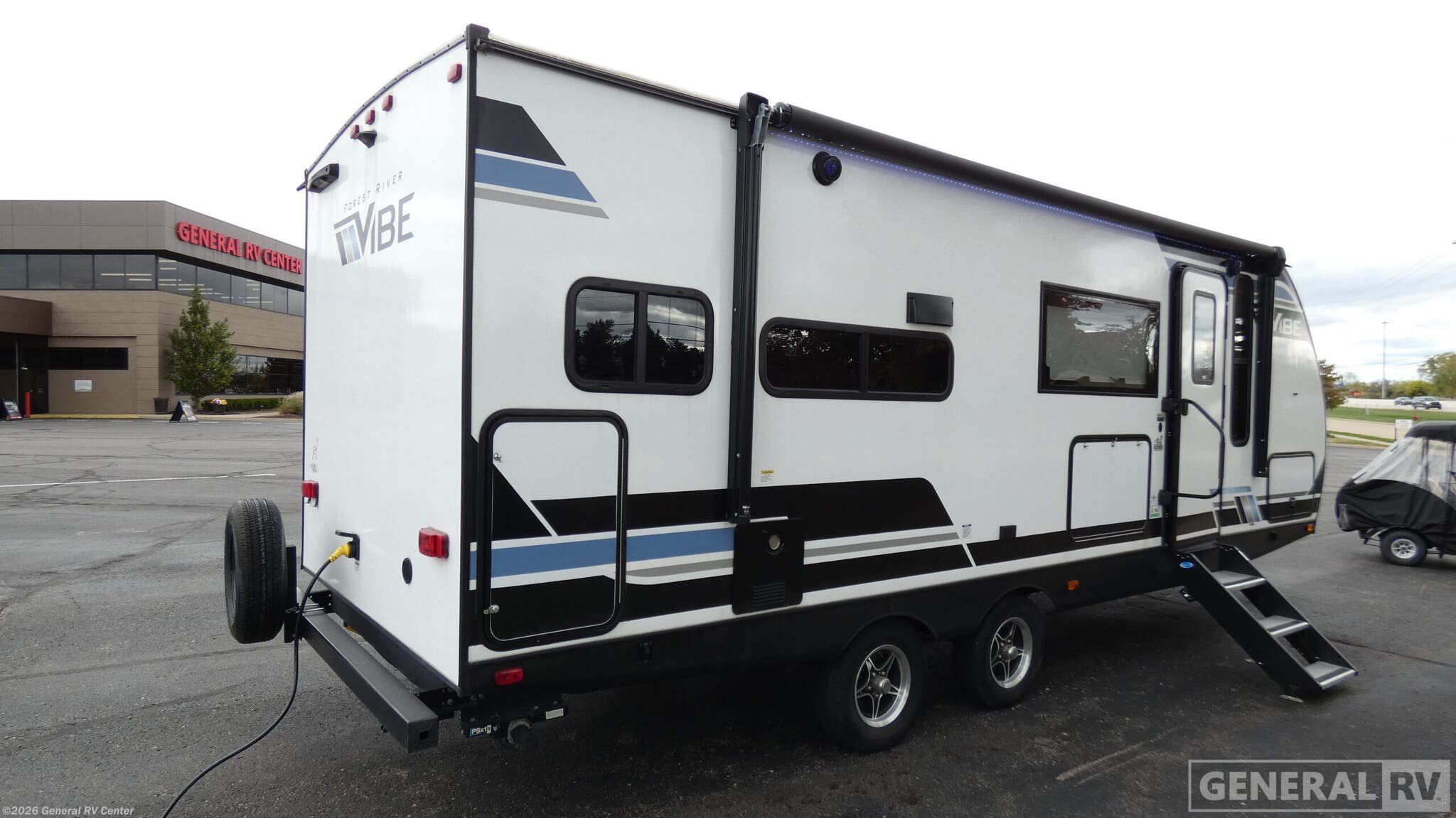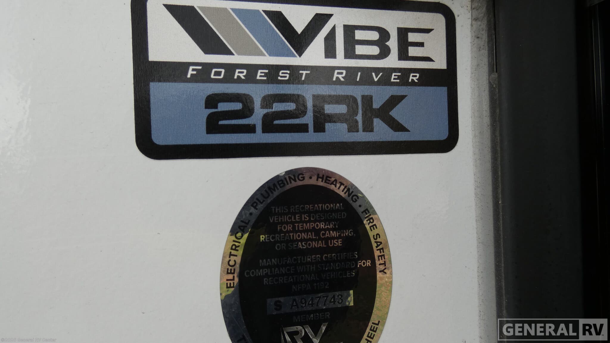 Discover the 2024 Forest River Vibe 22RK, where modern design meets cozy comfort. This travel trailer is perfect for couples seeking adventure with its thoughtfully designed floorplan that maximizes space and convenience. The rear kitchen is a culinary enthusiast's dream, complete with a convection microwave and a full-size electric refrigerator, ensuring you have everything you need to whip up delicious meals on the go. The center living area boasts plush theater seating, creating a perfect spot to relax and unwind after a day of exploration. The private bedroom features a comfortable queen bed, offering a restful retreat, while ample wardrobe space ensures you have room for all your essentials. With an 18-foot powered retractable awning, outdoor living is just as inviting, providing shade and comfort as you enjoy the great outdoors. Plus, the Vibe 22RK is pet-friendly, ensuring your furry friends can join in on the fun. With its sleek design and practical features, this RV is ready to take you on unforgettable journeys. For more information, visit your nearest General RV Dealership Location.
