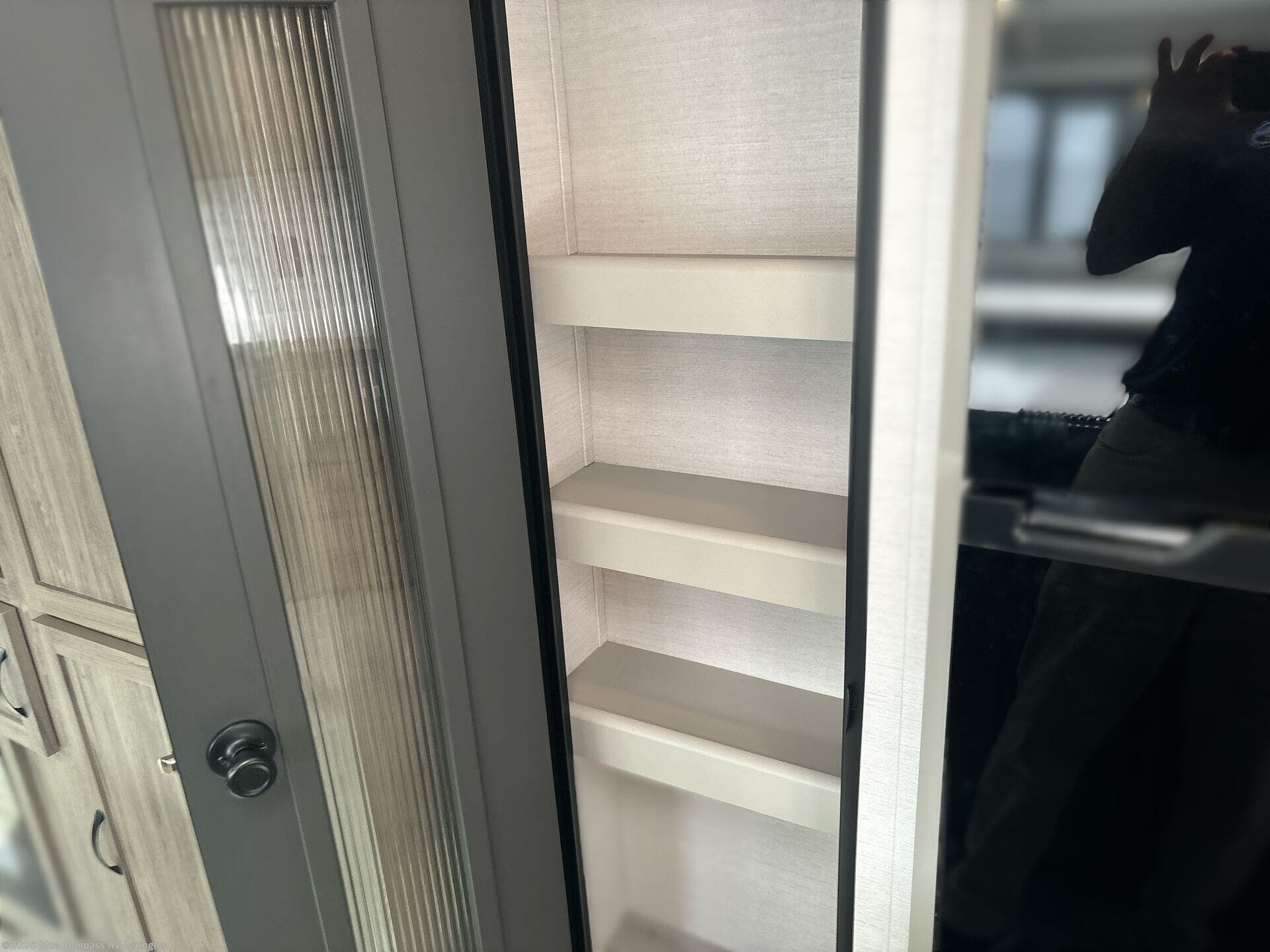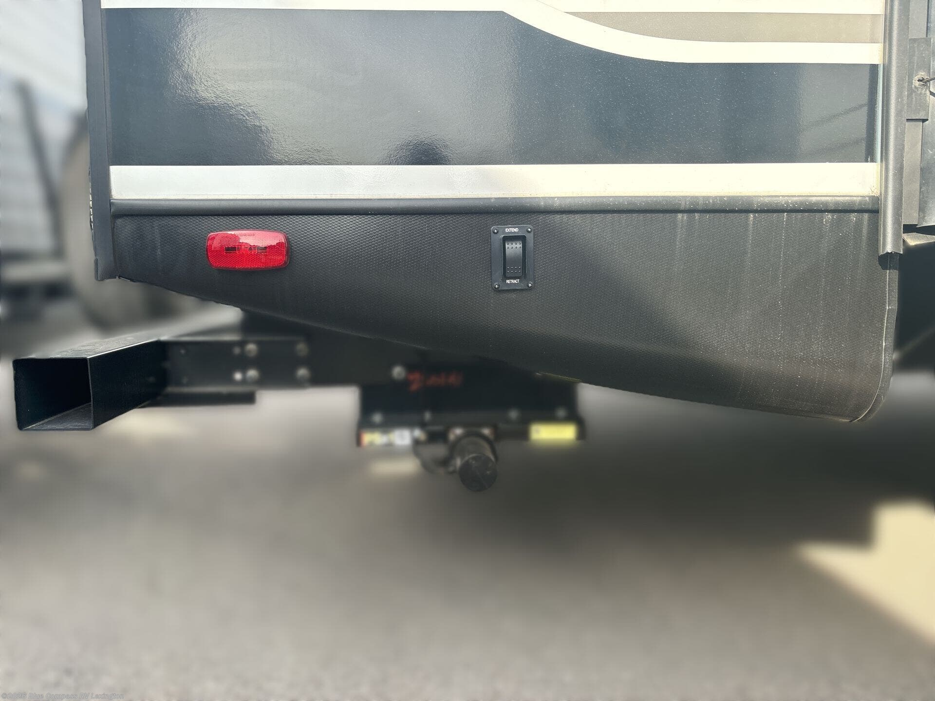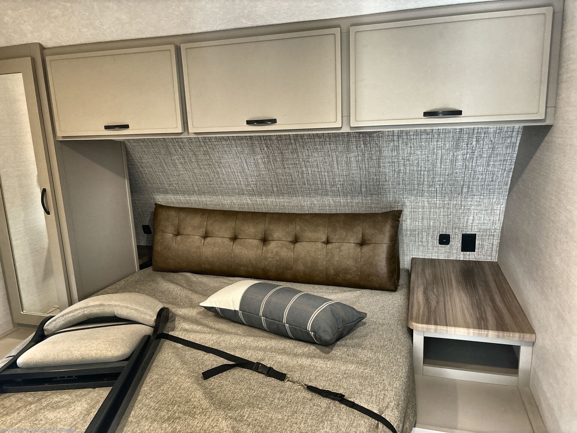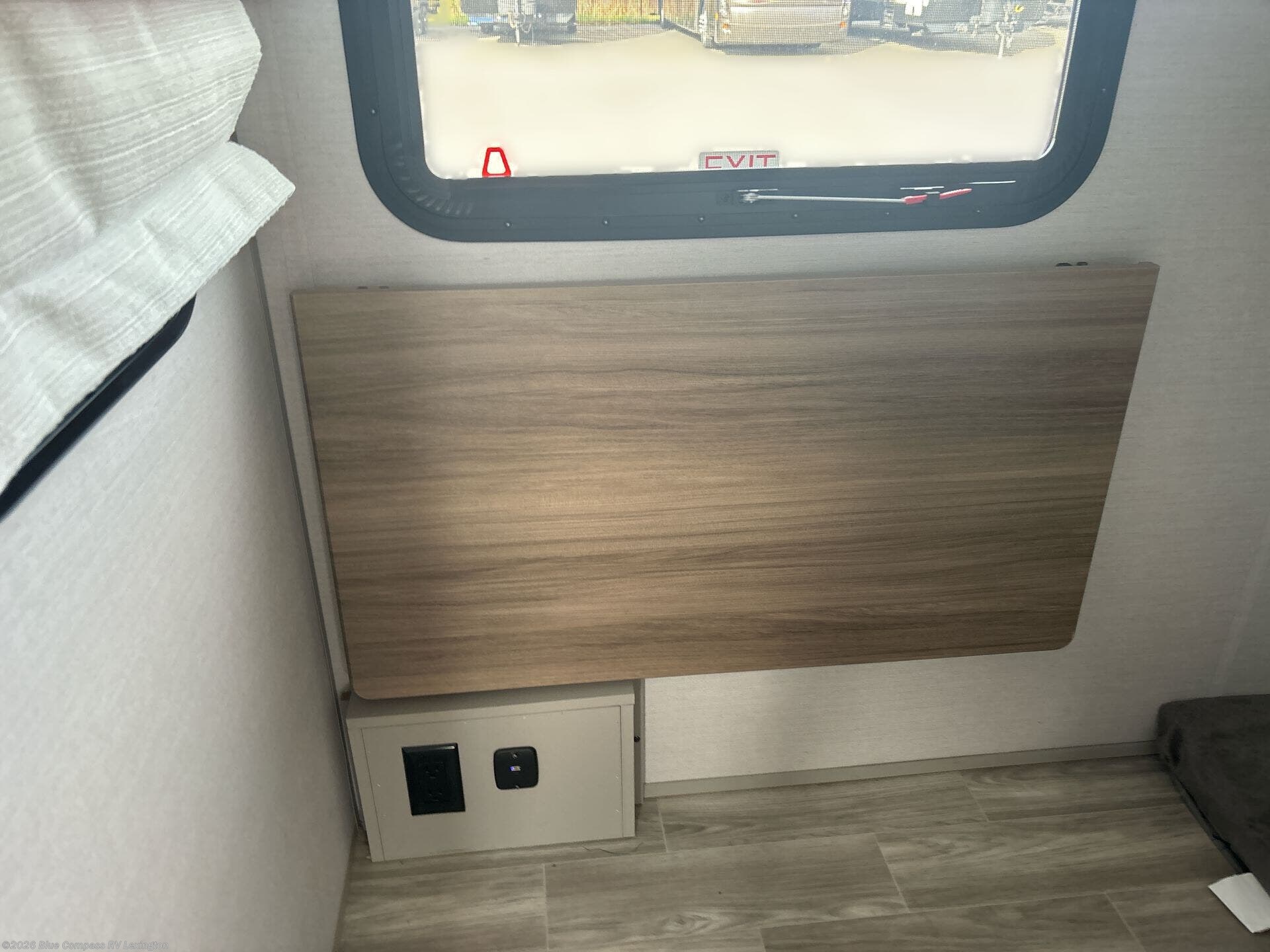 You'll love just about everything in this spacious travel trailer that can sleep four each night! The rear bar top with four stools is sure to be a favorite place to visit together, plus there is a skylight above to let natural light in. You'll find a second skylight above the kitchen island, and the full kitchen is every chef's dream with its generous counter space, residential refrigerator, pantry, and beverage cooler refrigerator! The private bunkhouse behind the entertainment center includes a flip-up bunk with a mattress pad below, shelves for storage, plus a desk with a chair if you want to turn this space into an office. You will enjoy your own space in the front private bedroom with a queen bed, two wardrobes, plus a nightstand with USB and CPAP prep. And don't overlook the exterior with its 200-watt solar panel, Sure-Step entry steps, two power awnings, and large pass-thru storage for camp gear!