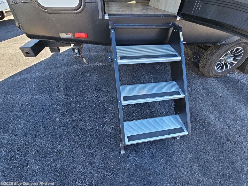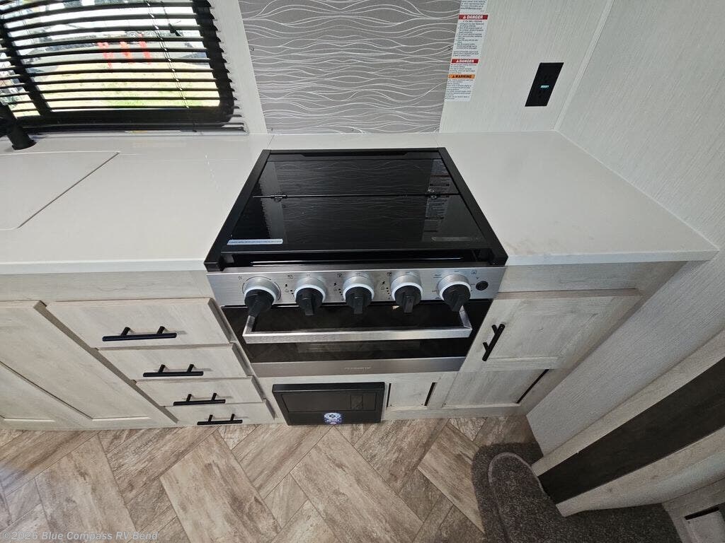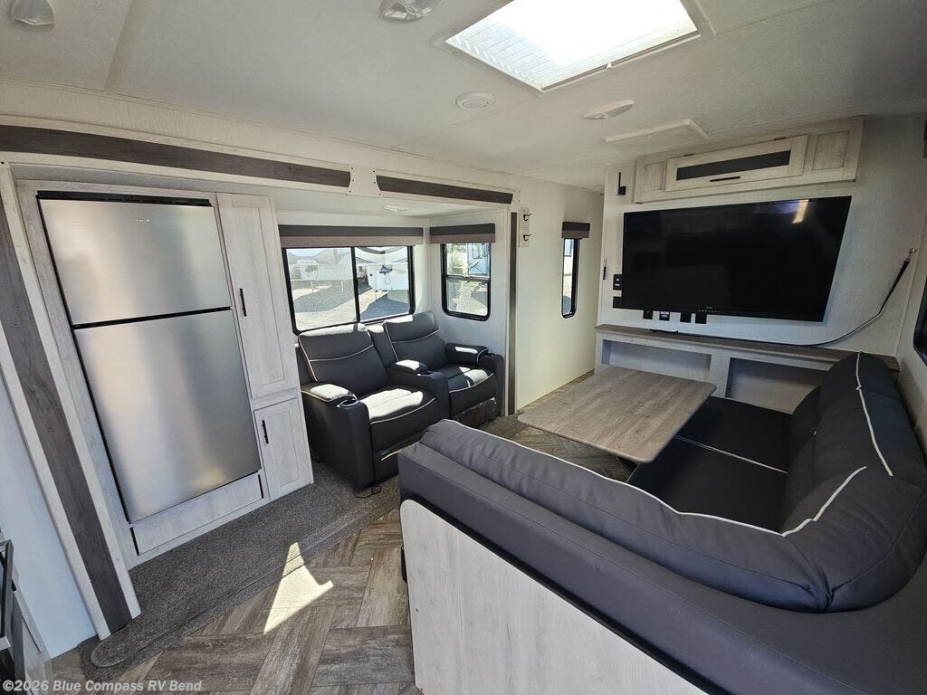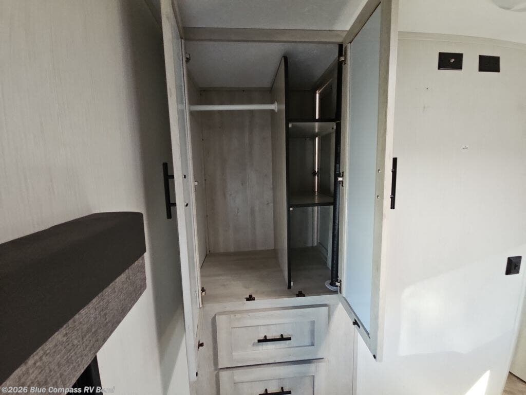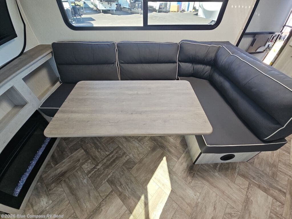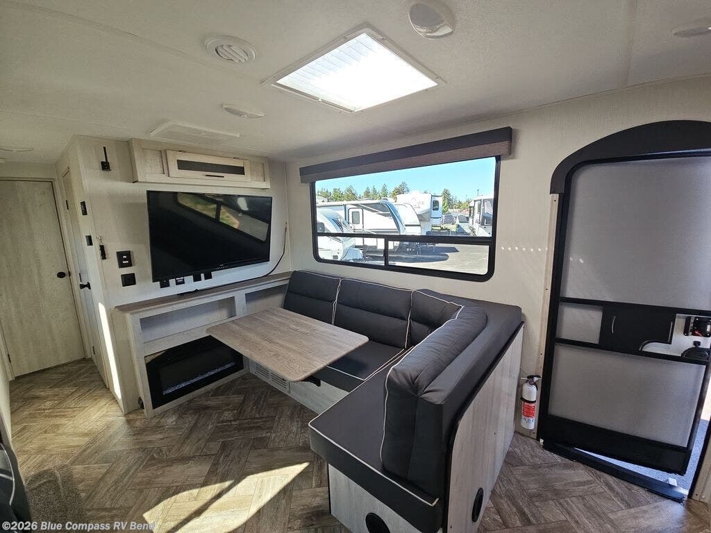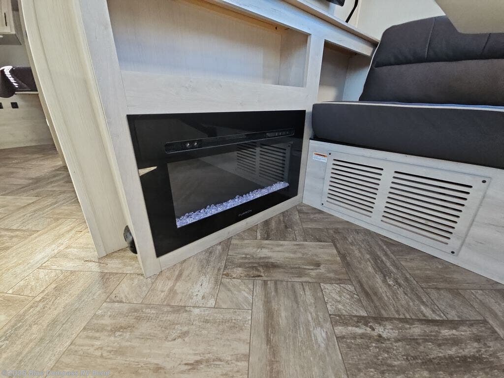Eat, sleep, relax, and play in this feature-packed travel trailer. The rear kitchen includes generous counter space with a huge window for a great outdoor view, and your guests can gather around the fold-down party lounge once lunch is served. There is also an LED HDTV here and a cozy fireplace. The full bath will allow everyone to clean up each day, and the front private bedroom will feel just like home. Here, you'll enjoy a Maxx king bed with wardrobes on either side of the bed plus a third wardrobe with two drawers for plenty of storage space!