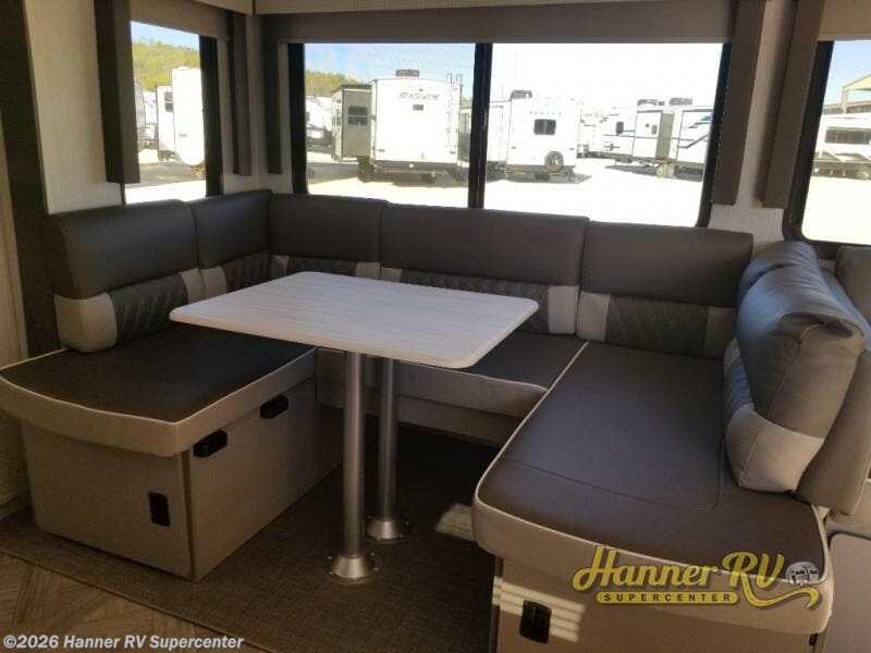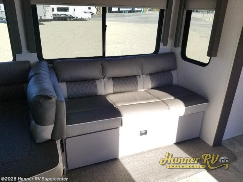 Sleeping for up to six with a custom king bed in the private front bedroom, and a versa-lounge and U-shaped dinette which can both be transformed into added sleeping when needed. You will love the added space thanks to the large slide and the view through the large panoramic windows will bring the outdoors inside! Cooking will be easy either indoors our out with an exterior camp kitchen situated under the 20' awning. Inside, two pantries and an oversized fridge will hold all of your food, both dry and canned goods plus perishables will be kept fresh. The front private bedroom is where you will find the custom king-sized Versa Tilt bed. There is also a walk-in closet as well as two nightstands and two upper shirt closets for your clothing and other personal belongings. A nice sized walk-in shower in the back of this unit, plus linen cabinet and extra wardrobe will keep everyone feeling clean and refreshed. On the outside of this unit, you will find more storage in the front pass-through compartment which is great for outdoor games and gear.