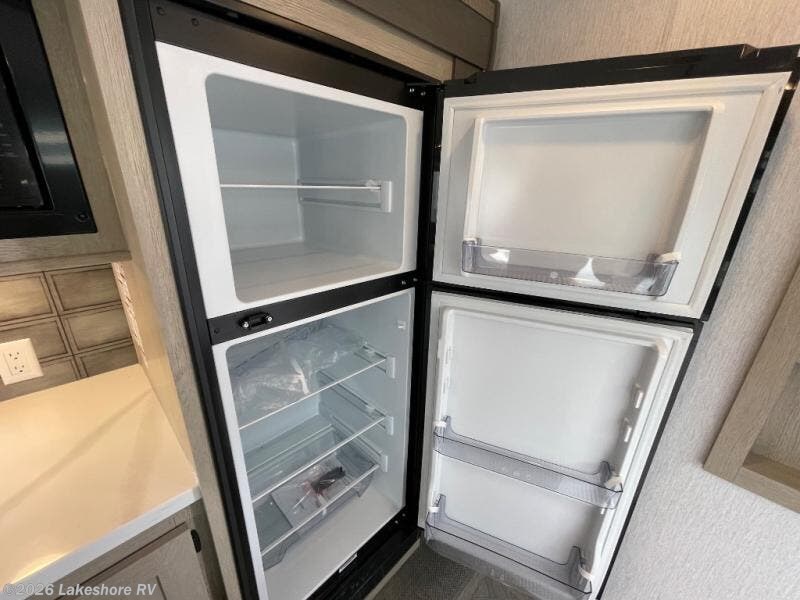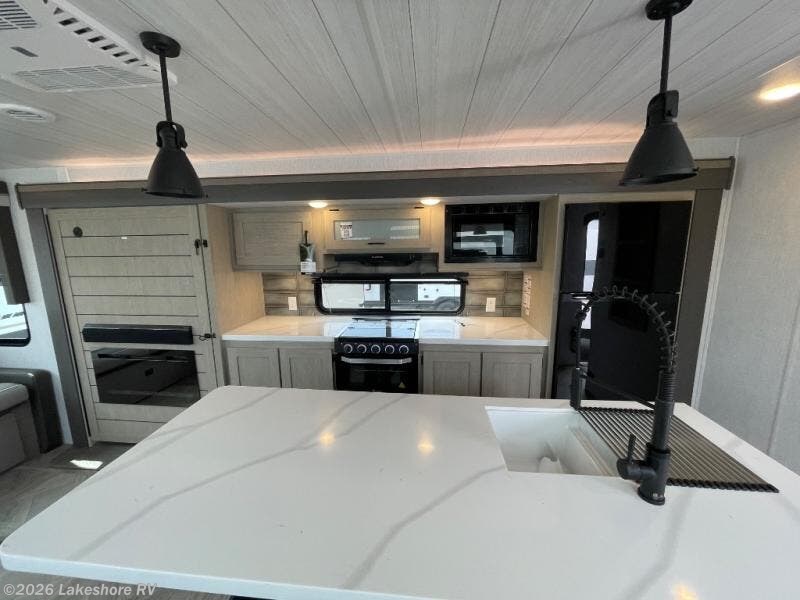 The perfect couple's coach with a view! This Wildwood View features a 7' kitchen island and five bar stools for dining and prep space. The island also houses a double kitchen sink for easy clean-up. Thanks to the island, you will enjoy 15 linear feet of countertop space throughout. The view will be of your choosing thanks to 95.5 square feet of windows that will easily bring the outdoors inside. A sectional sofa across the back of the unit provides ample seating to relax and enjoy a good book or the entertainment center. Behind the entertainment center, you will find hidden storage space with shelves so everything can be tucked out of sight, and an oversized refrigerator will provide enough space for your perishables while you are on vacation as well. A full bath is conveniently located near the main entry featuring StepAbove entry steps leading inside. The bath provides a walk-in shower, vanity with sink, toilet, and linen storage. In the private front bedroom, a Versa-Tilt custom king bed will allow you a relaxing and comfortable night's rest, and once again, a great view out the dual opposing windows. On the outside, a 23' awning offers additional living space protected from the elements, and a spacious pass-through storage compartment will allow you to stow away your camp chairs and outdoor equipment and games easily for transport.