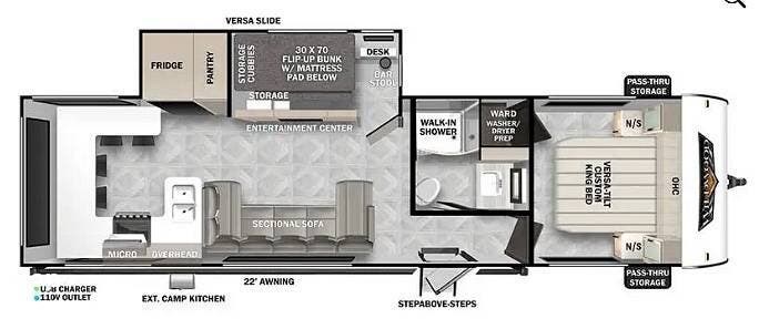 The Wildwood is equipped with a tankless water heater, washer / dryer hookup, solar charging, 50 amp service and two air conditioning units.