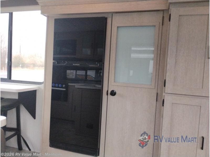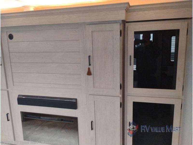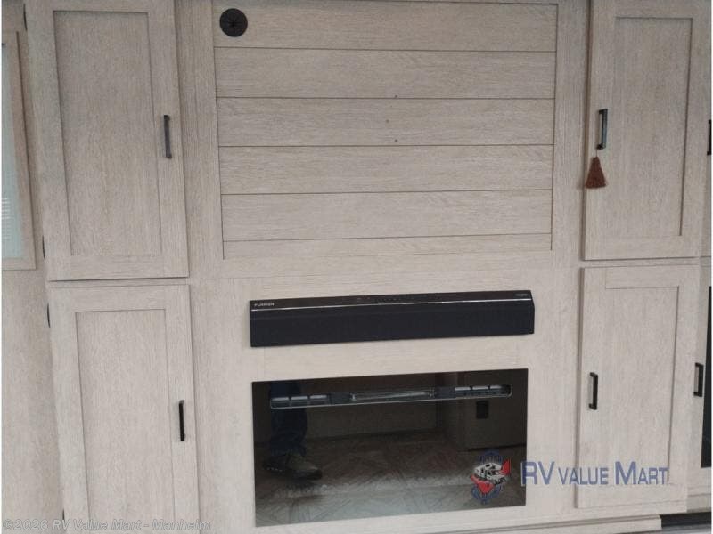 Your family of four or will enjoy this Wildwood View bunk model featuring 105 square feet of window space for unbelievable views of your surroundings. The Versa Slide features a refrigerator, pantry, and entertainment center with a door leading to a bunk space including a 30" x 70" flip-up bunk with a mattress pad below, storage cubbies for your things, and a desk with bar stool for any office work that you may need to do while you travel. All is neatly tucked away within the slide behind an entertainment wall with fireplace opposite the sectional sofa which is great for relaxing and entertaining family and friends indoors. The rear kitchen area offers 18 linear feet of countertop space with four bar stools, plus a three burner range and double sink. Your refrigerator and pantry will hold all of your perishables and dry goods, and those are nearby within the Versa slide. Up front, a private bedroom with Versa-Tilt custom king bed which provides 14-1/2" of additional walking around space, plus you will find a wardrobe that has been prepped for a washer and dryer if you choose to add, as well as dual nightstands beneath wardrobes on either side of the bed. A large pass-through storage compartment offers plenty of storage for your outdoor gear, and if you enjoy outdoor cooking, you might want to add the outside kitchen option as well.