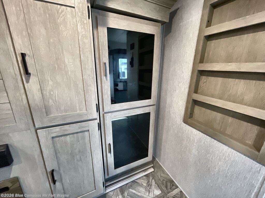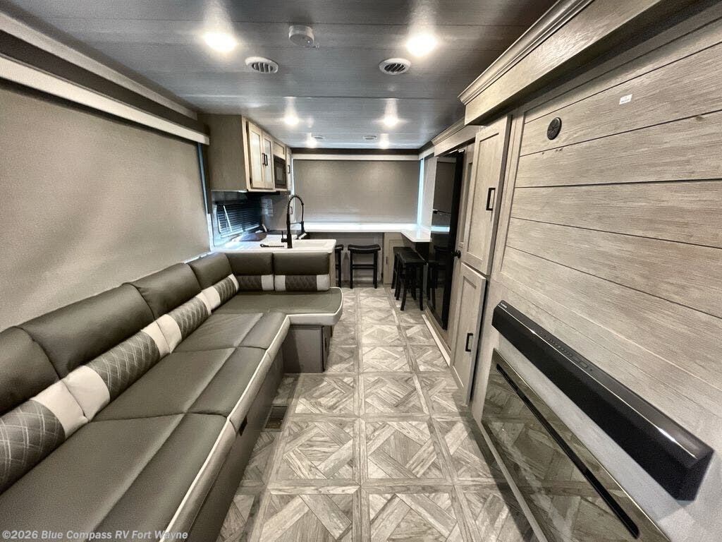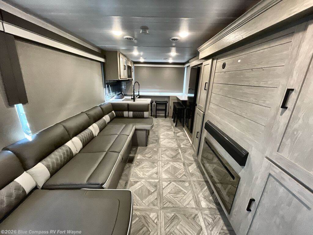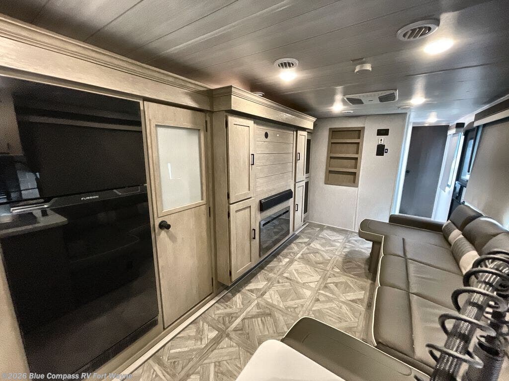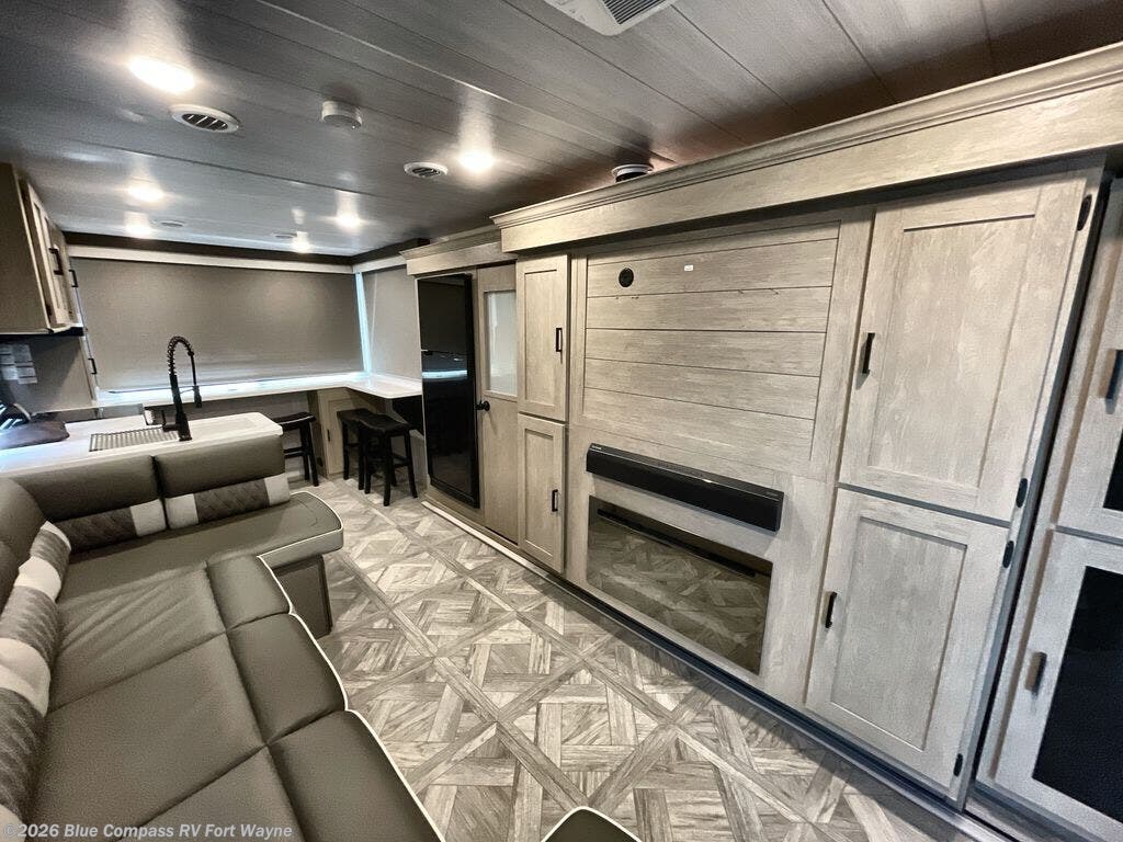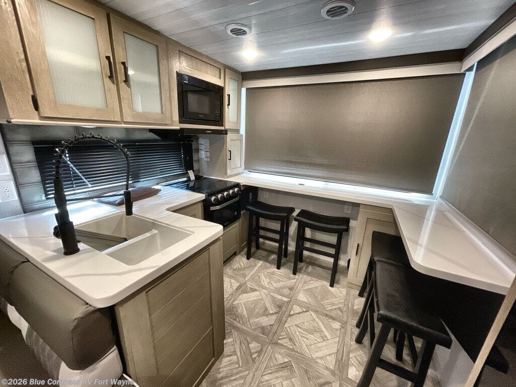 Your family of four or will enjoy this Wildwood View bunk model featuring 105 square feet of window space for unbelievable views of your surroundings. The Versa Slide features a refrigerator, pantry, and entertainment center with a door leading to a bunk space including a 30" x 70" flip-up bunk with a mattress pad below, storage cubbies for your things, and a desk with bar stool for any office work that you may need to do while you travel. All is neatly tucked away within the slide behind an entertainment wall with fireplace opposite the sectional sofa which is great for relaxing and entertaining family and friends indoors. The rear kitchen area offers 18 linear feet of countertop space with four bar stools, plus a three burner range and double sink. Your refrigerator and pantry will hold all of your perishables and dry goods, and those are nearby within the Versa slide. Up front, a private bedroom with Versa-Tilt custom king bed which provides 14-1/2" of additional walking around space, plus you will find a wardrobe that has been prepped for a washer and dryer if you choose to add, as well as dual nightstands beneath wardrobes on either side of the bed. A large pass-through storage compartment offers plenty of storage for your outdoor gear, and if you enjoy outdoor cooking, you might want to add the outside kitchen option as well.