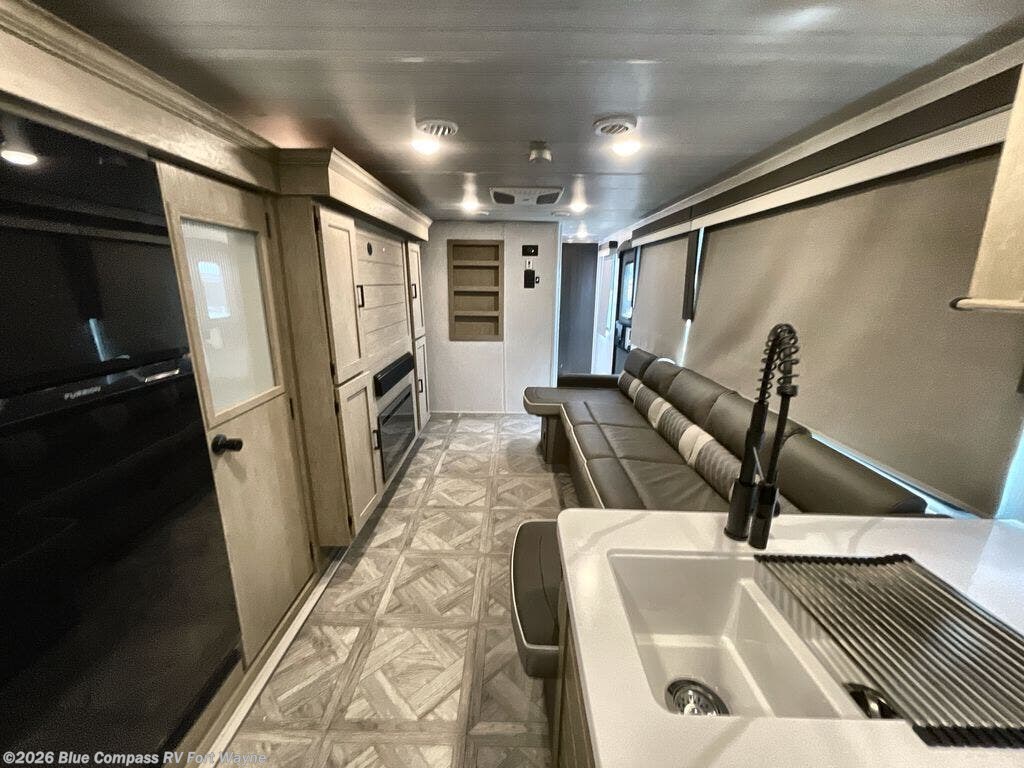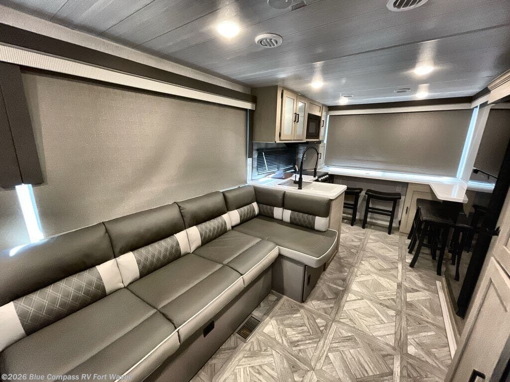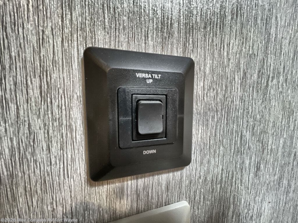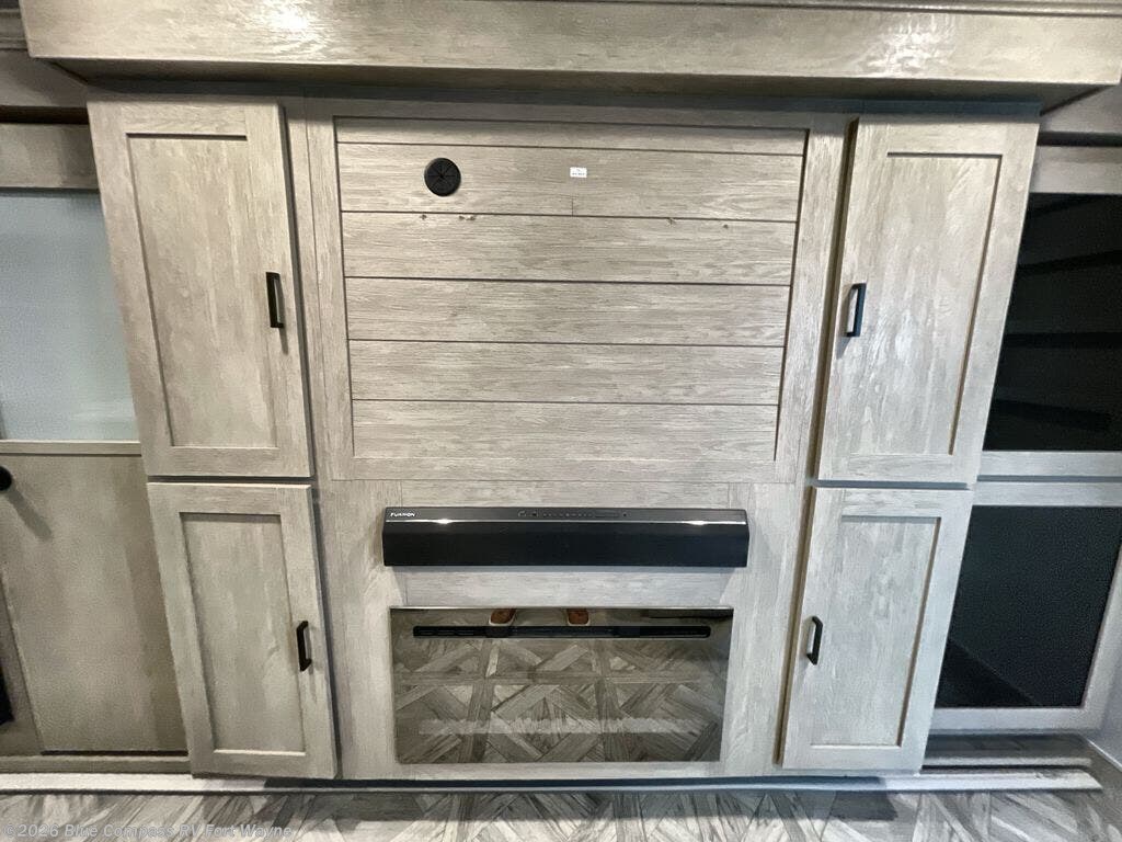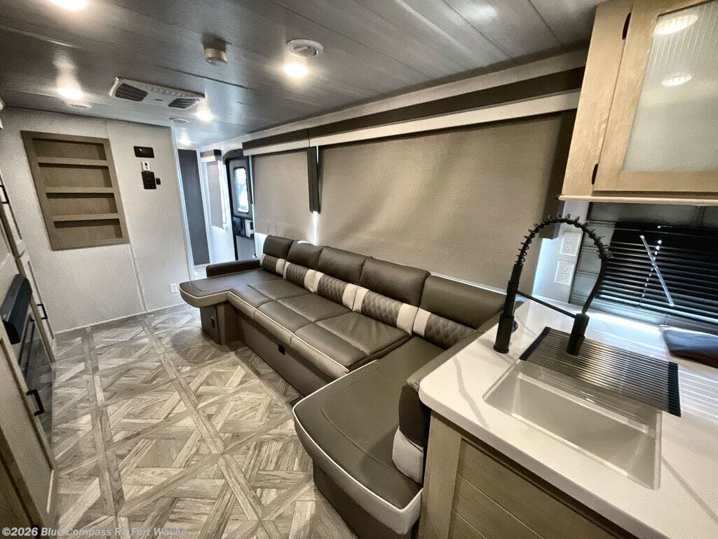 Your family of four or will enjoy this Wildwood View bunk model featuring 105 square feet of window space for unbelievable views of your surroundings. The Versa Slide features a refrigerator, pantry, and entertainment center with a door leading to a bunk space including a 30" x 70" flip-up bunk with a mattress pad below, storage cubbies for your things, and a desk with bar stool for any office work that you may need to do while you travel. All is neatly tucked away within the slide behind an entertainment wall with fireplace opposite the sectional sofa which is great for relaxing and entertaining family and friends indoors. The rear kitchen area offers 18 linear feet of countertop space with four bar stools, plus a three burner range and double sink. Your refrigerator and pantry will hold all of your perishables and dry goods, and those are nearby within the Versa slide. Up front, a private bedroom with Versa-Tilt custom king bed which provides 14-1/2" of additional walking around space, plus you will find a wardrobe that has been prepped for a washer and dryer if you choose to add, as well as dual nightstands beneath wardrobes on either side of the bed. A large pass-through storage compartment offers plenty of storage for your outdoor gear, and if you enjoy outdoor cooking, you might want to add the outside kitchen option as well.