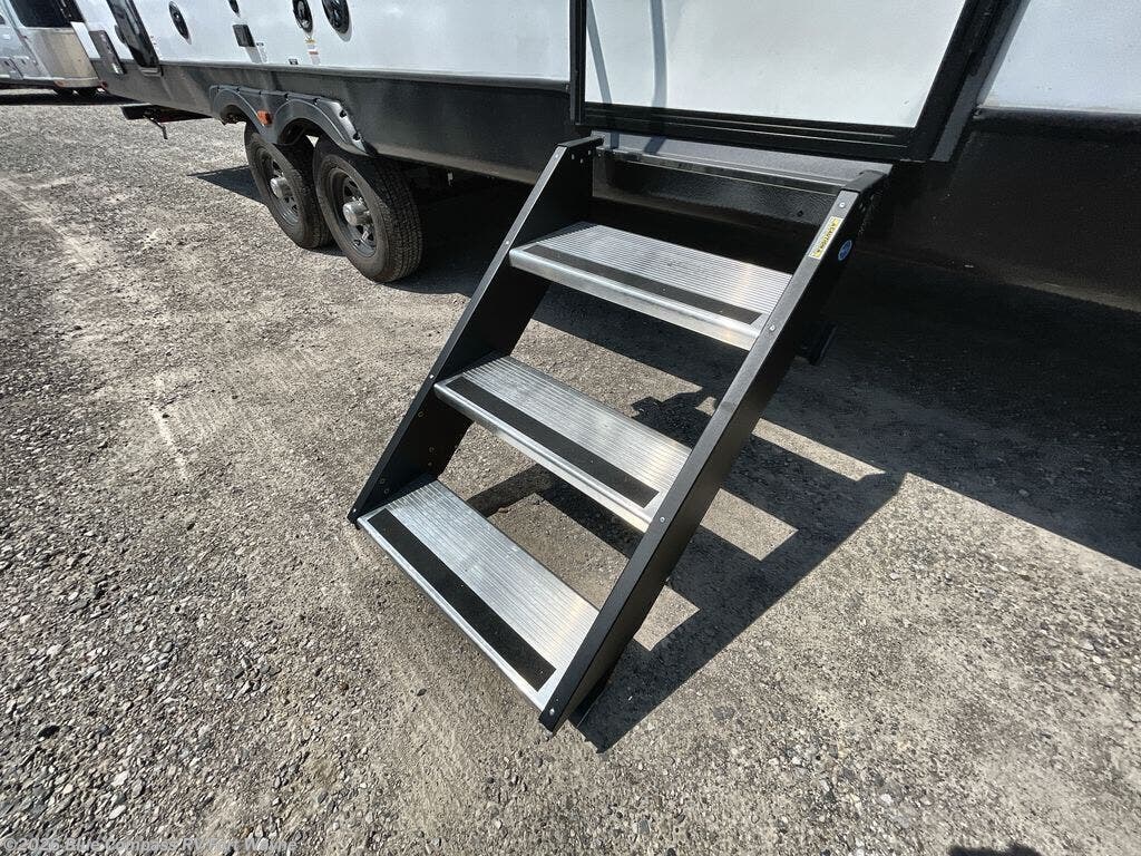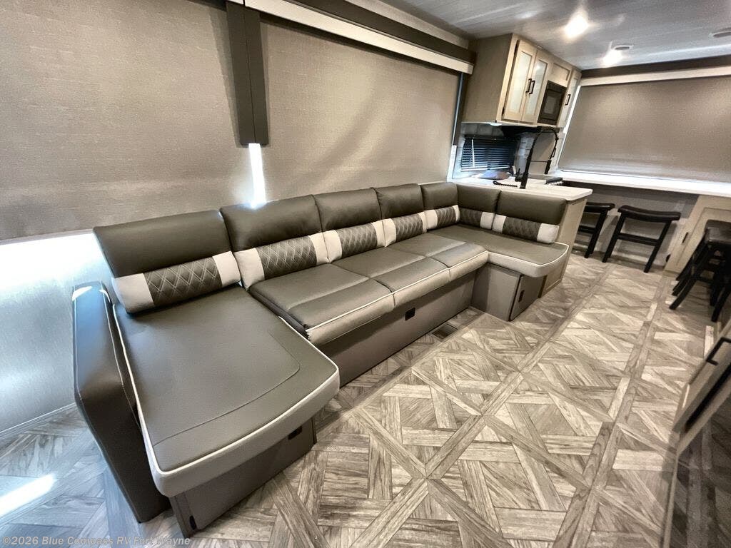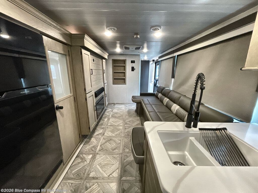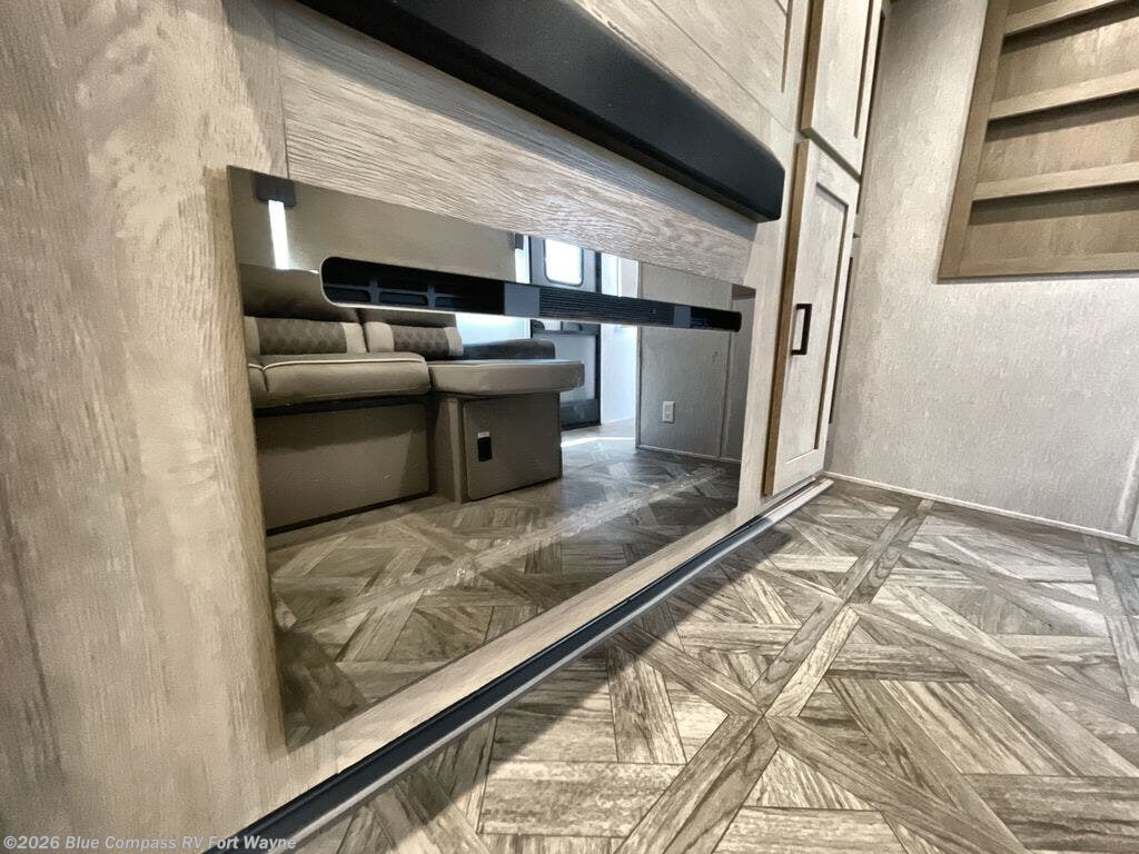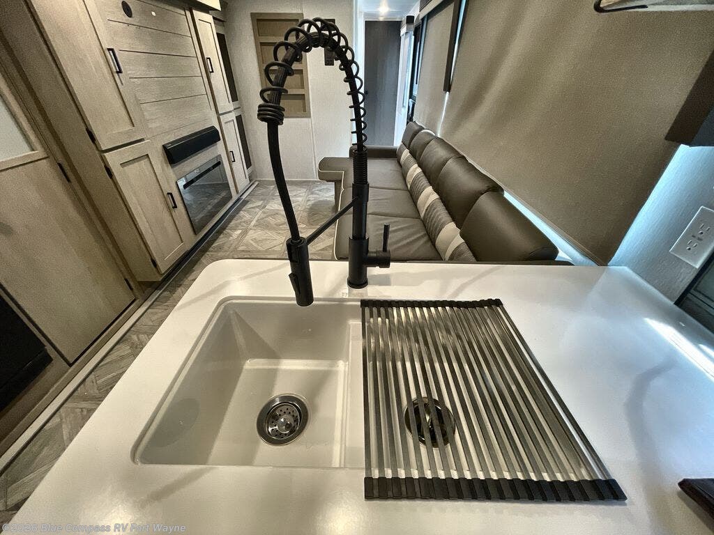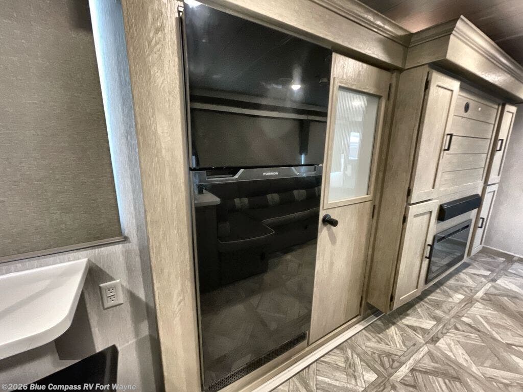 Your family of four or will enjoy this Wildwood View bunk model featuring 105 square feet of window space for unbelievable views of your surroundings. The Versa Slide features a refrigerator, pantry, and entertainment center with a door leading to a bunk space including a 30" x 70" flip-up bunk with a mattress pad below, storage cubbies for your things, and a desk with bar stool for any office work that you may need to do while you travel. All is neatly tucked away within the slide behind an entertainment wall with fireplace opposite the sectional sofa which is great for relaxing and entertaining family and friends indoors. The rear kitchen area offers 18 linear feet of countertop space with four bar stools, plus a three burner range and double sink. Your refrigerator and pantry will hold all of your perishables and dry goods, and those are nearby within the Versa slide. Up front, a private bedroom with Versa-Tilt custom king bed which provides 14-1/2" of additional walking around space, plus you will find a wardrobe that has been prepped for a washer and dryer if you choose to add, as well as dual nightstands beneath wardrobes on either side of the bed. A large pass-through storage compartment offers plenty of storage for your outdoor gear, and if you enjoy outdoor cooking, you might want to add the outside kitchen option as well.