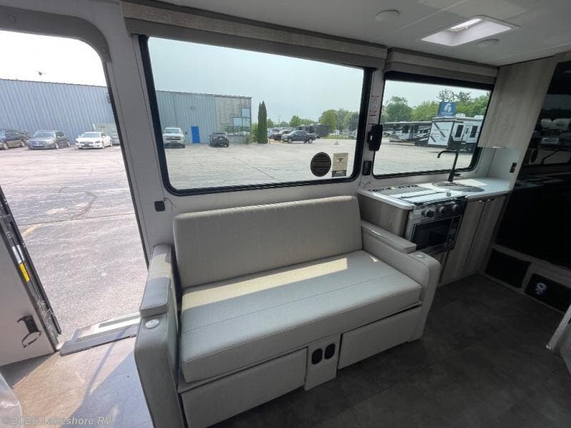 Perfect for your family, this single slide with split bunk and queen bed provides your family comfortable sleeping for four, and the slide adds a bit more interior space in camp. The split bunk is located behind the spice rack door and TV for your entertainment and cooking needs. Speaking of cooking, you can prepare your best home cooked meals with the cooktop, and store any leftovers in the dual swinging 12V refrigerator. Relax each night in the theater seating and freshen up in the rear corner bathroom each morning which features a skylight over the shower for more natural lighting. If you wish to go off grid then you can add the optional solar extended 200W power package!