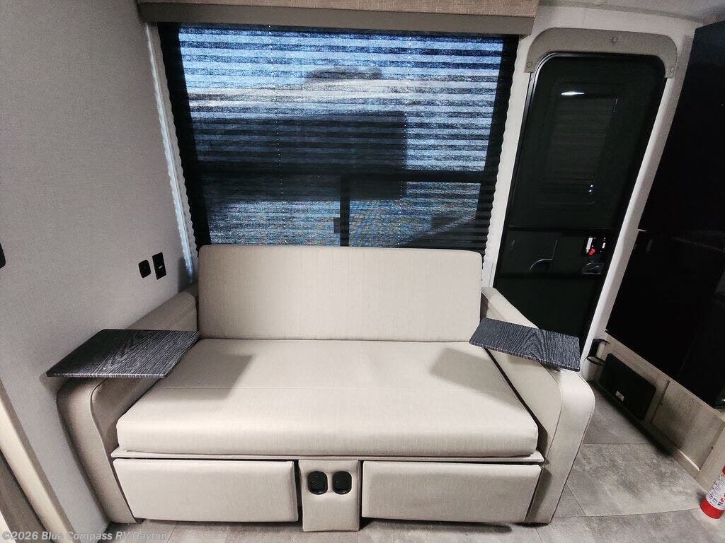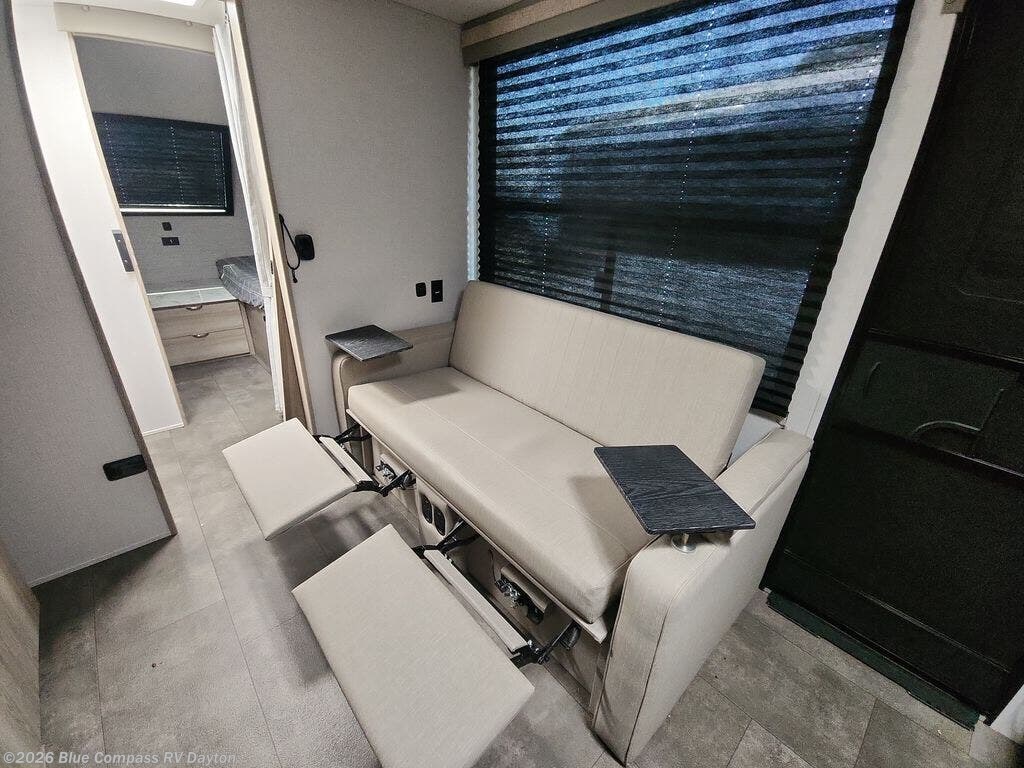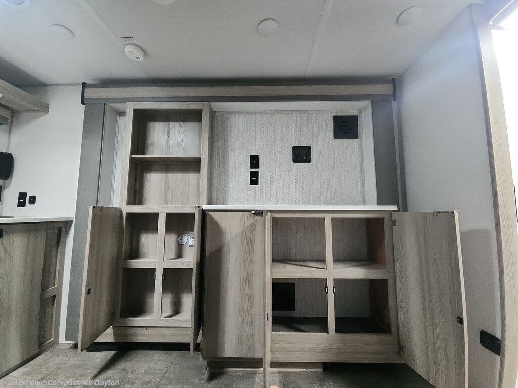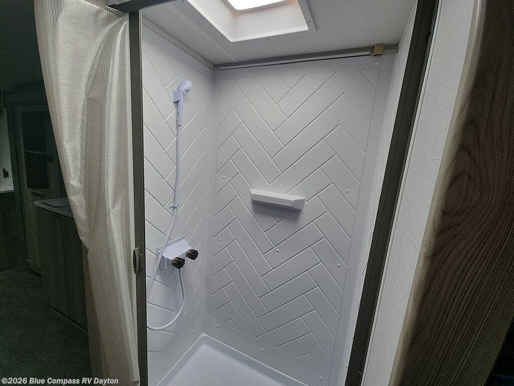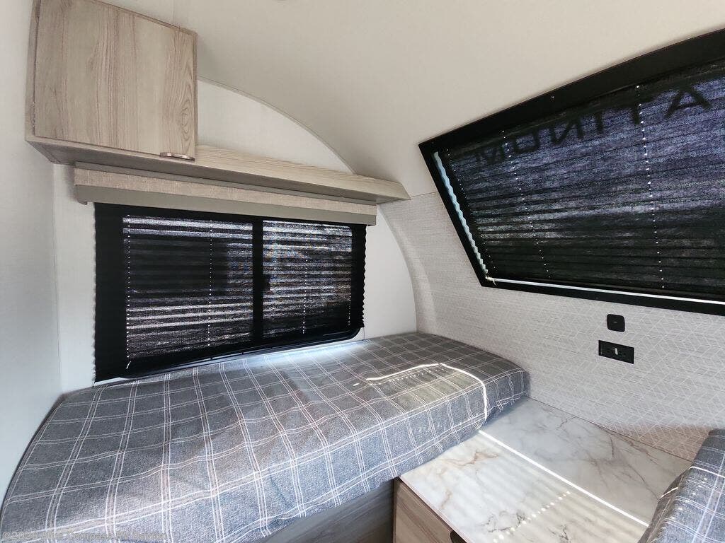 Perfect for your family, this single slide with split bunk and queen bed provides your family comfortable sleeping for four, and the slide adds a bit more interior space in camp. The split bunk is located behind the spice rack door and TV for your entertainment and cooking needs. Speaking of cooking, you can prepare your best home cooked meals with the cooktop, and store any leftovers in the dual swinging 12V refrigerator. Relax each night in the theater seating and freshen up in the rear corner bathroom each morning which features a skylight over the shower for more natural lighting. If you wish to go off grid then you can add the optional solar extended 200W power package!