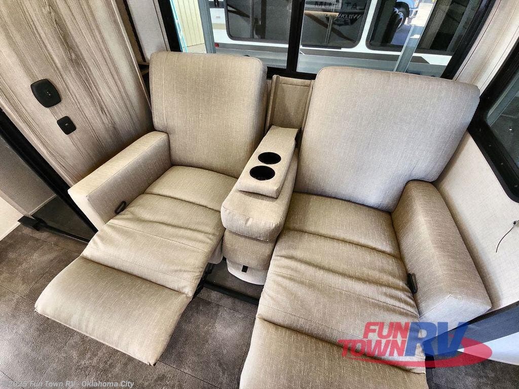 This toy hauler has a versatile layout allowing you to bring the max number of people or cargo. Switch the layout completely from day to night as the sofa converts to a Murphy bed. At the rear you'll find a full bath including a shower with a skylight. A fully equipped kitchen includes a dual swinging 12V refrigerator, microwave, and pantry. The ramp door converts to a patio with a 1,500 lb. capacity so you can have a party any time you like! The 19' power awning completes the outdoor living area.