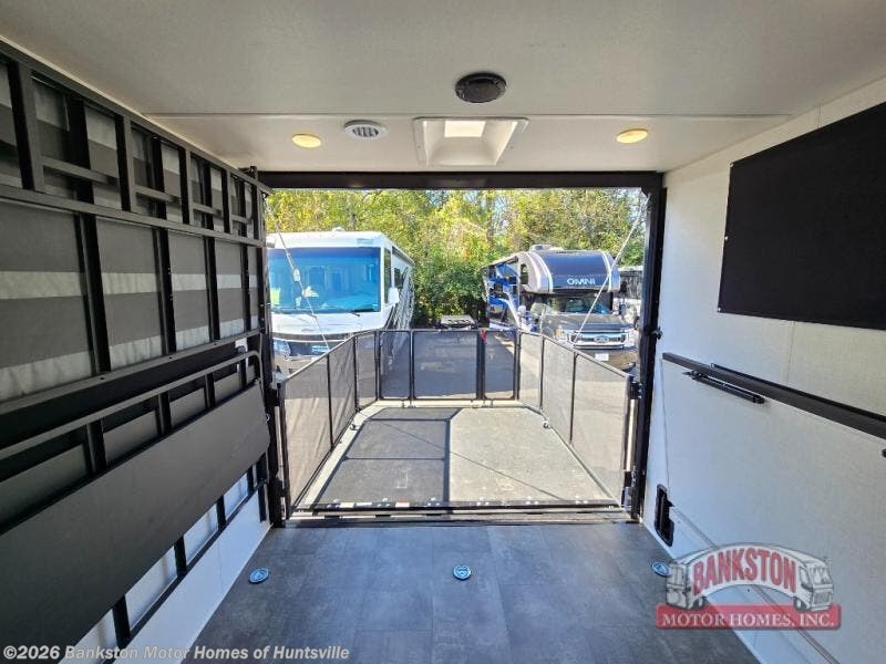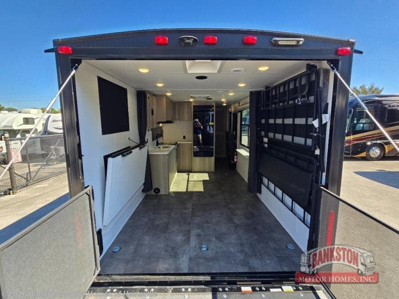 Sleeping for four, 13' of cargo space, and a raised rear ramp patio deck can only mean one thing, a whole lot of fun! Grab your gear and a couple of friends and head out for a camping weekend in the playground of your choice. Bring the quad, bikes, or take the kayaks to the lake and enjoy all sorts of fun. Unload your toys and gear and set up the double 30" x 72" sofas with a table between in the garage area for added seating during meals, games time, or just hanging out. The kitchen is fully equipped to keep everyone fueled for all the adventures you can create. A full bath with shower including a skylight for added natural light and headroom makes it easy to get cleaned up. Anyone waiting in line can certainly use the hot/cold shower outside to rinse off. When you are ready to sleep, the front private bedroom will be a welcome retreat and you will also find comfortable sleeping for two more with the 30" x 72" sleeper sofas folded down.