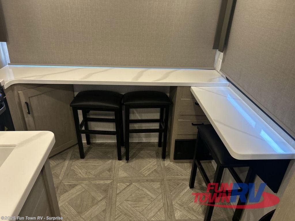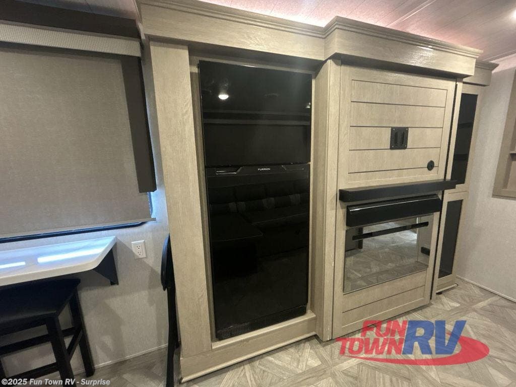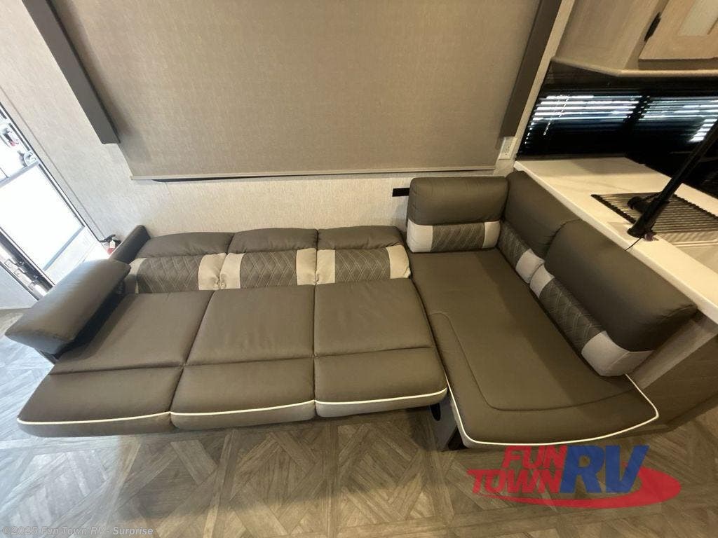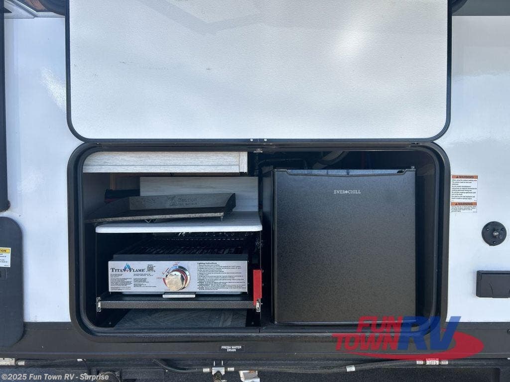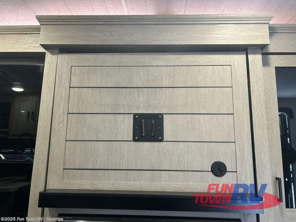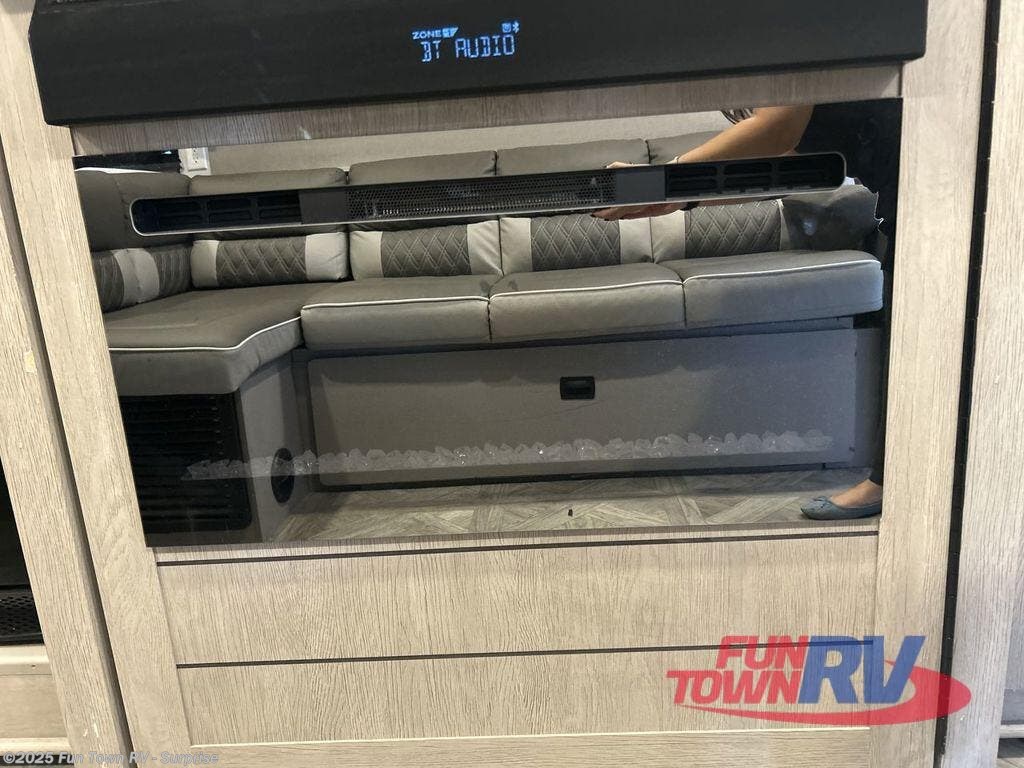 Enjoy your surroundings with 64 square feet of windows! So, no matter where you park, you can easily bring the outdoors right inside. The rear kitchen features 18 linear feet of wrap-around counter space including a double sink and a three burner cook-top with overhead microwave oven. There are bar stools for dining inside along the rear counter, and an L-shaped sofa for additional seating in the open living area. Here, behind the entertainment center, is a multi-purpose space hidden behind the shiplap feature wall insert with fireplace including a hinged top mattress above a lower bunk, a desk beneath the mattress if you need office space during the day, along with storage cubbies for your things, all within the Versa-Slide that also houses an oversized refrigerator for all of your perishables. The front private bedroom features a Versa-Tilt custom king bed with dual nightstands and closets, plus overhead storage. You will also find additional storage in a large pass-through beneath on the exterior, and the exterior camp kitchen is sure to be a big hit with the cook!