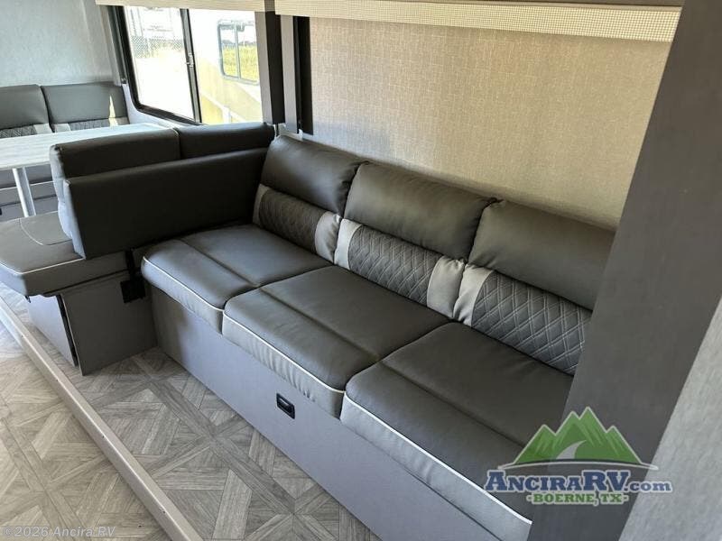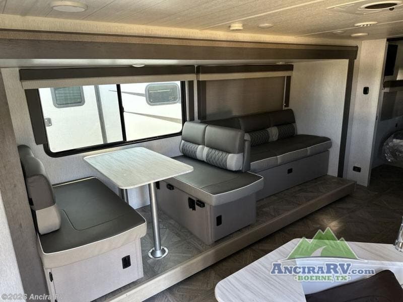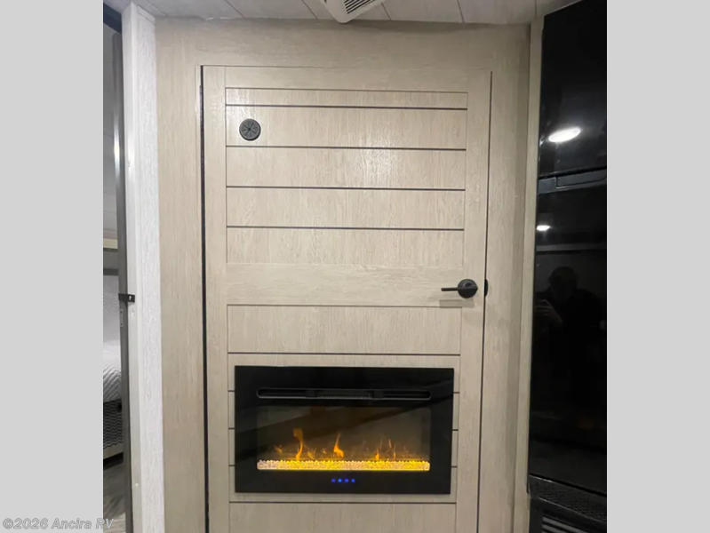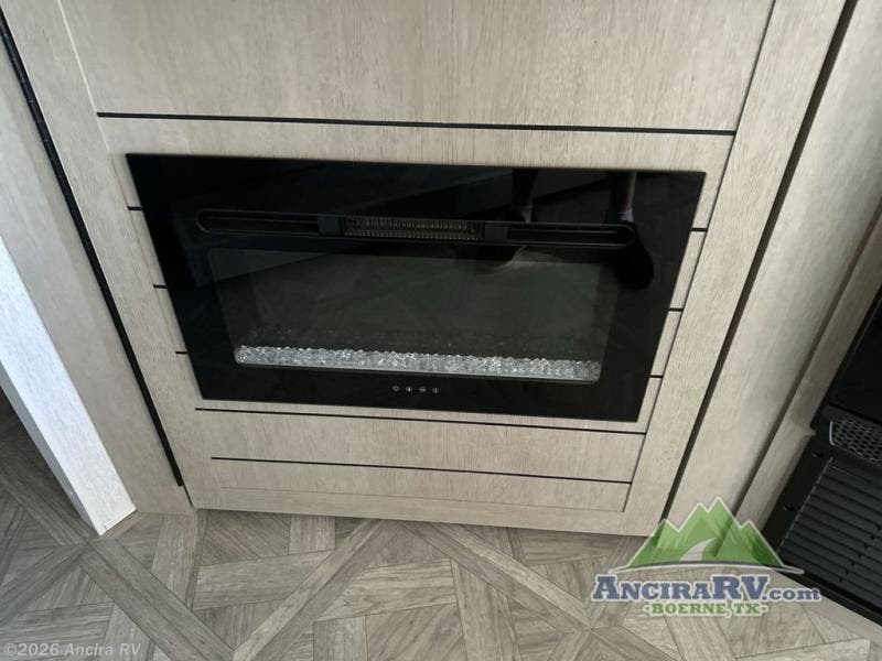 You're sure to make camping memories in this spacious travel trailer! You can easily sleep eight people each night thanks to the double-size bunks, the custom king bed with Versa Tilt in the front bedroom plus the Versa-Lounge within the large slide out! The three burner cooktop and microwave oven will let you make meals each day, and you'll appreciate the hidden pantry with shelves behind the fireplace. There is also a booth dinette where you can dine together or play a game of cards after dinner is cleaned up, or you may just find yourselves outdoors under the 16' power awning with LED lights. And don't overlook the full bath, complete with a tub/shower that will make bath time easier if you have little ones.