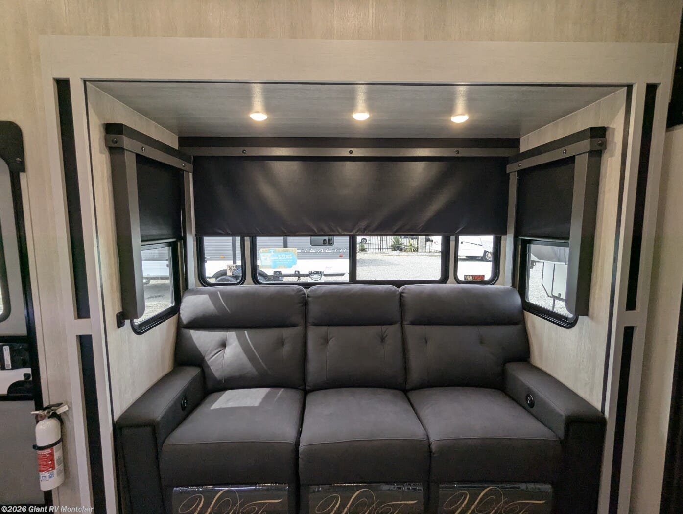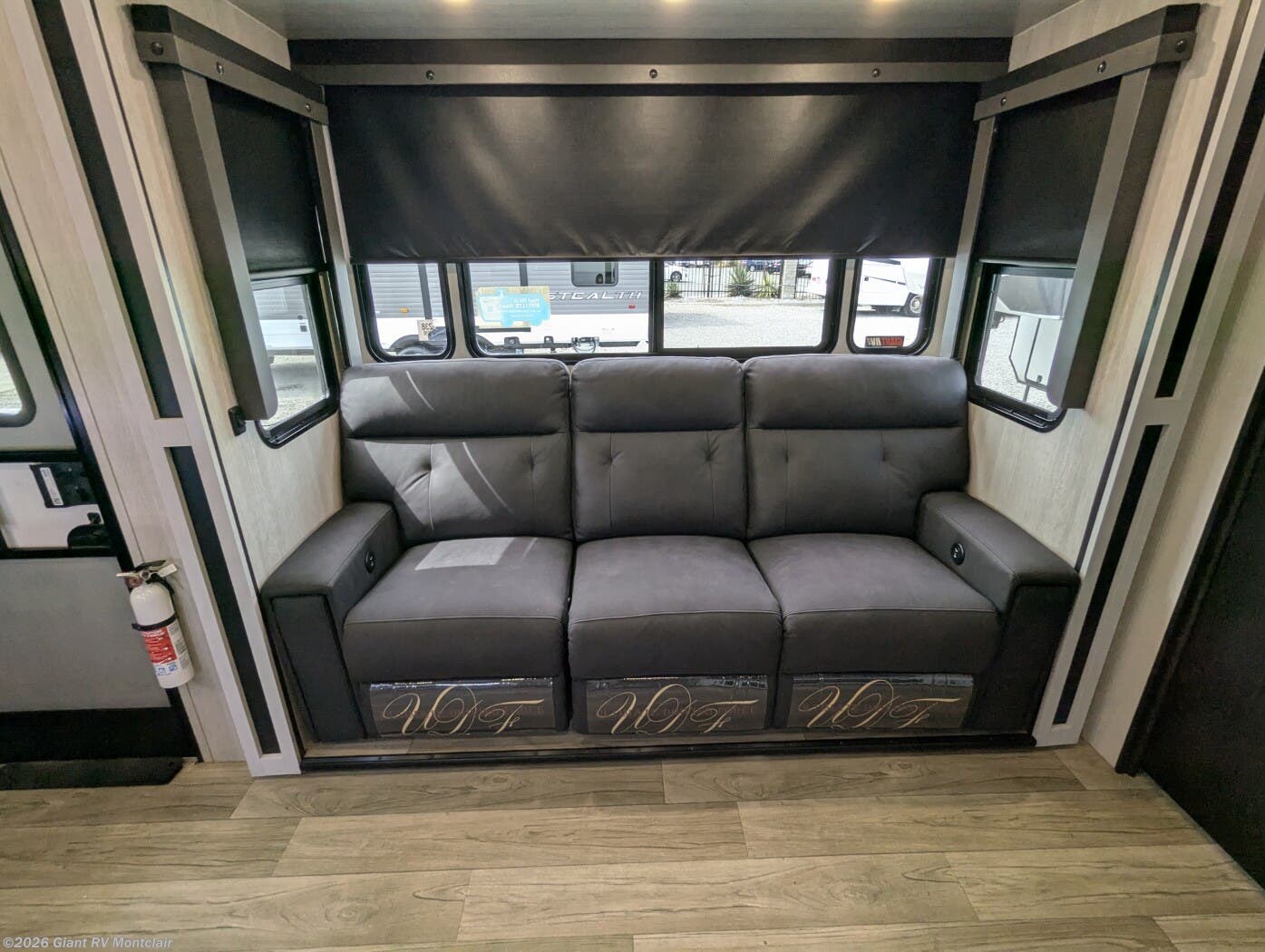 • Residential Living & Entertaining Space – Open great room with opposing slides, theater seating, sleeper sofa, entertainment center with fireplace, panoramic windows, and premium flooring.