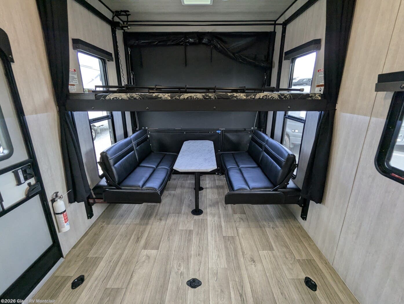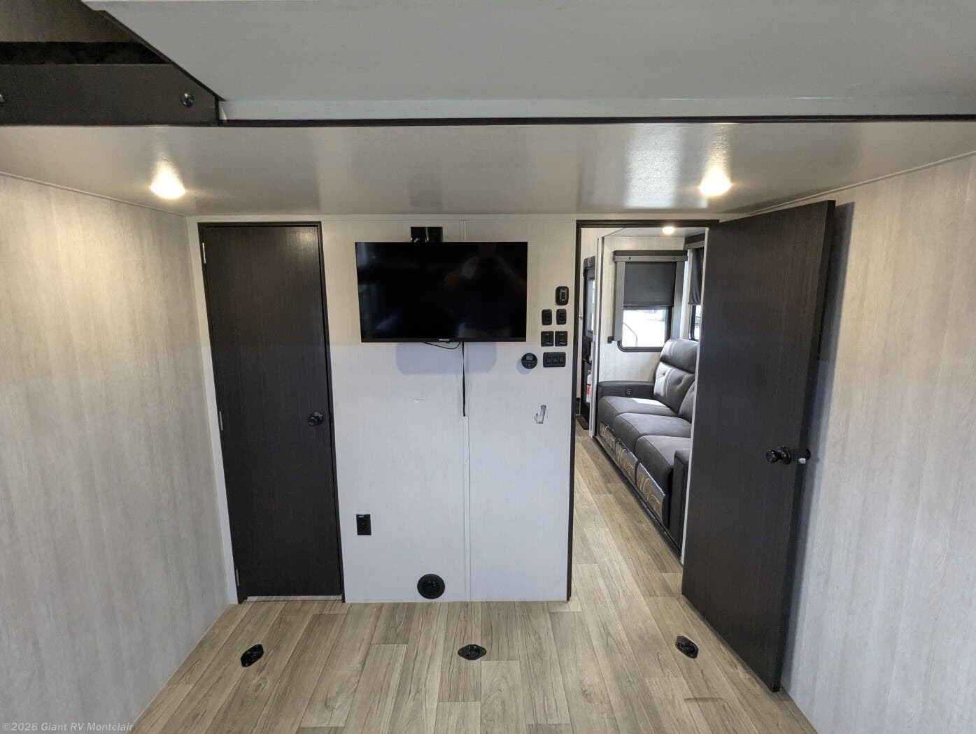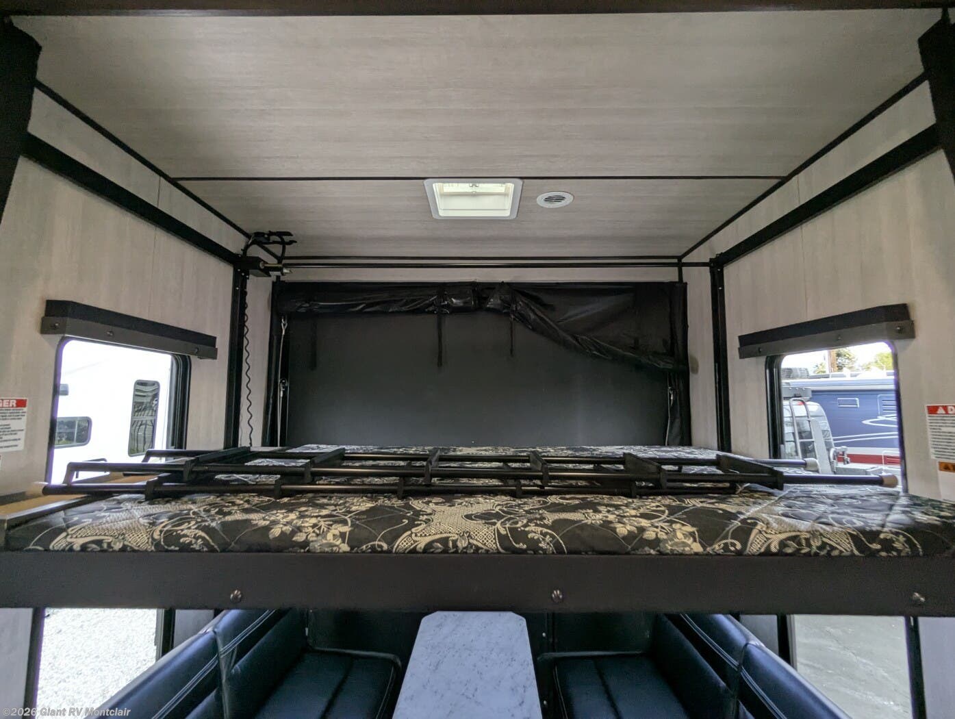• Large Garage & Loading Ease – Oversized cargo area with heavy-duty tie-downs, spring-assist ramp door, ducted A/C in garage, and loft sleeping above; ideal for ATVs, UTVs, motorcycles, or gear.