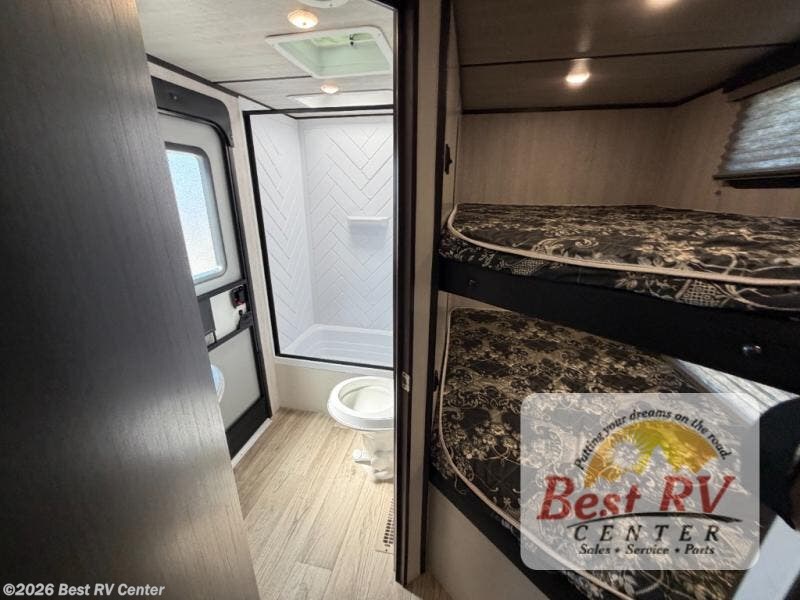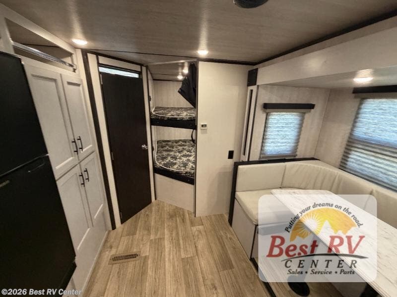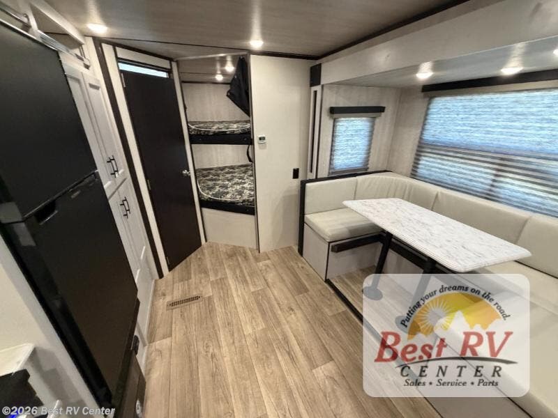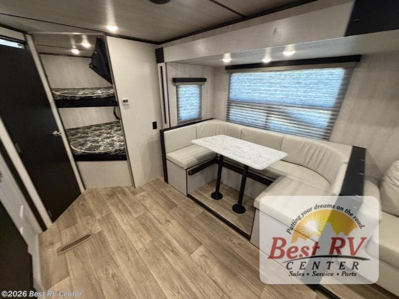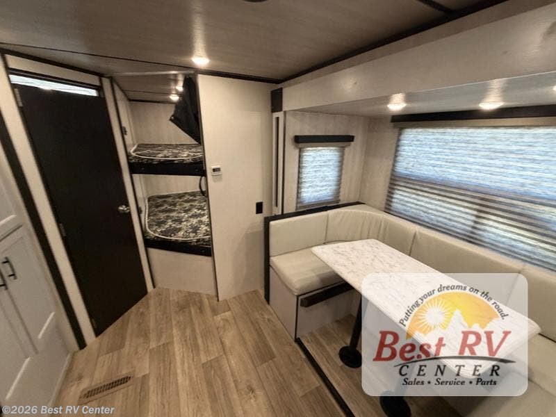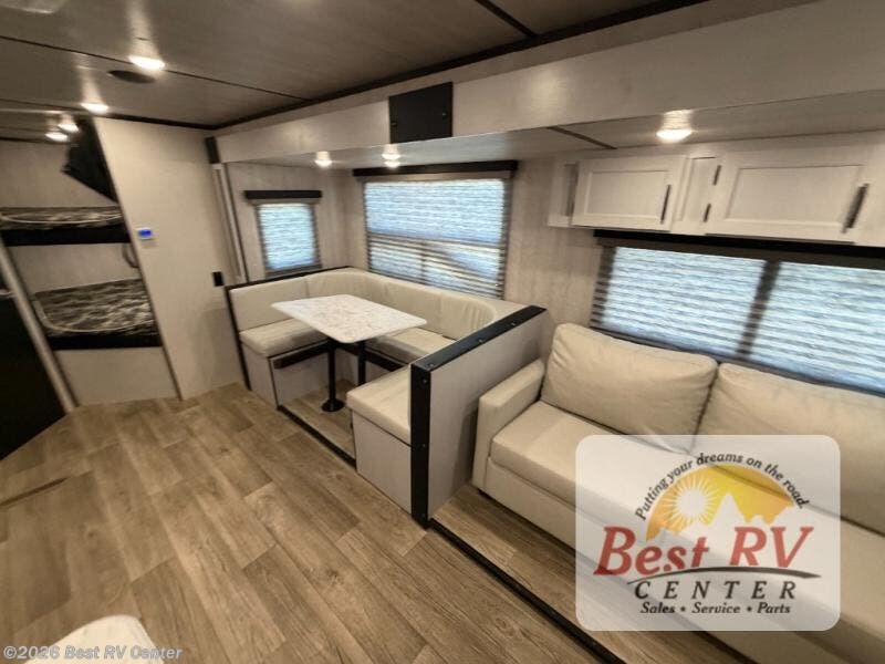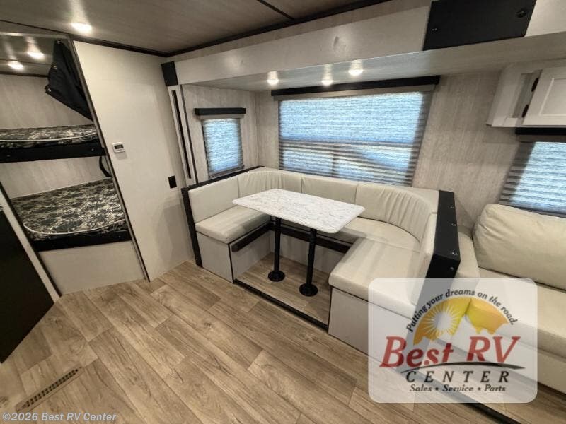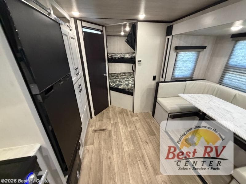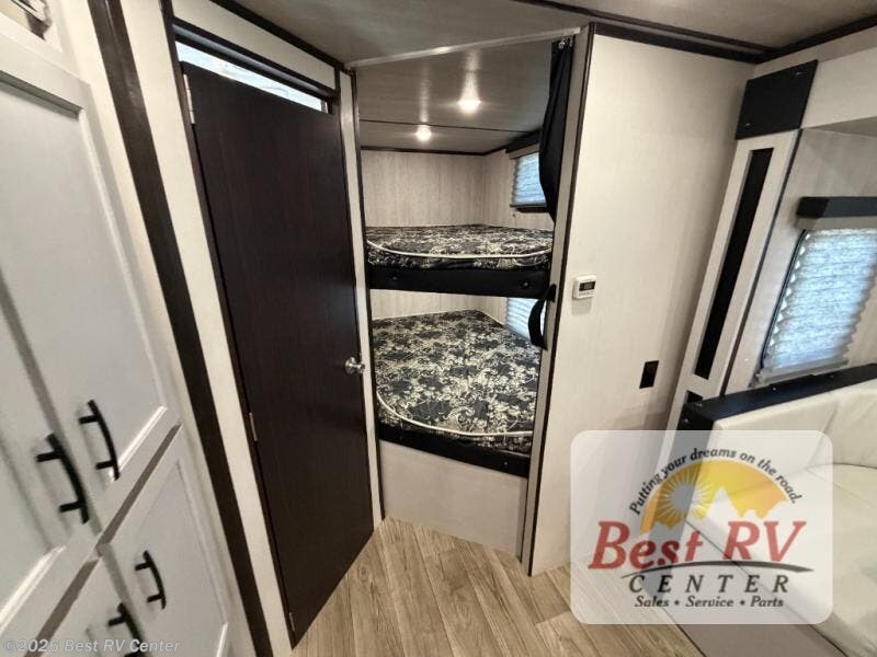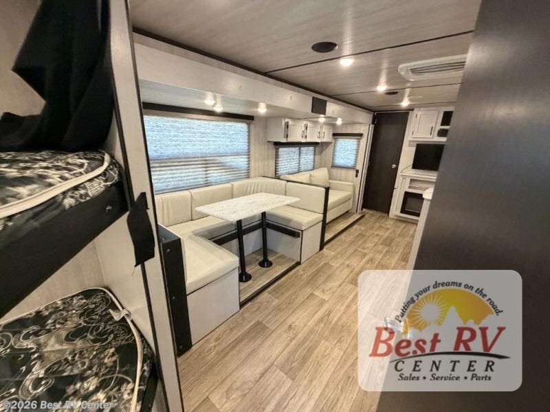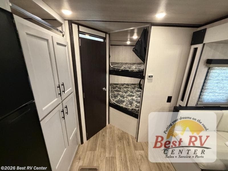 Each camping trip in this travel trailer will be a trip well spent! The double-size bunks in the back will be a big bonus with the little ones and you'll appreciate a front private bedroom with a queen bed just like at home. Within the large slide out you'll find a U-shaped dinette and sofa to dine, relax, and sleep even more guests, and everyone will love the 32" TV for movie night. This model includes plenty of storage space, including an exterior pass-through, overhead compartments, and a pantry/wardrobe. The full bath with its own exterior entry door is another convenient feature since it lets you use the restroom quickly without having to bring dirt throughout the trailer.