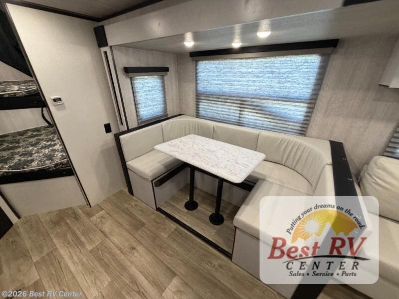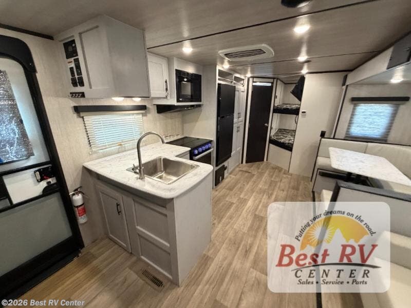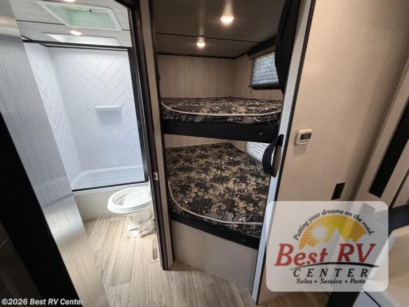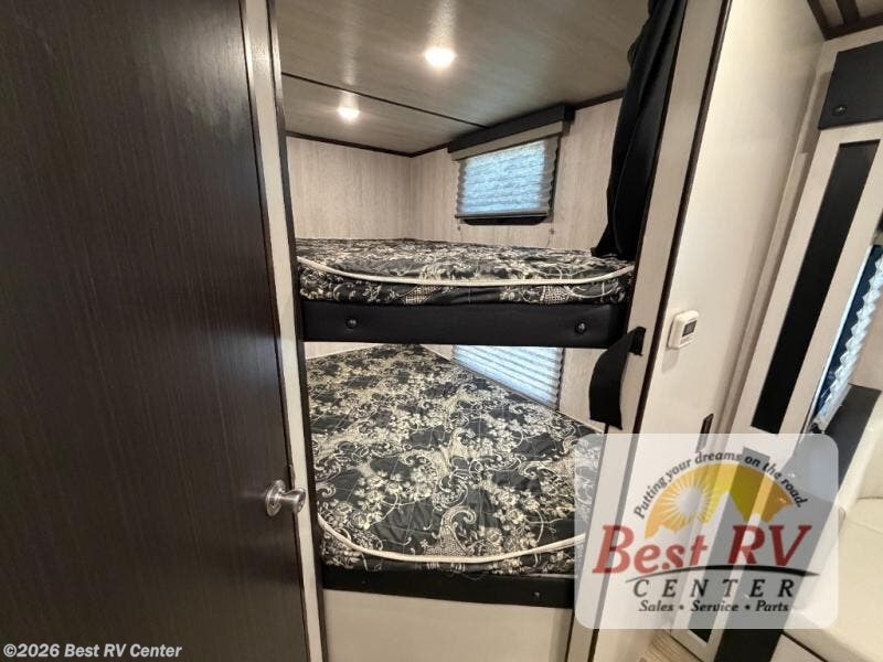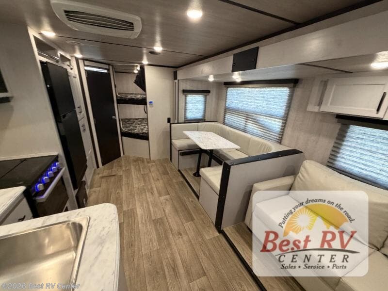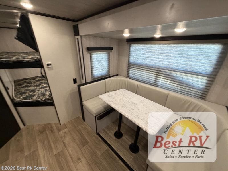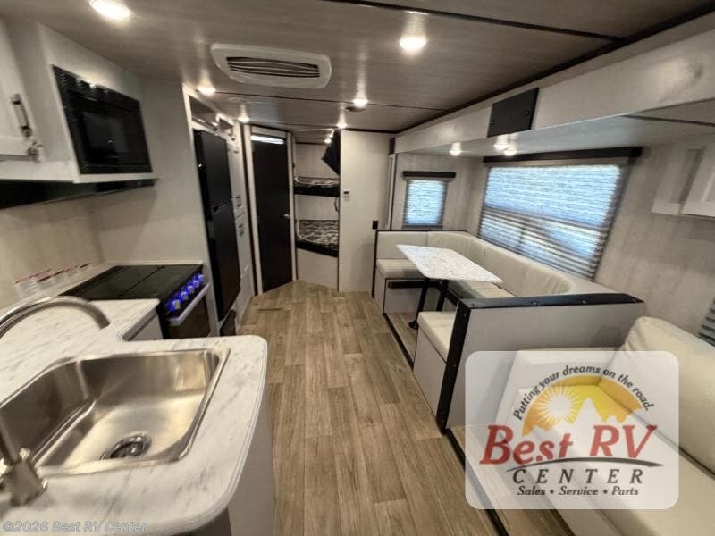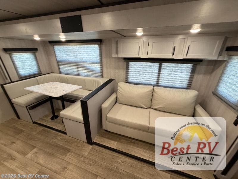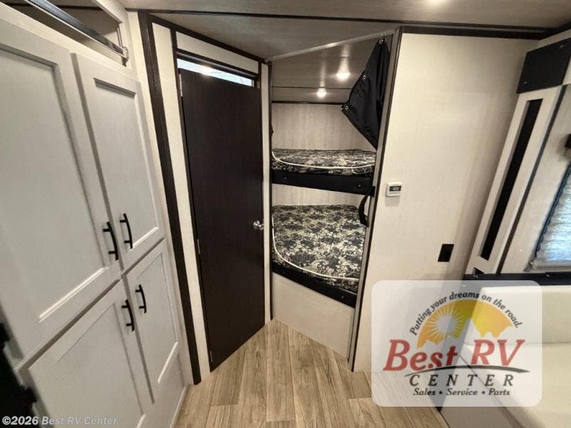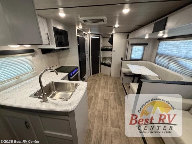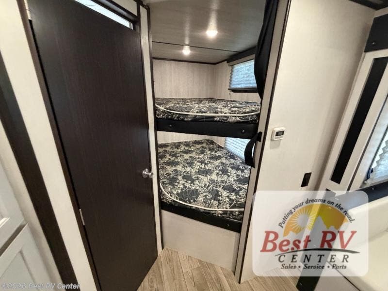 Each camping trip in this travel trailer will be a trip well spent! The double-size bunks in the back will be a big bonus with the little ones and you'll appreciate a front private bedroom with a queen bed just like at home. Within the large slide out you'll find a U-shaped dinette and sofa to dine, relax, and sleep even more guests, and everyone will love the 32" TV for movie night. This model includes plenty of storage space, including an exterior pass-through, overhead compartments, and a pantry/wardrobe. The full bath with its own exterior entry door is another convenient feature since it lets you use the restroom quickly without having to bring dirt throughout the trailer.