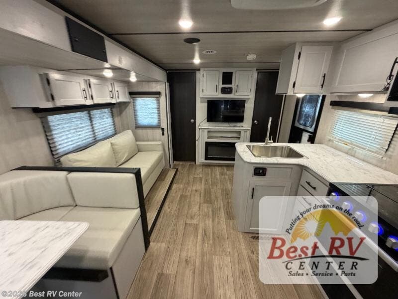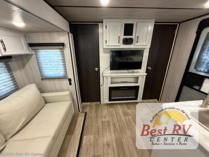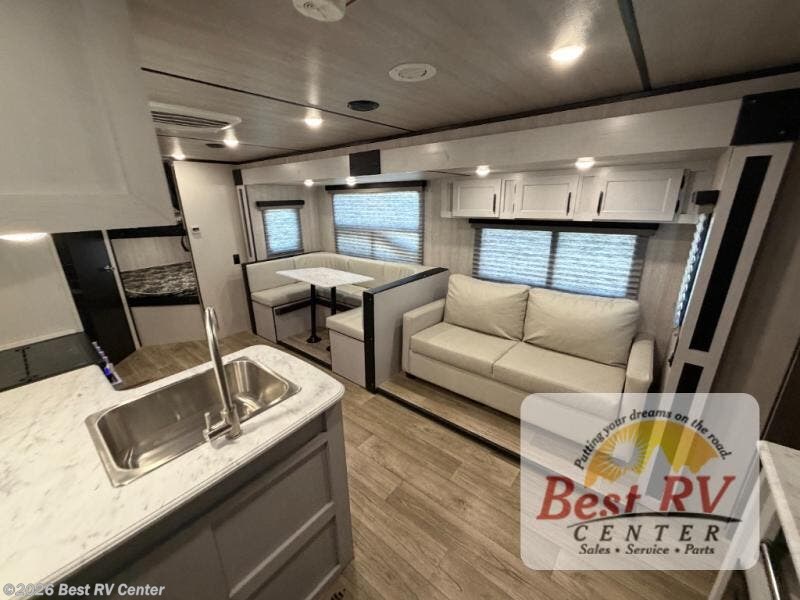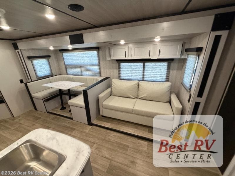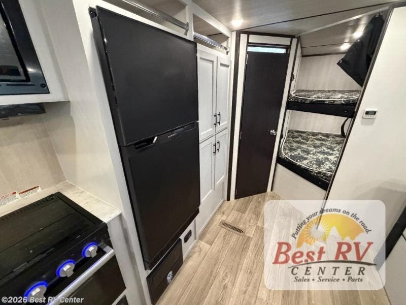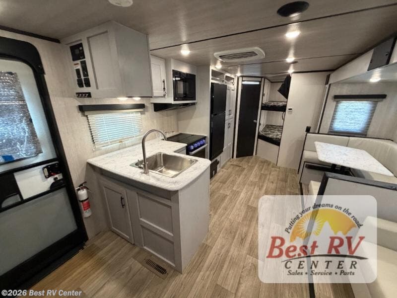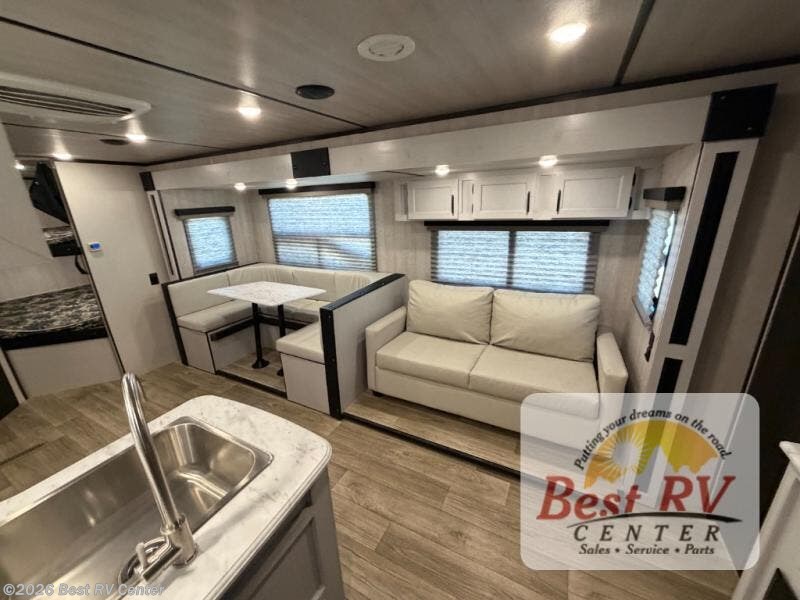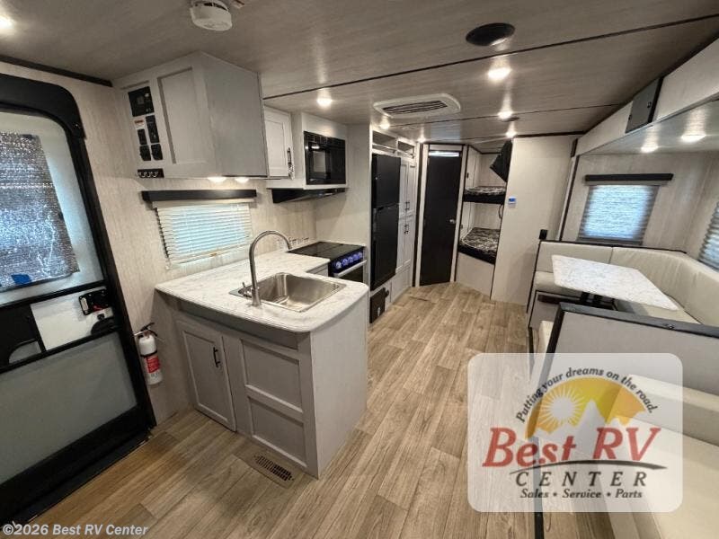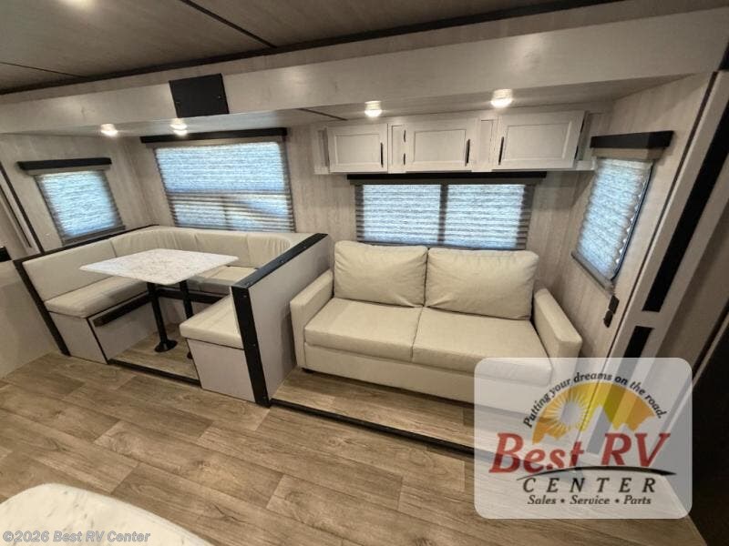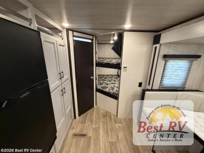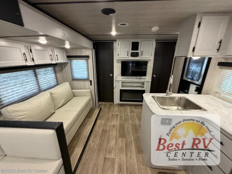 Each camping trip in this travel trailer will be a trip well spent! The double-size bunks in the back will be a big bonus with the little ones and you'll appreciate a front private bedroom with a queen bed just like at home. Within the large slide out you'll find a U-shaped dinette and sofa to dine, relax, and sleep even more guests, and everyone will love the 32" TV for movie night. This model includes plenty of storage space, including an exterior pass-through, overhead compartments, and a pantry/wardrobe. The full bath with its own exterior entry door is another convenient feature since it lets you use the restroom quickly without having to bring dirt throughout the trailer.