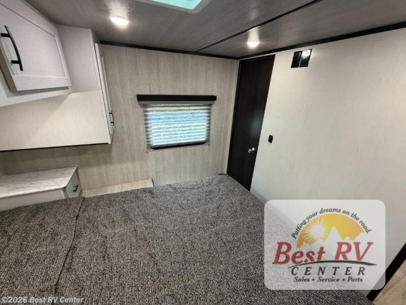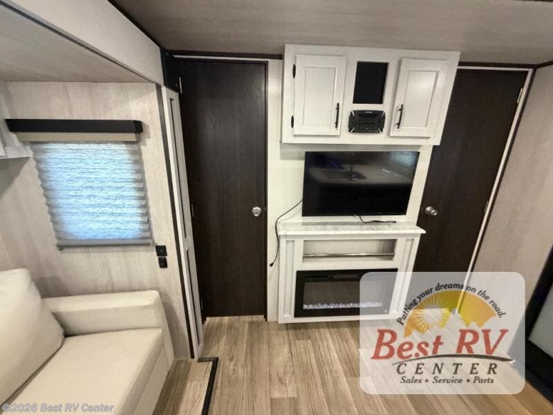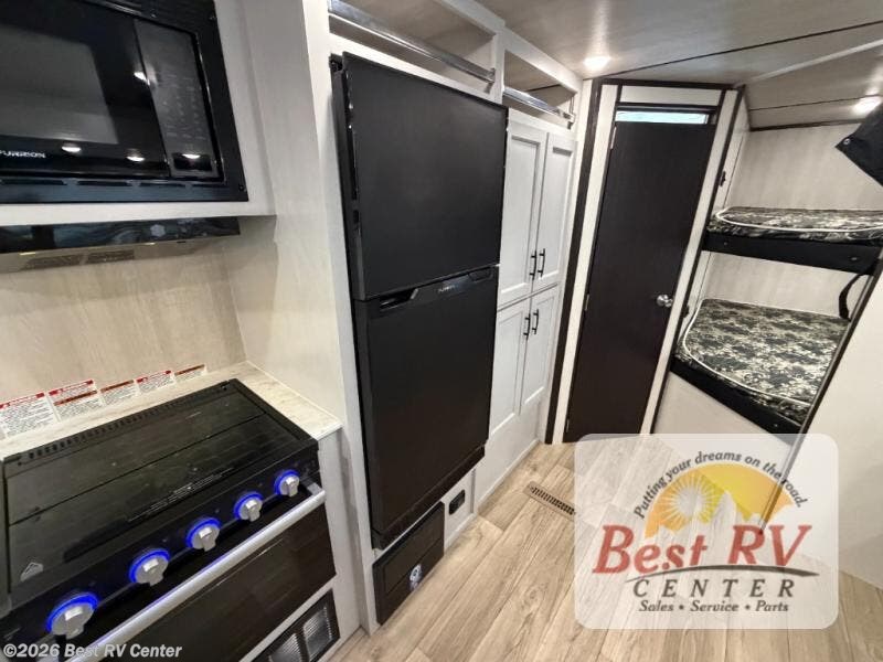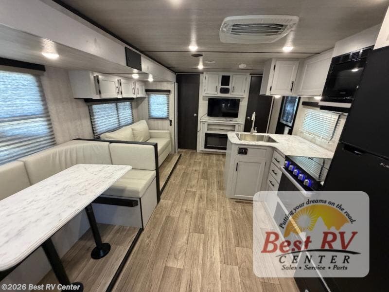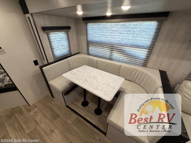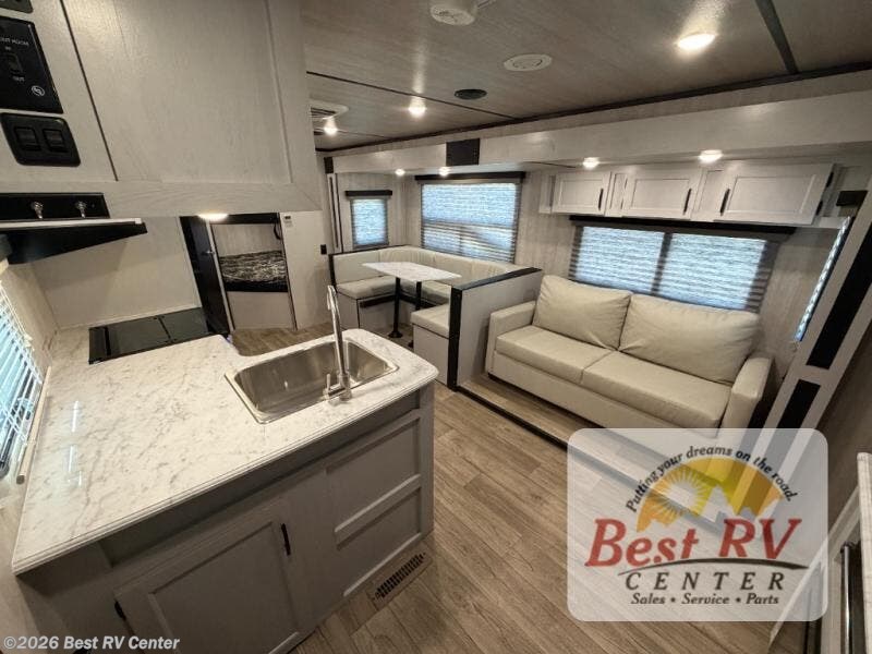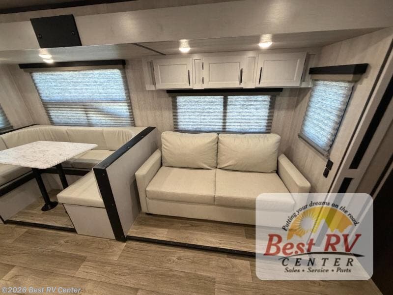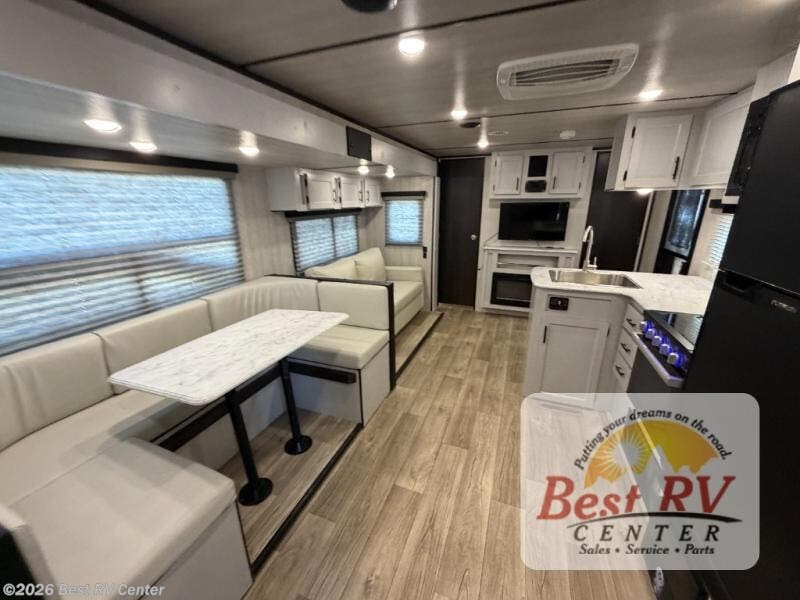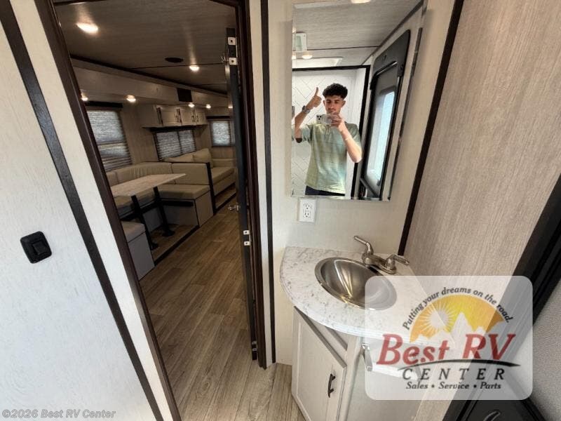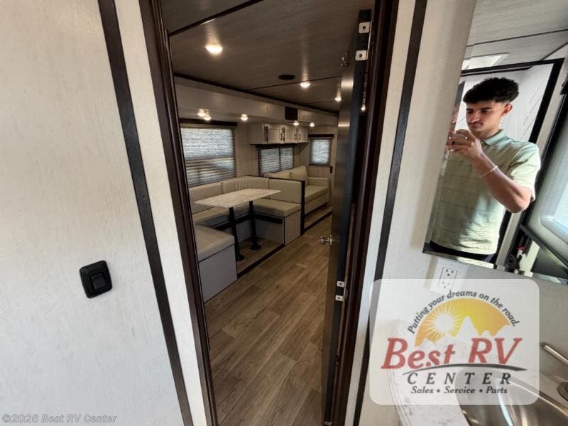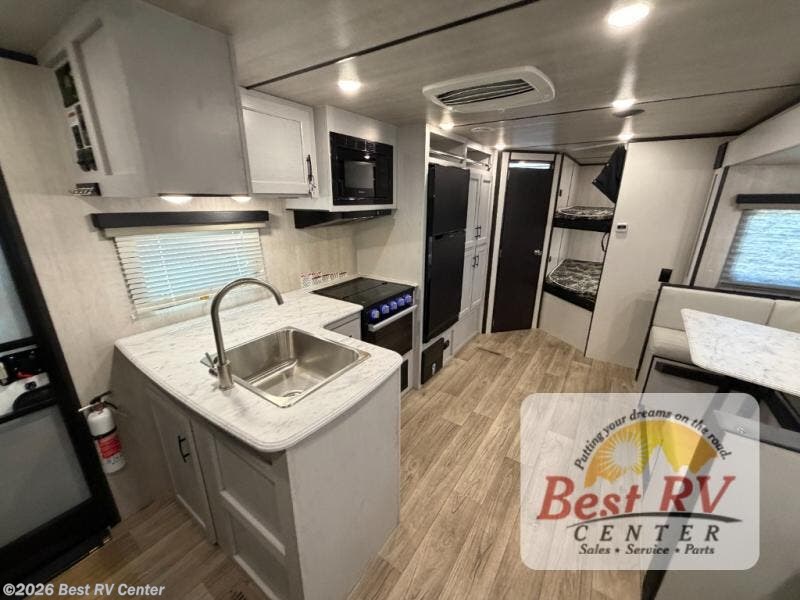 Each camping trip in this travel trailer will be a trip well spent! The double-size bunks in the back will be a big bonus with the little ones and you'll appreciate a front private bedroom with a queen bed just like at home. Within the large slide out you'll find a U-shaped dinette and sofa to dine, relax, and sleep even more guests, and everyone will love the 32" TV for movie night. This model includes plenty of storage space, including an exterior pass-through, overhead compartments, and a pantry/wardrobe. The full bath with its own exterior entry door is another convenient feature since it lets you use the restroom quickly without having to bring dirt throughout the trailer.