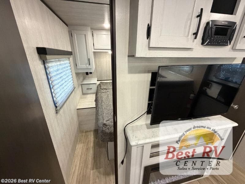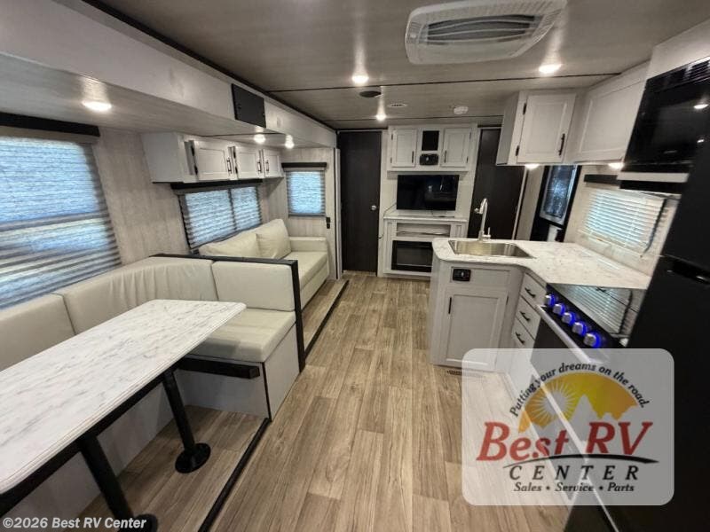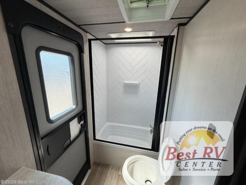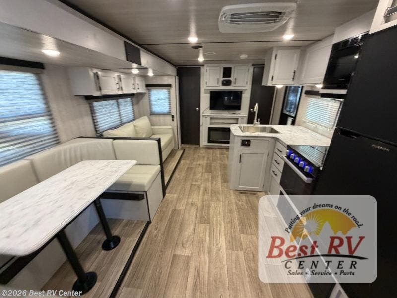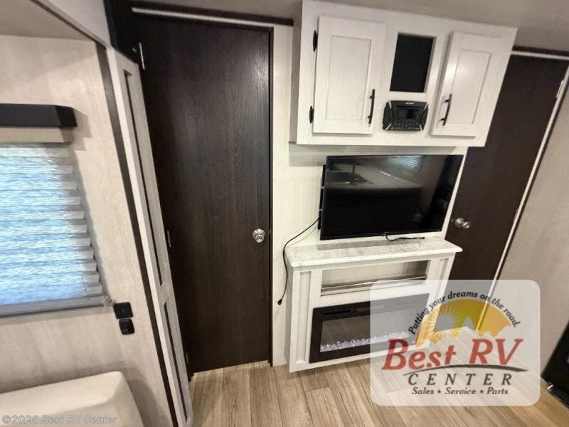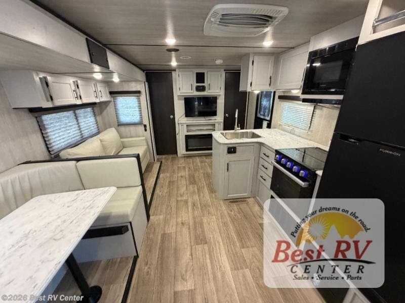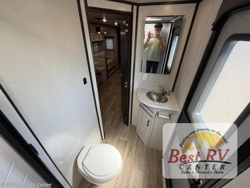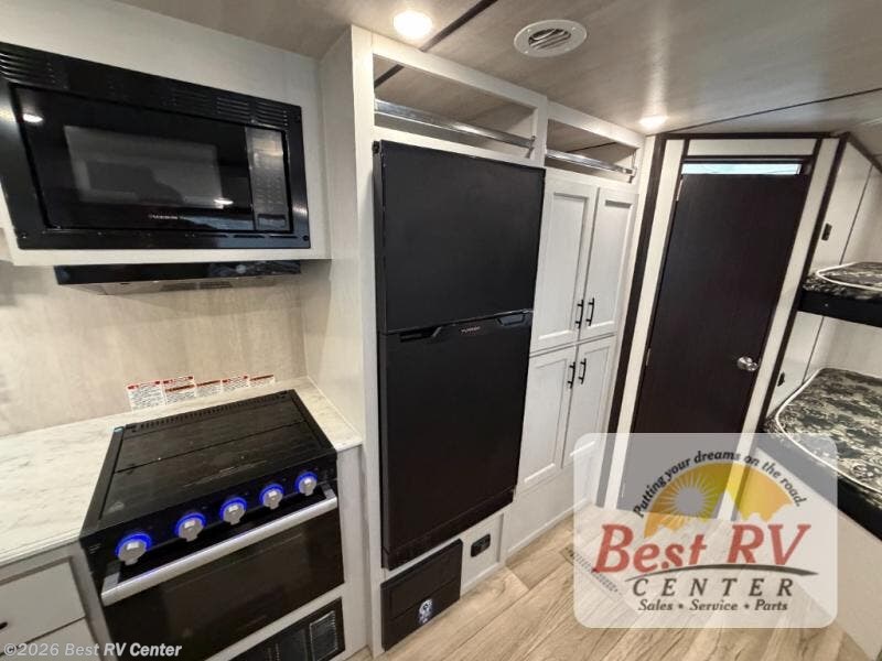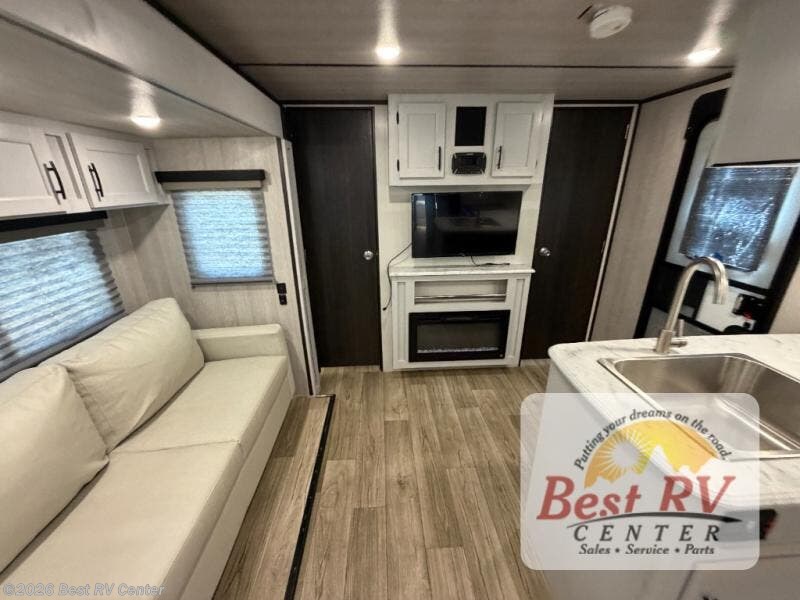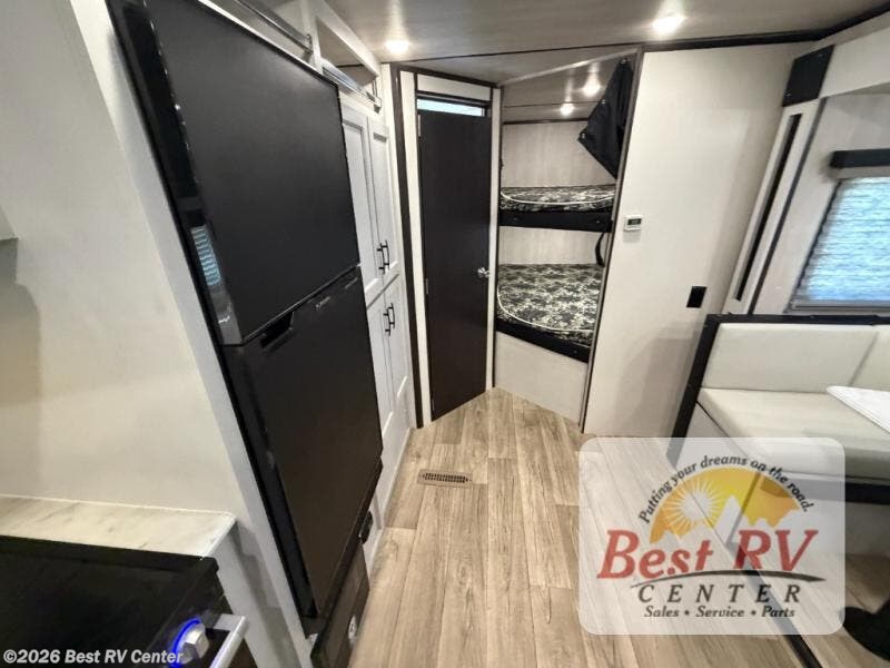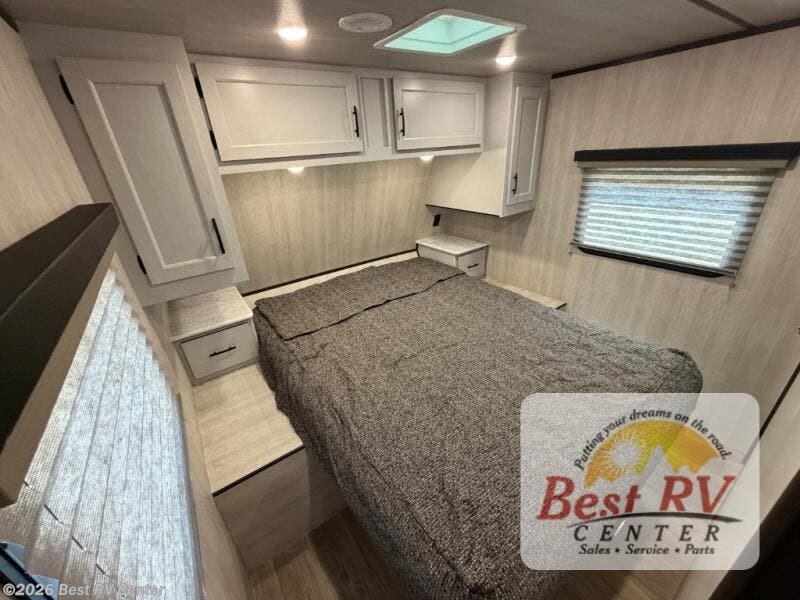 Each camping trip in this travel trailer will be a trip well spent! The double-size bunks in the back will be a big bonus with the little ones and you'll appreciate a front private bedroom with a queen bed just like at home. Within the large slide out you'll find a U-shaped dinette and sofa to dine, relax, and sleep even more guests, and everyone will love the 32" TV for movie night. This model includes plenty of storage space, including an exterior pass-through, overhead compartments, and a pantry/wardrobe. The full bath with its own exterior entry door is another convenient feature since it lets you use the restroom quickly without having to bring dirt throughout the trailer.
