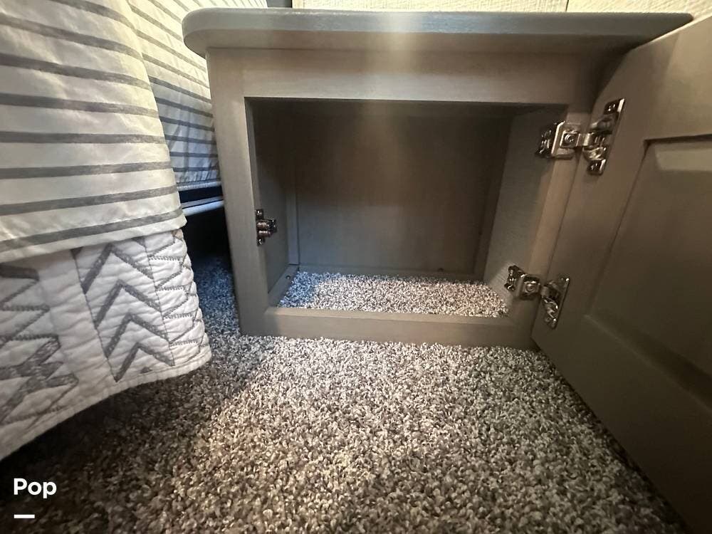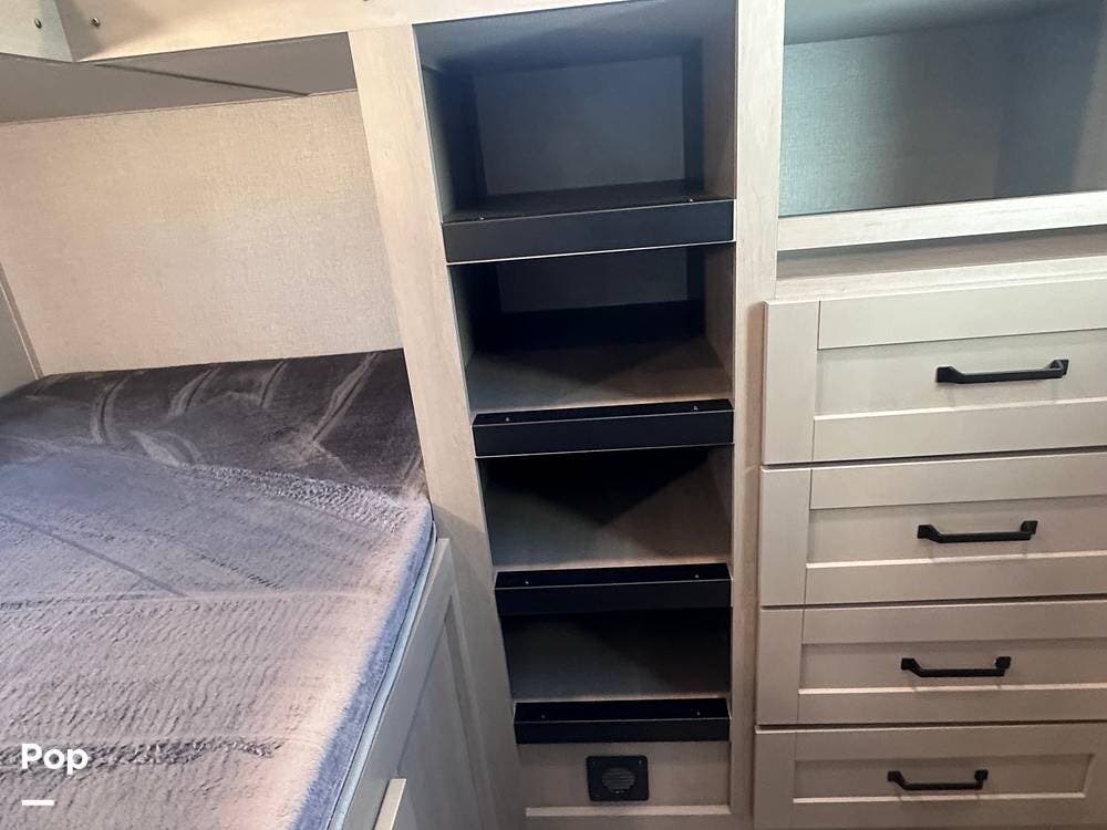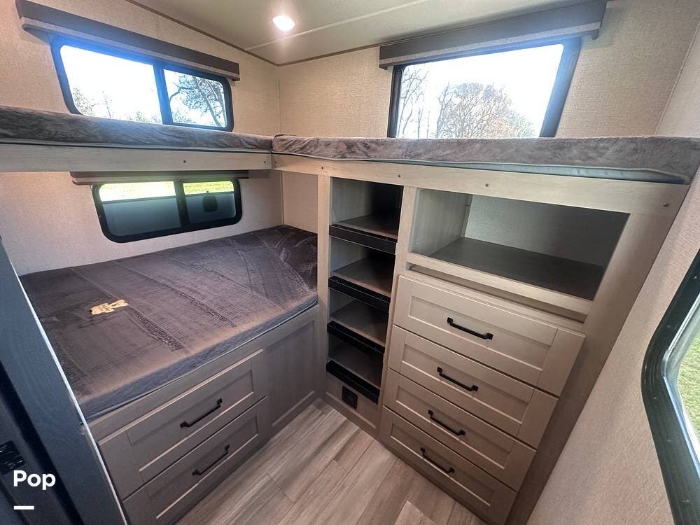 The rear bunkhouse is perfect for kids or guests. It features multiple bunks, cabinet storage, and room for personal items. It provides privacy while still feeling open and comfortable.