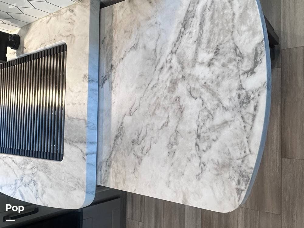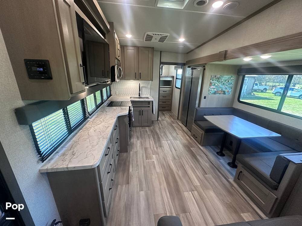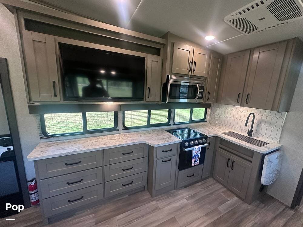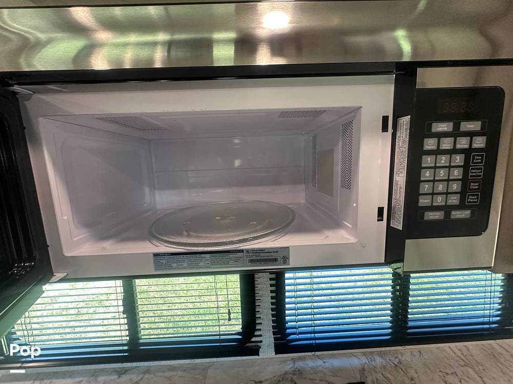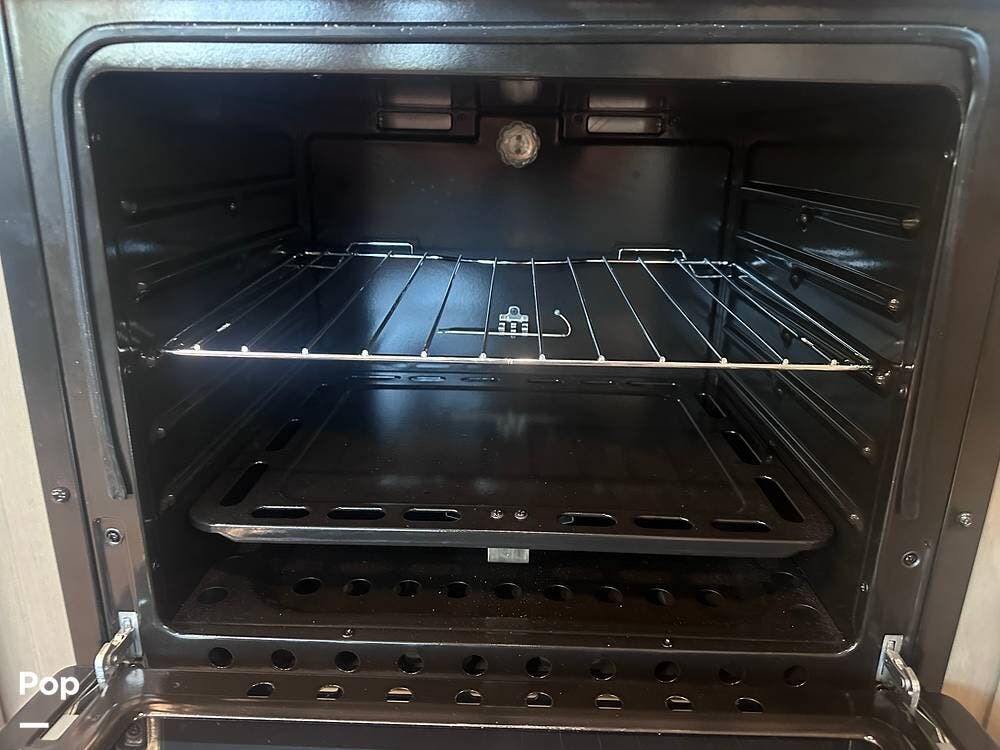 The kitchen is efficient and well laid out. It includes solid counter space, a deep stainless sink, microwave, and a residential-style cooktop and oven. The refrigerator holds plenty of food for long trips. Cabinets above and below offer strong storage space.