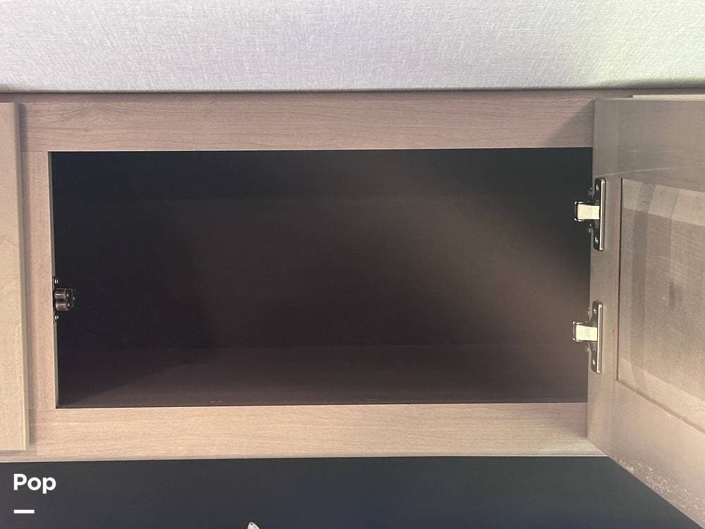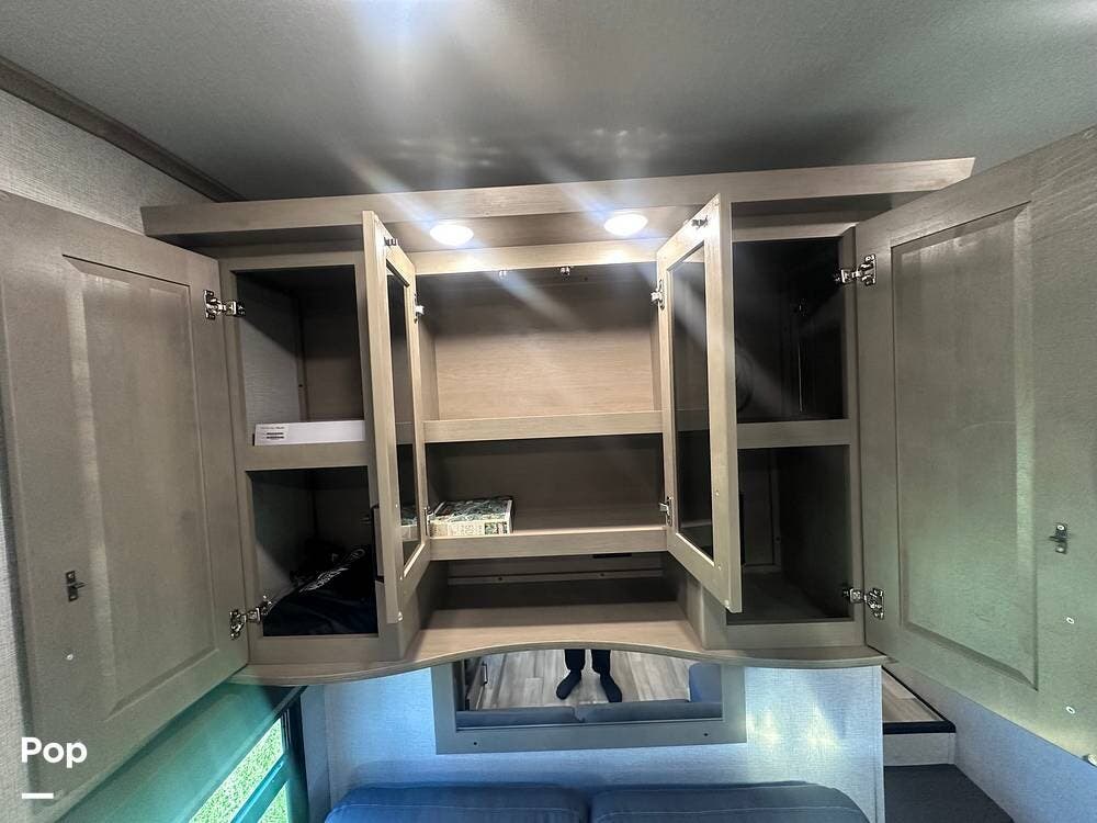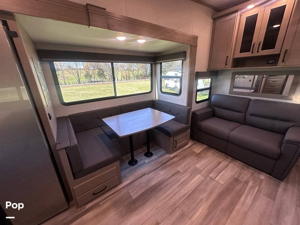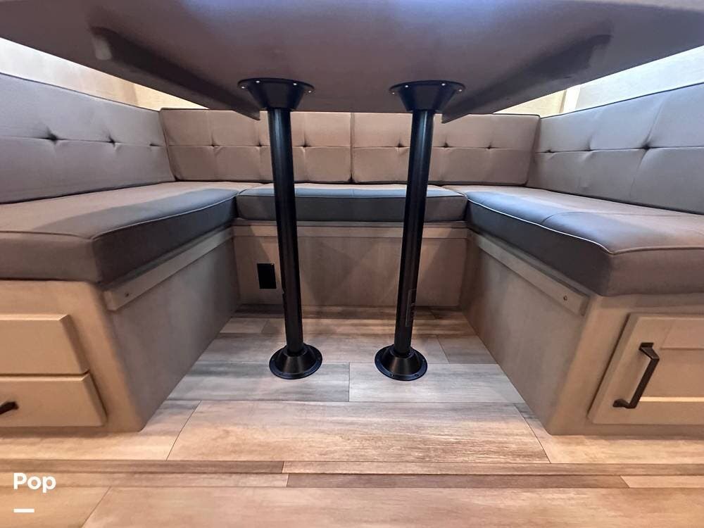 The living area is bright, open, and comfortable. The slide expands the room nicely. The sofa and dinette offer plenty of seating. Large windows bring in natural light. The entertainment center sits directly across from the seating for easy viewing. Storage is placed throughout the room for gear and supplies.