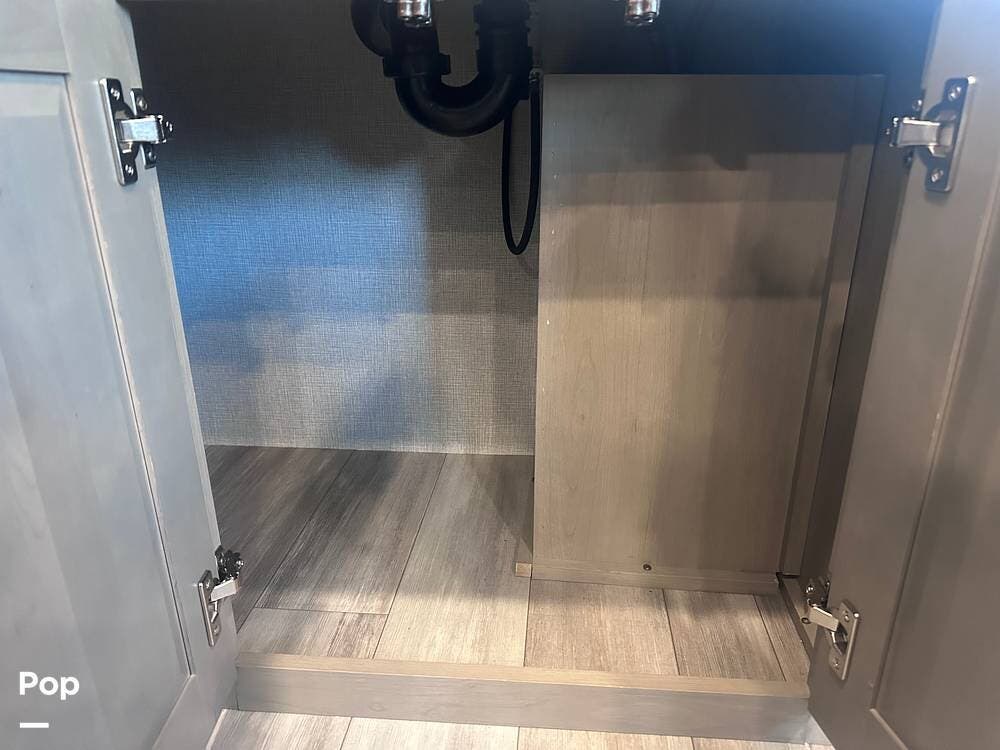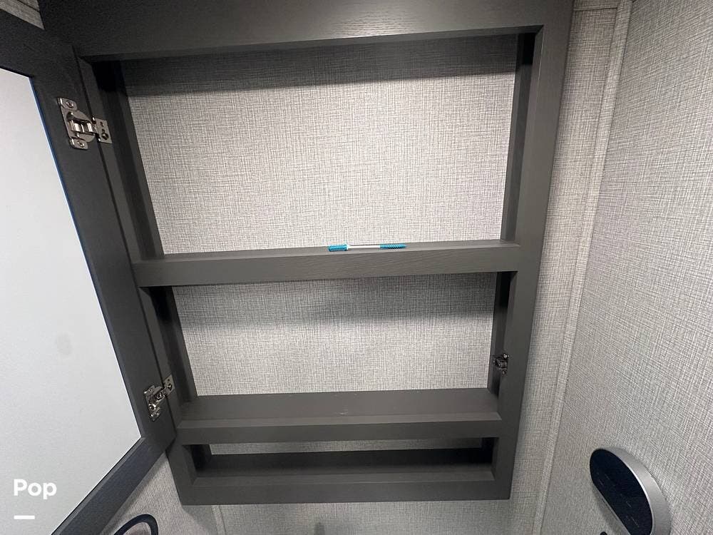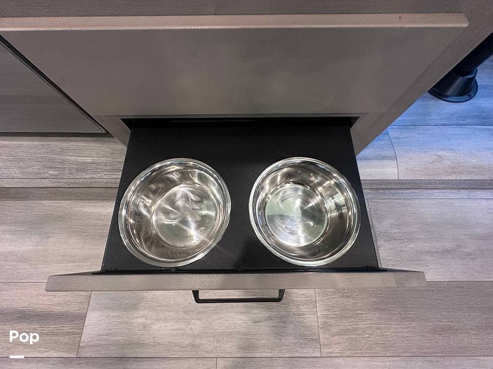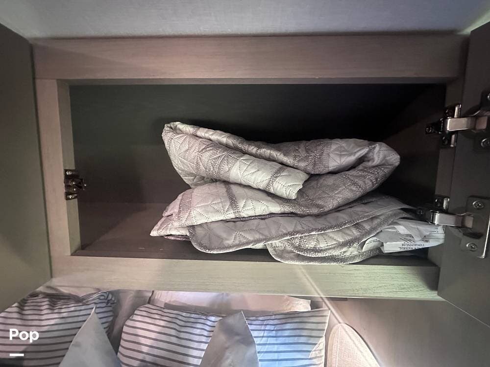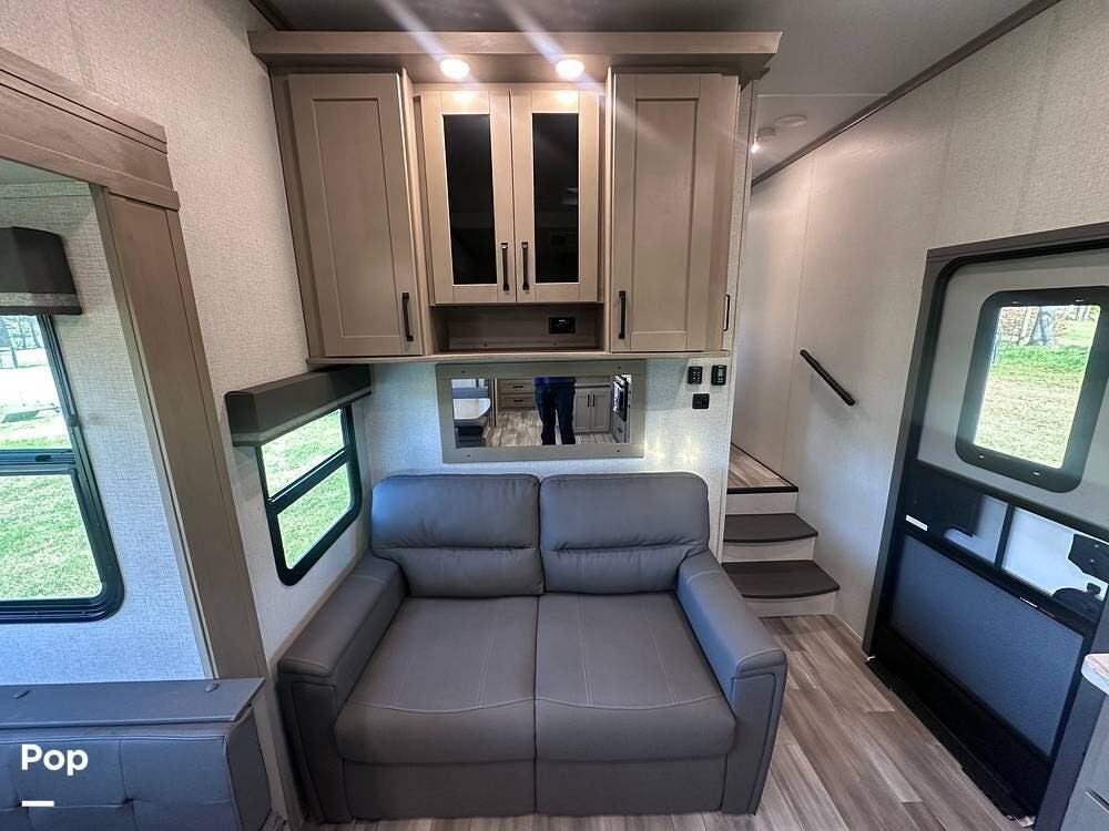 The living area is bright, open, and comfortable. The slide expands the room nicely. The sofa and dinette offer plenty of seating. Large windows bring in natural light. The entertainment center sits directly across from the seating for easy viewing. Storage is placed throughout the room for gear and supplies.