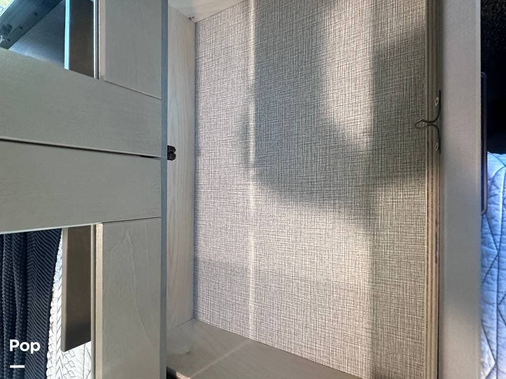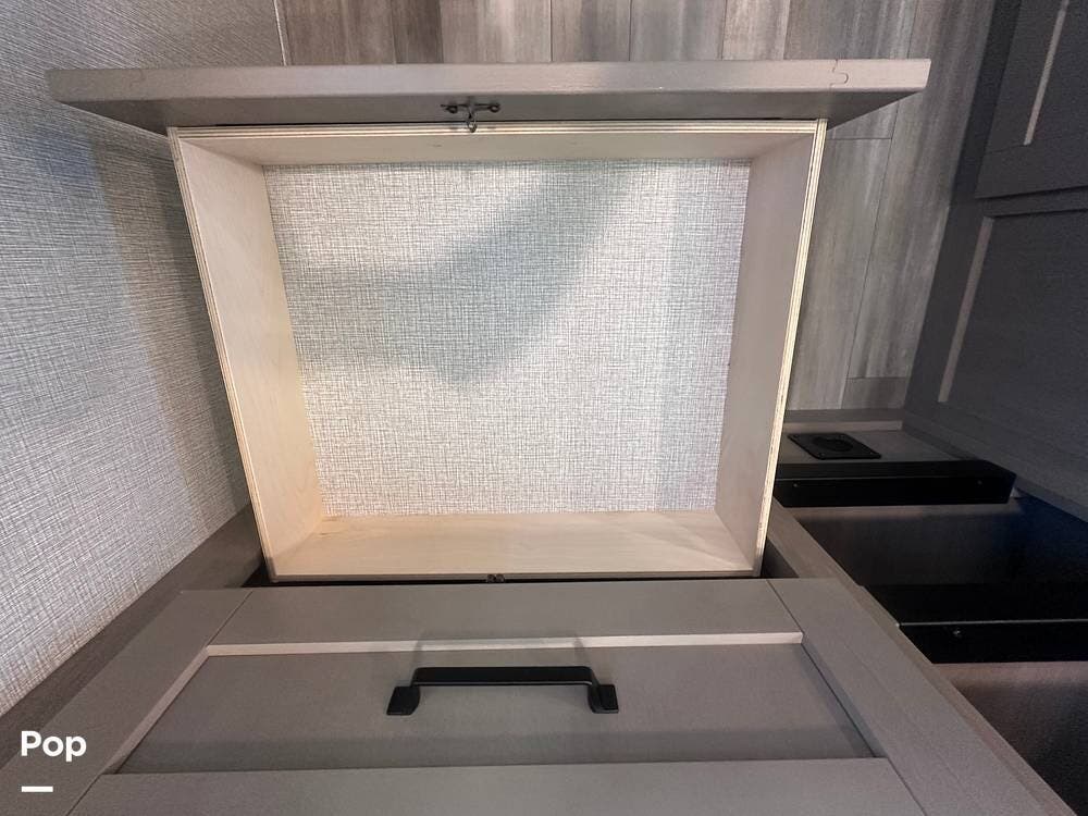 The bathroom offers a stand-up shower, foot-flush toilet, and a vanity with storage. The skylight adds natural light and extra headroom. The layout is simple and easy to maintain.