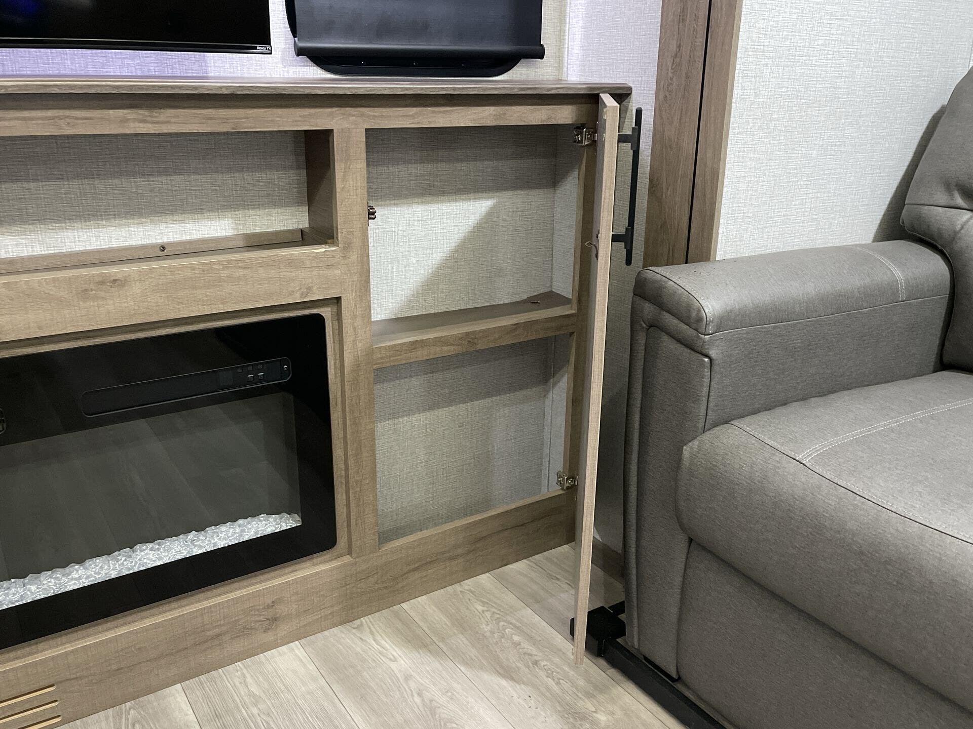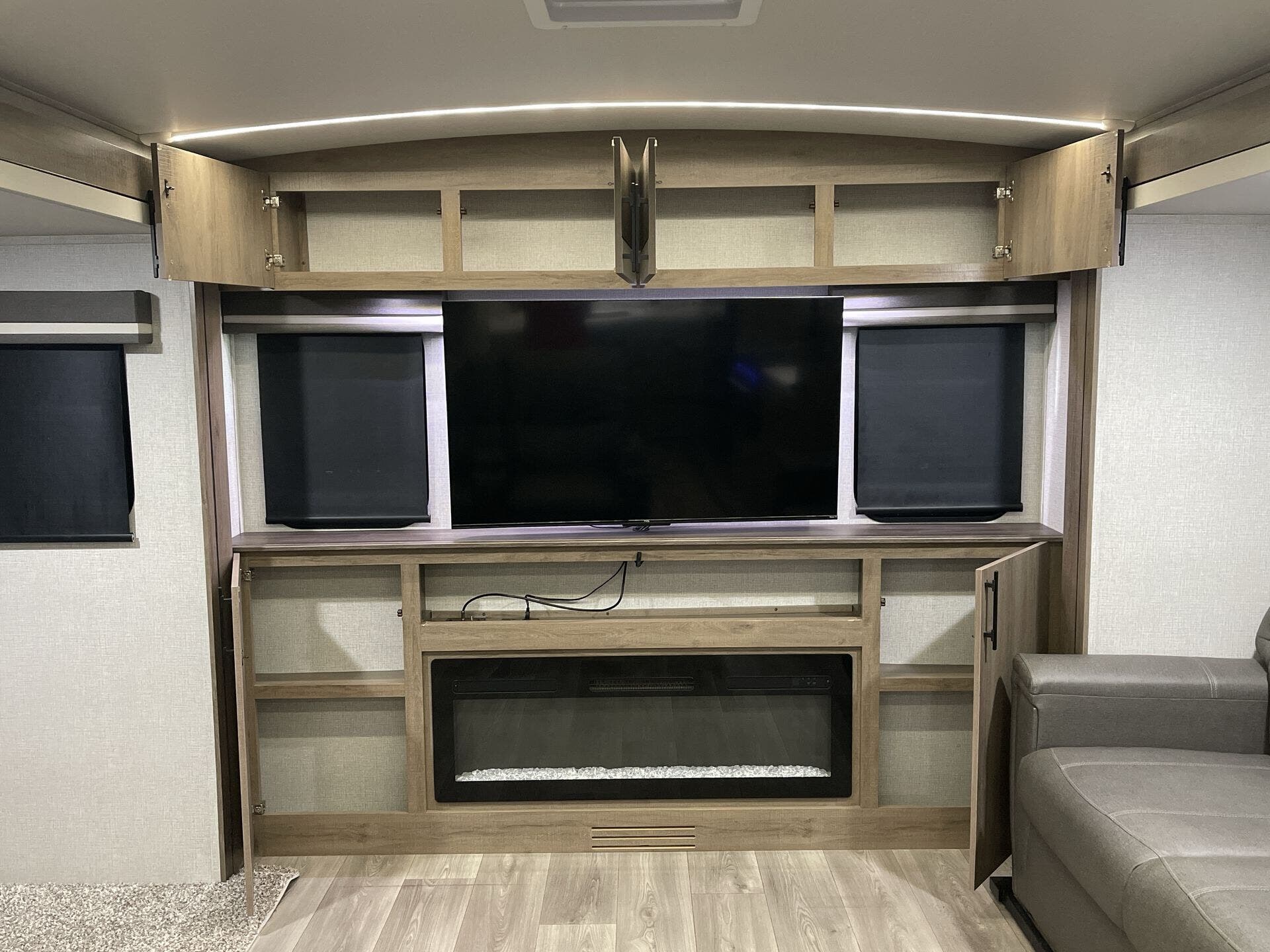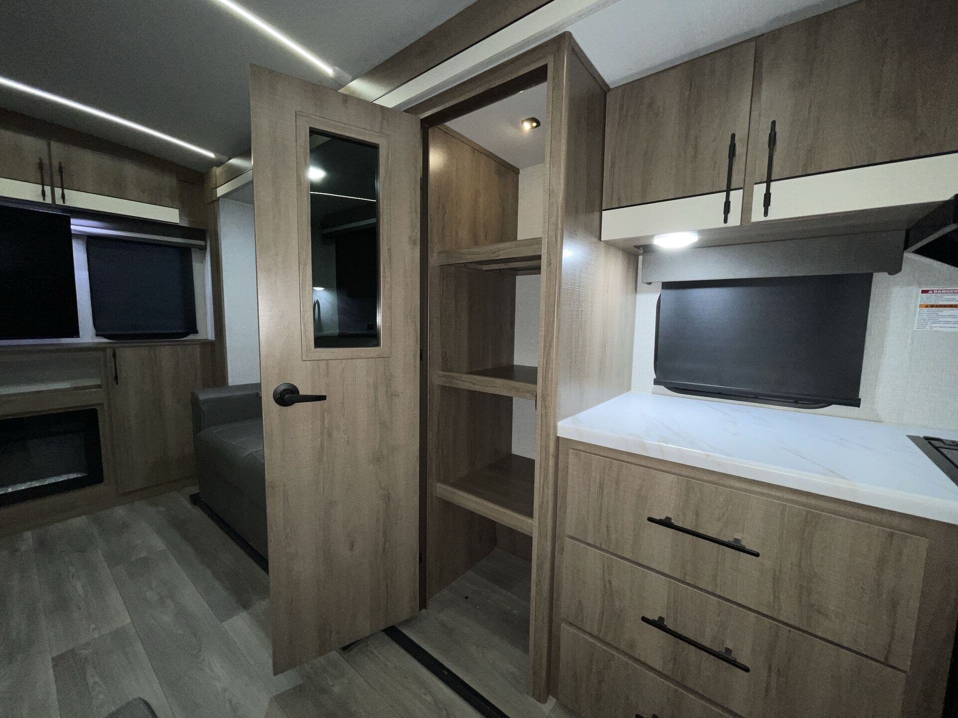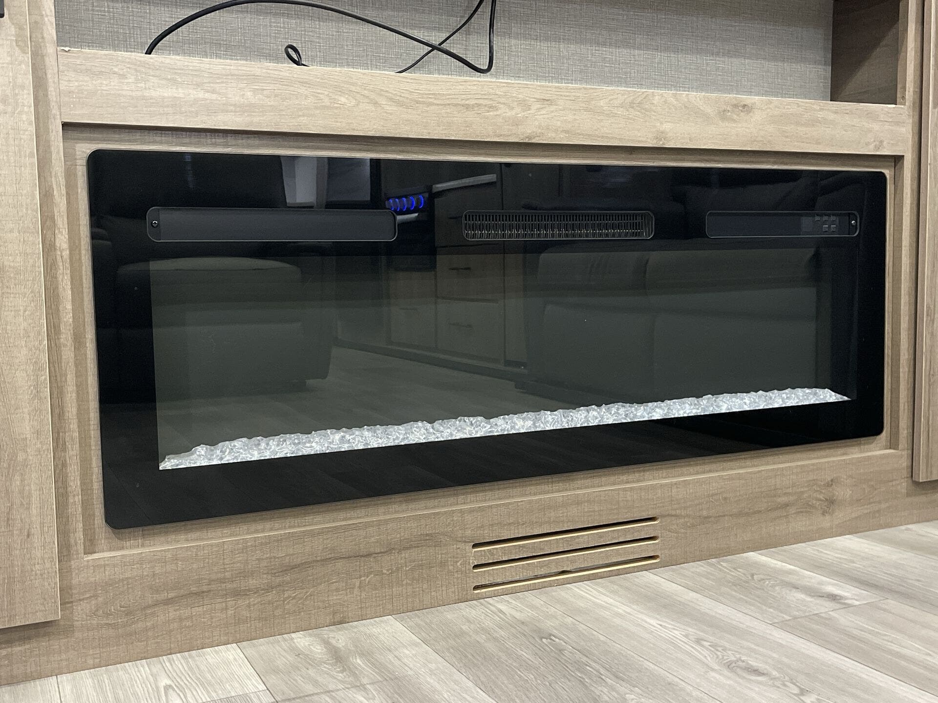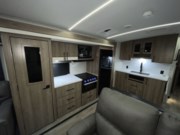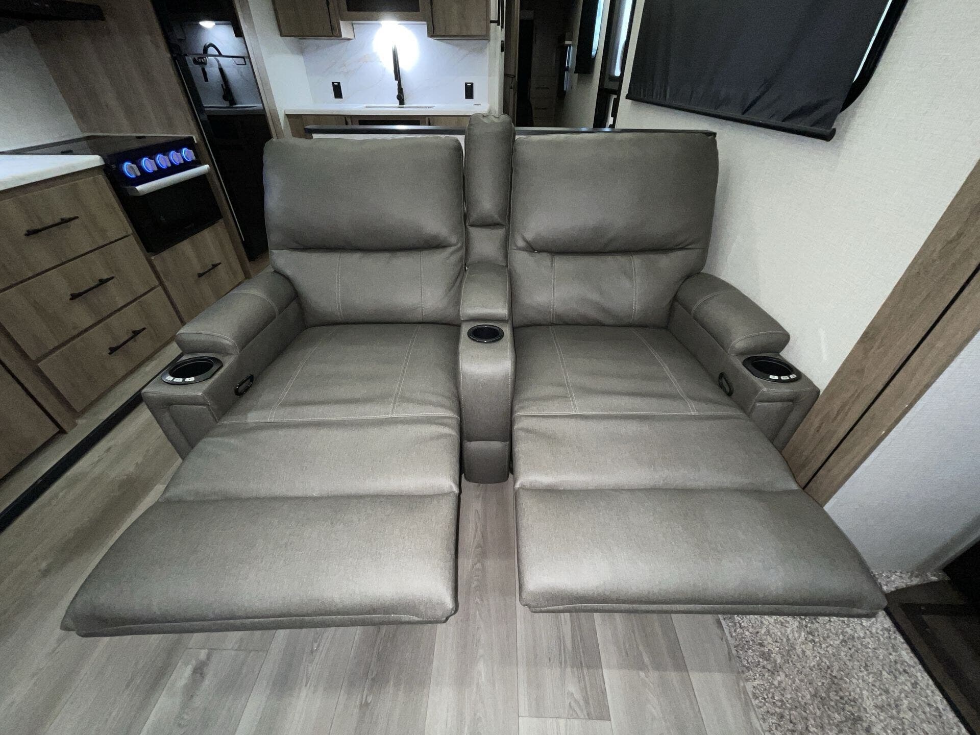 This 2024 Imagine 3100RD blends luxury and functionality so well. The rear living area, tucked behind dual slides, gives you tons of space with tri-fold sofas, theater seats, and that great big fireplace to wind down by. The kitchen is solid — full appliances, pantry space, and a freestanding table so you actually want to cook or hang out inside.