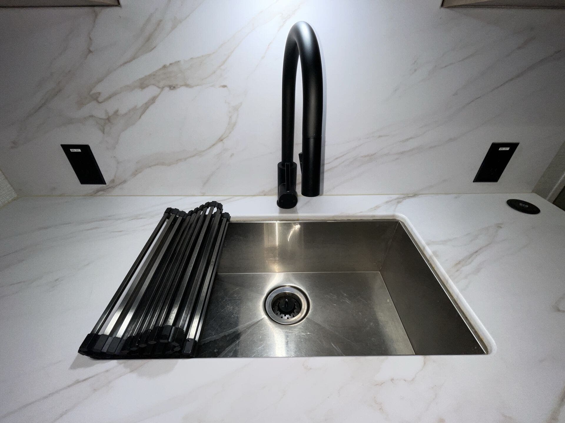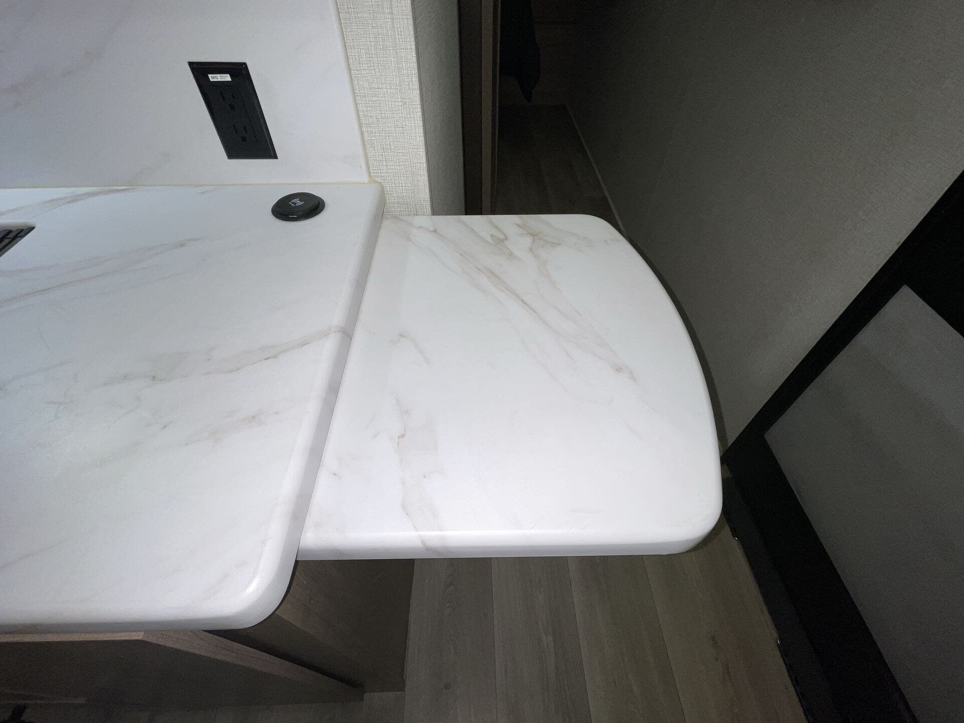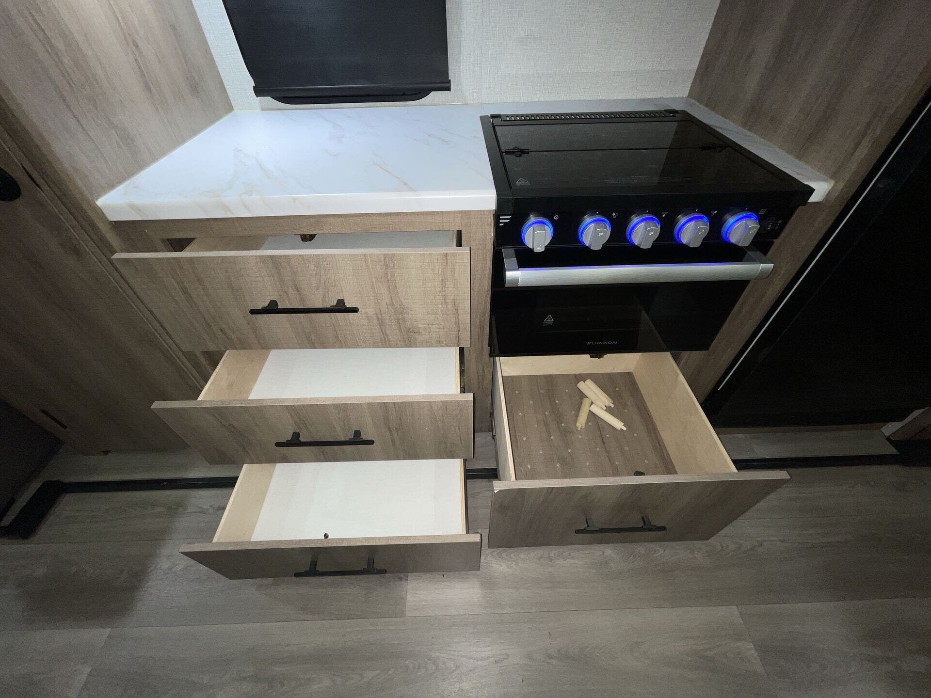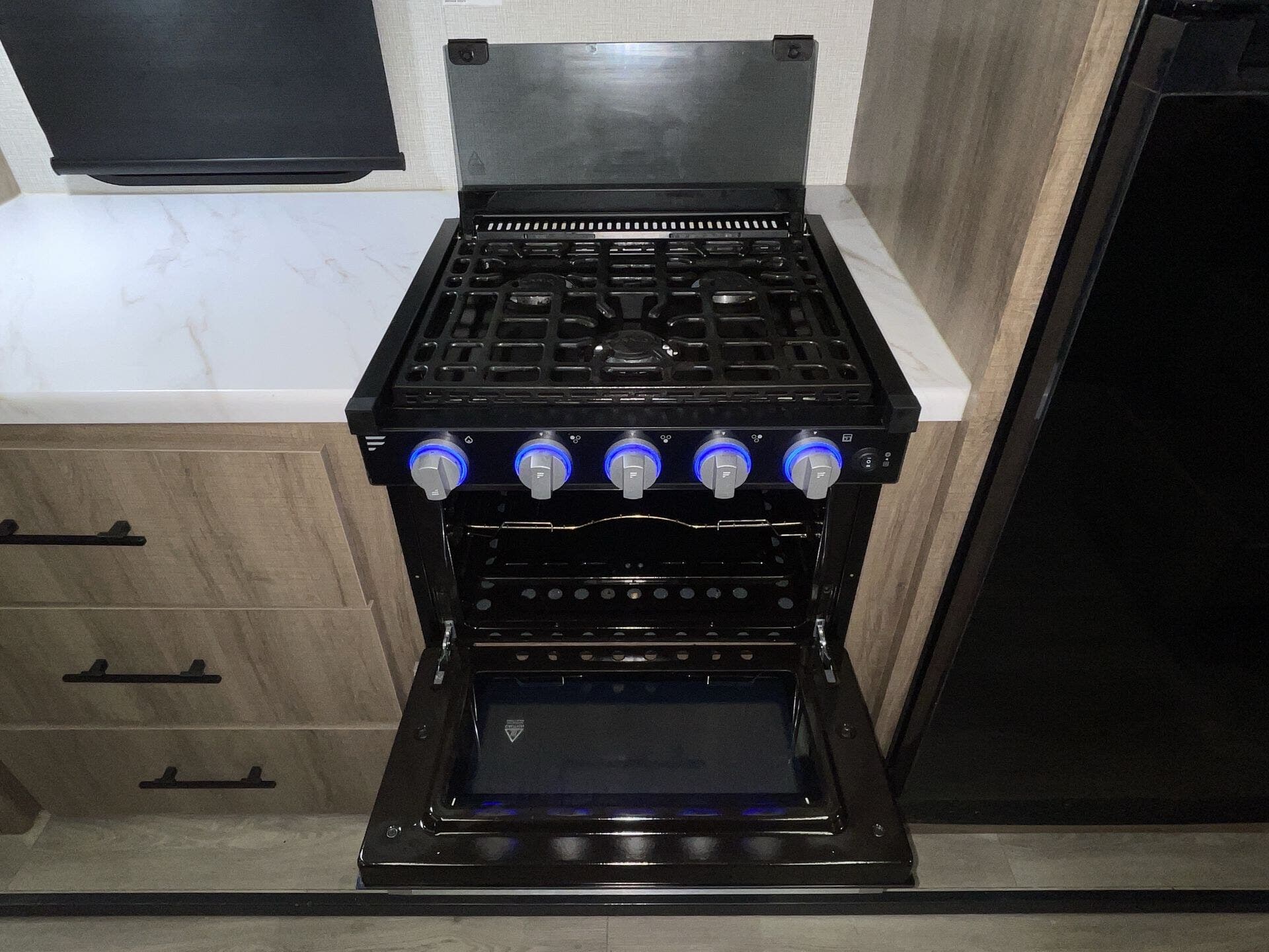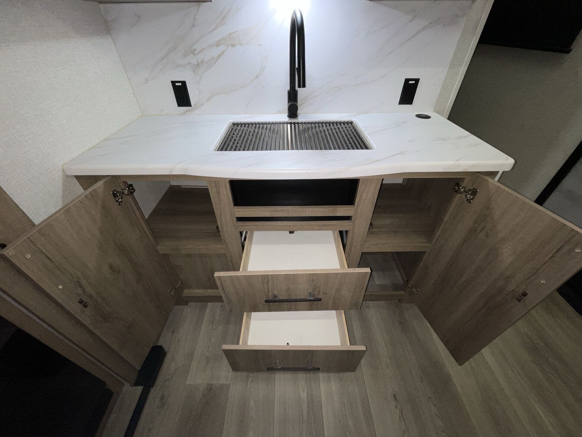 This 2024 Imagine 3100RD blends luxury and functionality so well. The rear living area, tucked behind dual slides, gives you tons of space with tri-fold sofas, theater seats, and that great big fireplace to wind down by. The kitchen is solid — full appliances, pantry space, and a freestanding table so you actually want to cook or hang out inside.