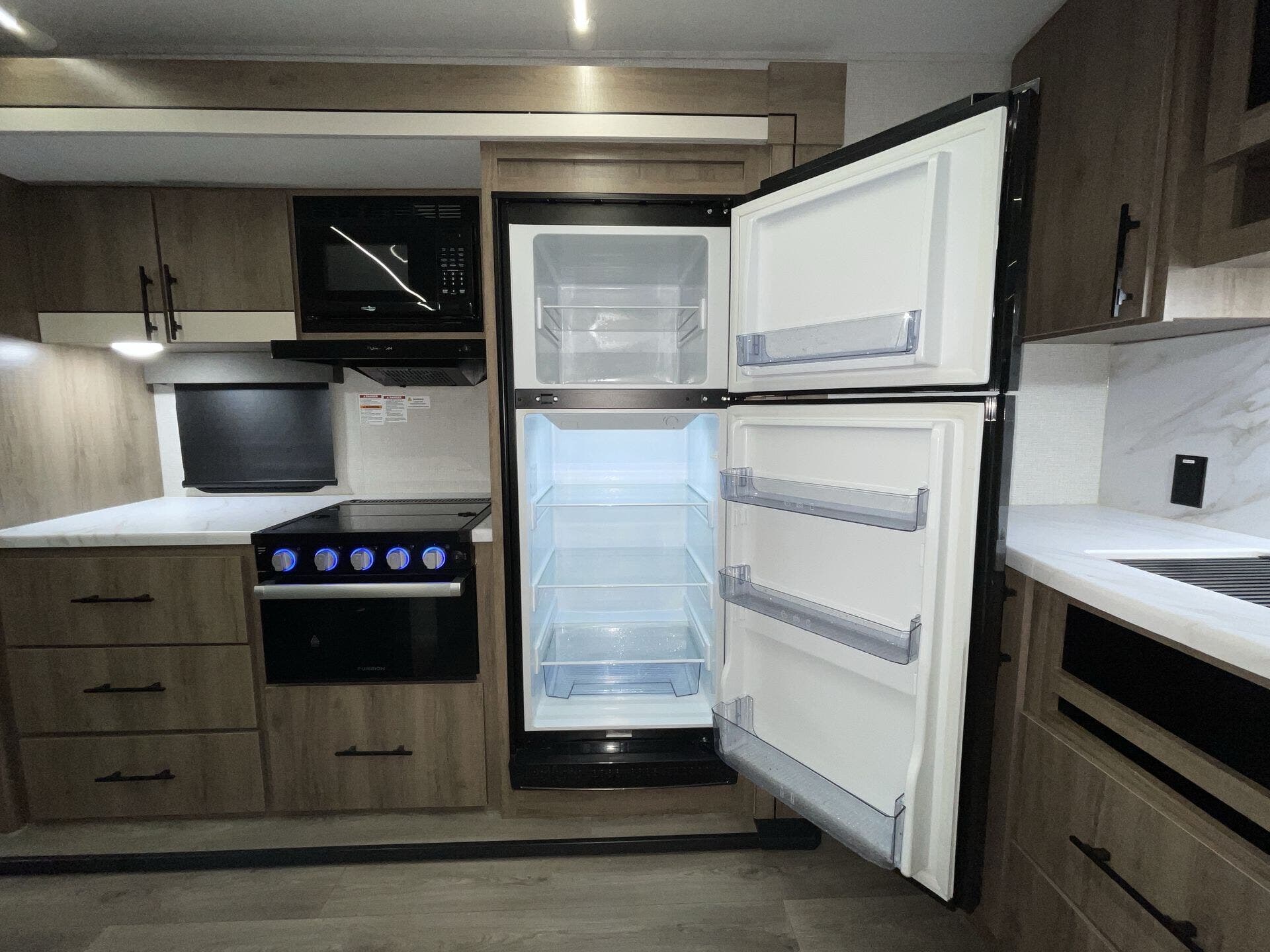 Free-standing dinette + full kitchen with 3-burner range & double-door 12V refrigerator