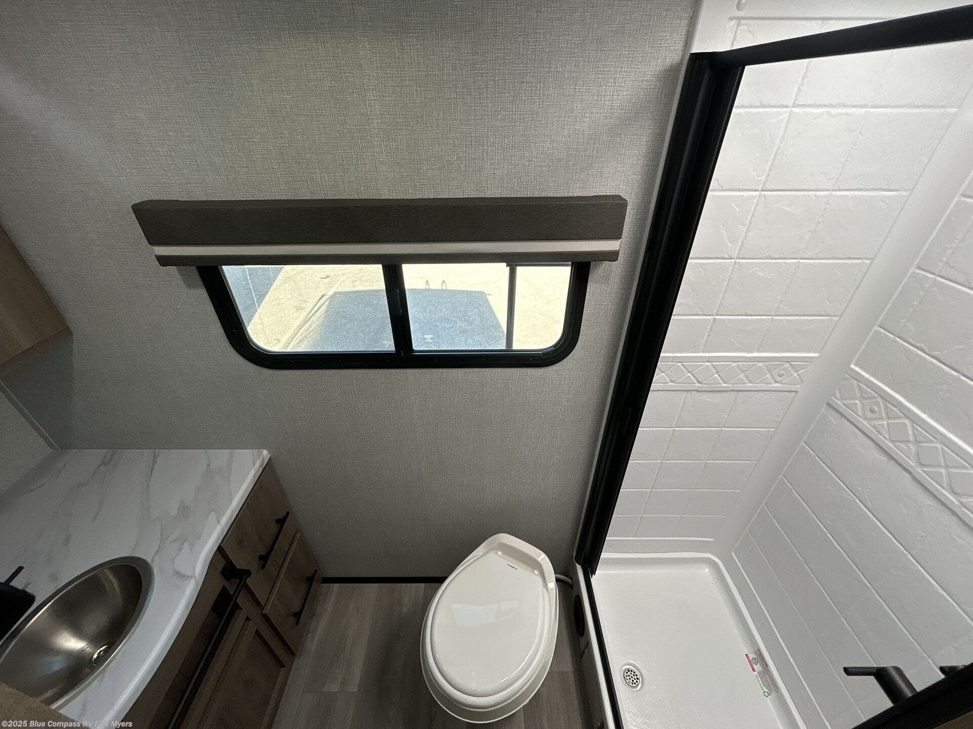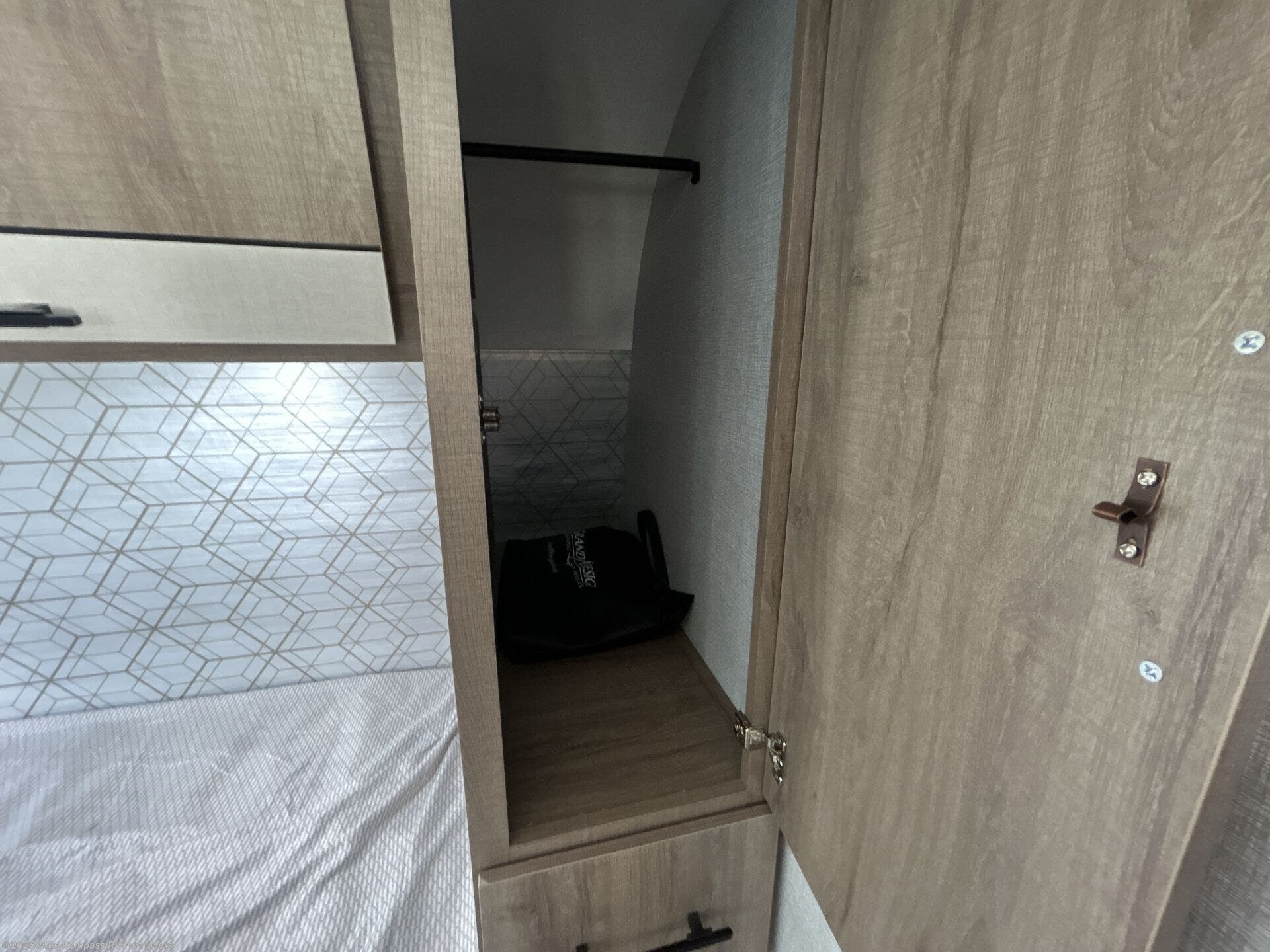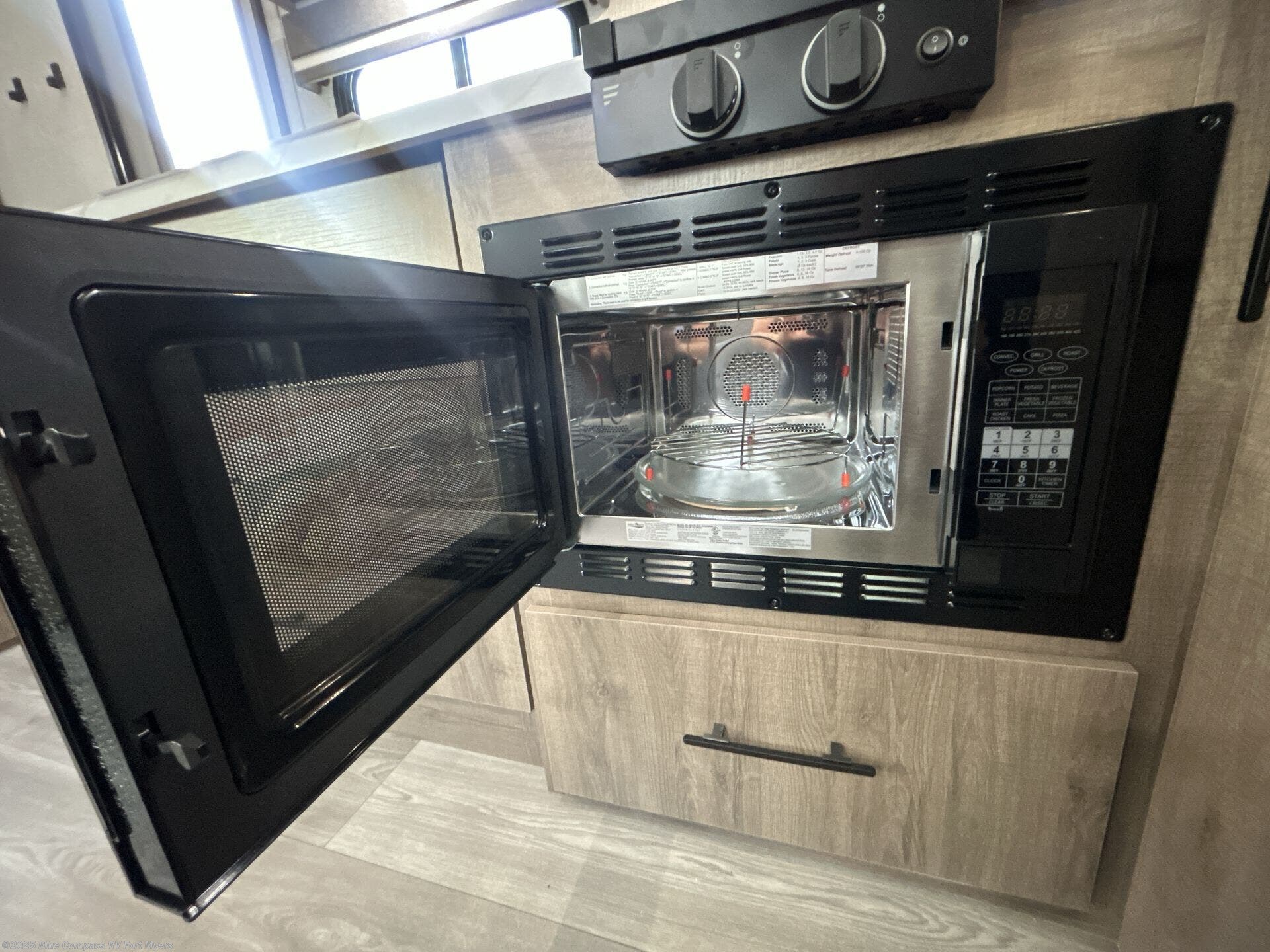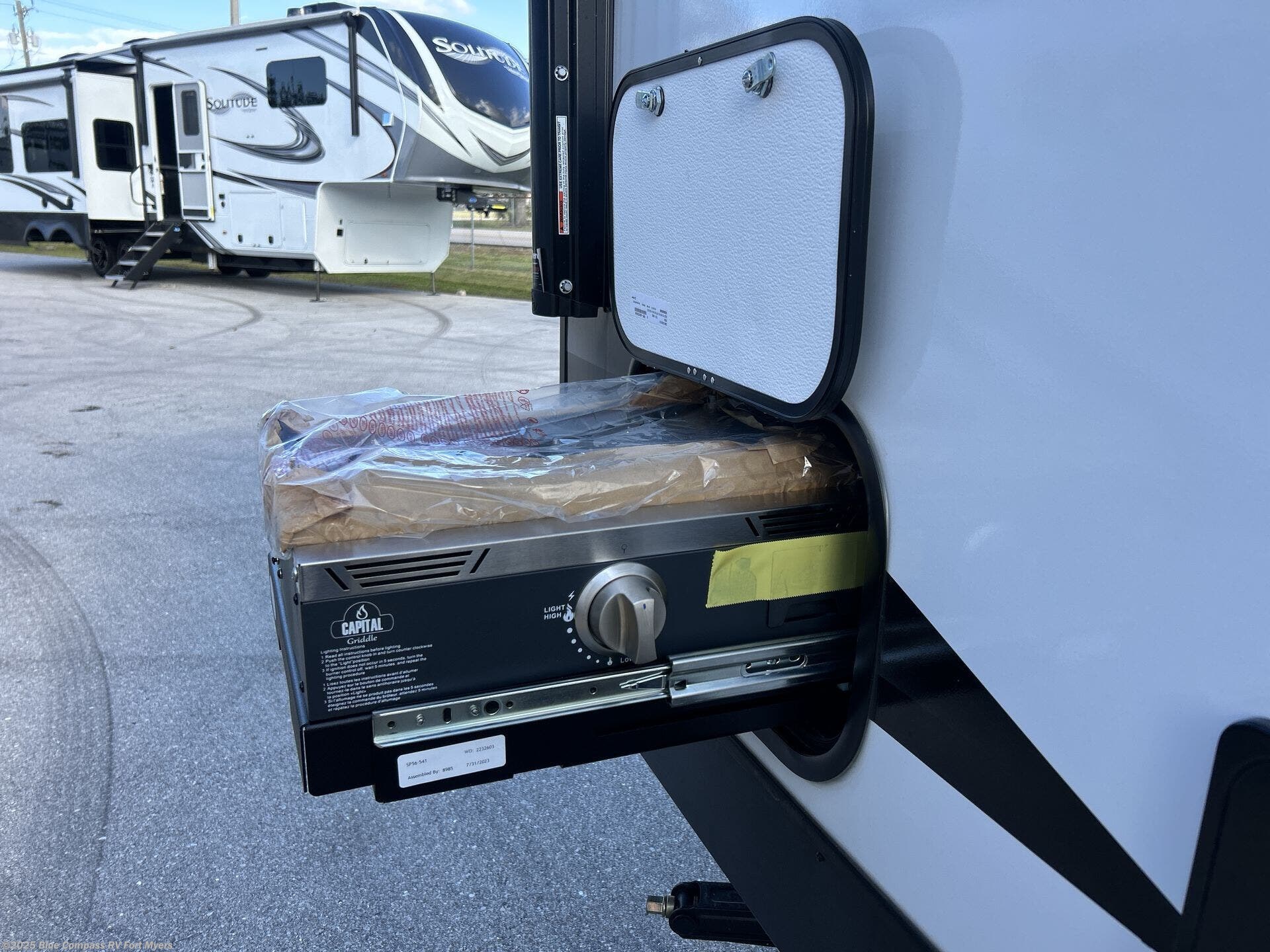 Pack your bags and head out on a fun camping trip in this travel trailer! The front queen bed offers a comfortable place to sleep at night, as well as the roll-over sleeper sofa slide with drawers for storage. You can hang your jacket up on one of the coat hooks when you enter, and then start preparing a delicious meal on the two burner cooktop. You even have an outside griddle to fry up the catch of the day. The full rear bathroom has a walk-in shower with skylight to freshen up in and overhead cabinets for your toiletries!