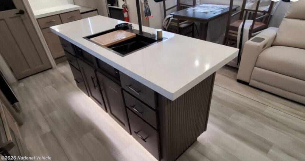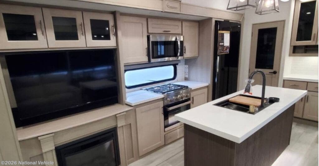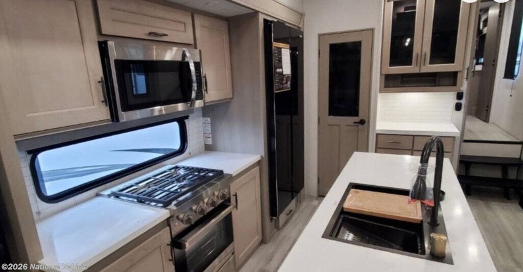 The 3503GK features an expansive rear kitchen with solid-surface countertops, a large center island, residential-style refrigerator, three-burner cooktop, oven, and generous pantry storage. Designed for serious meal prep or casual entertaining, this layout makes cooking on the road effortless.