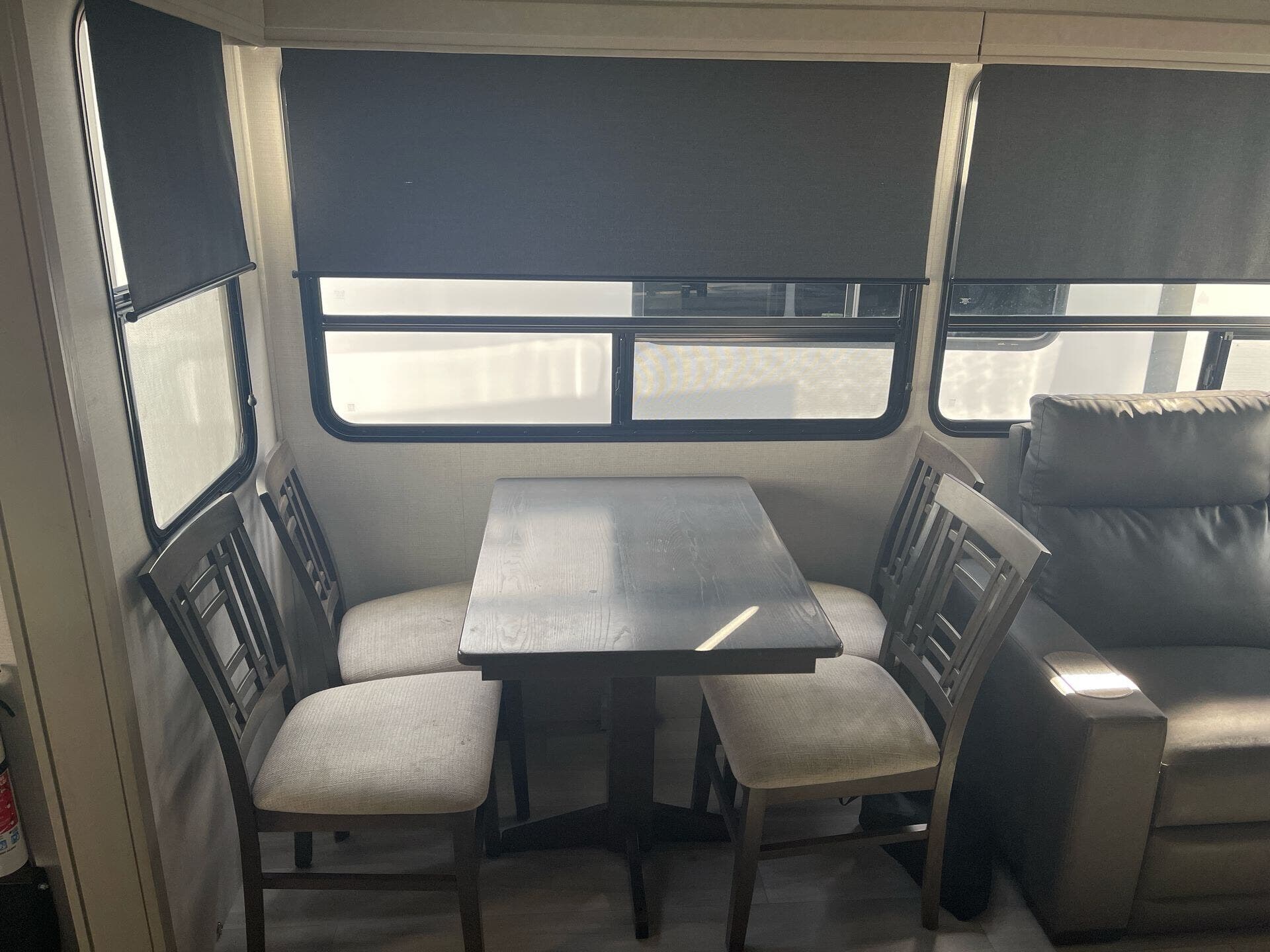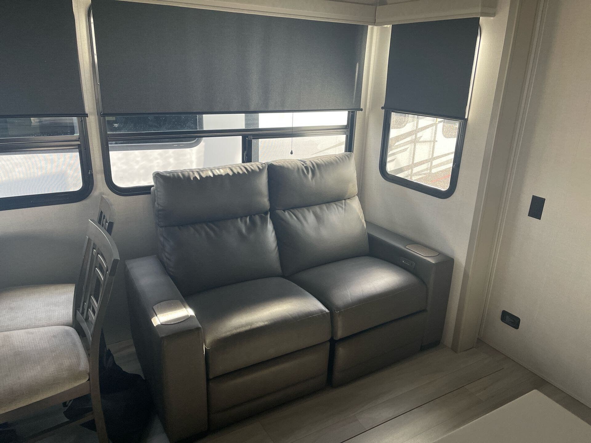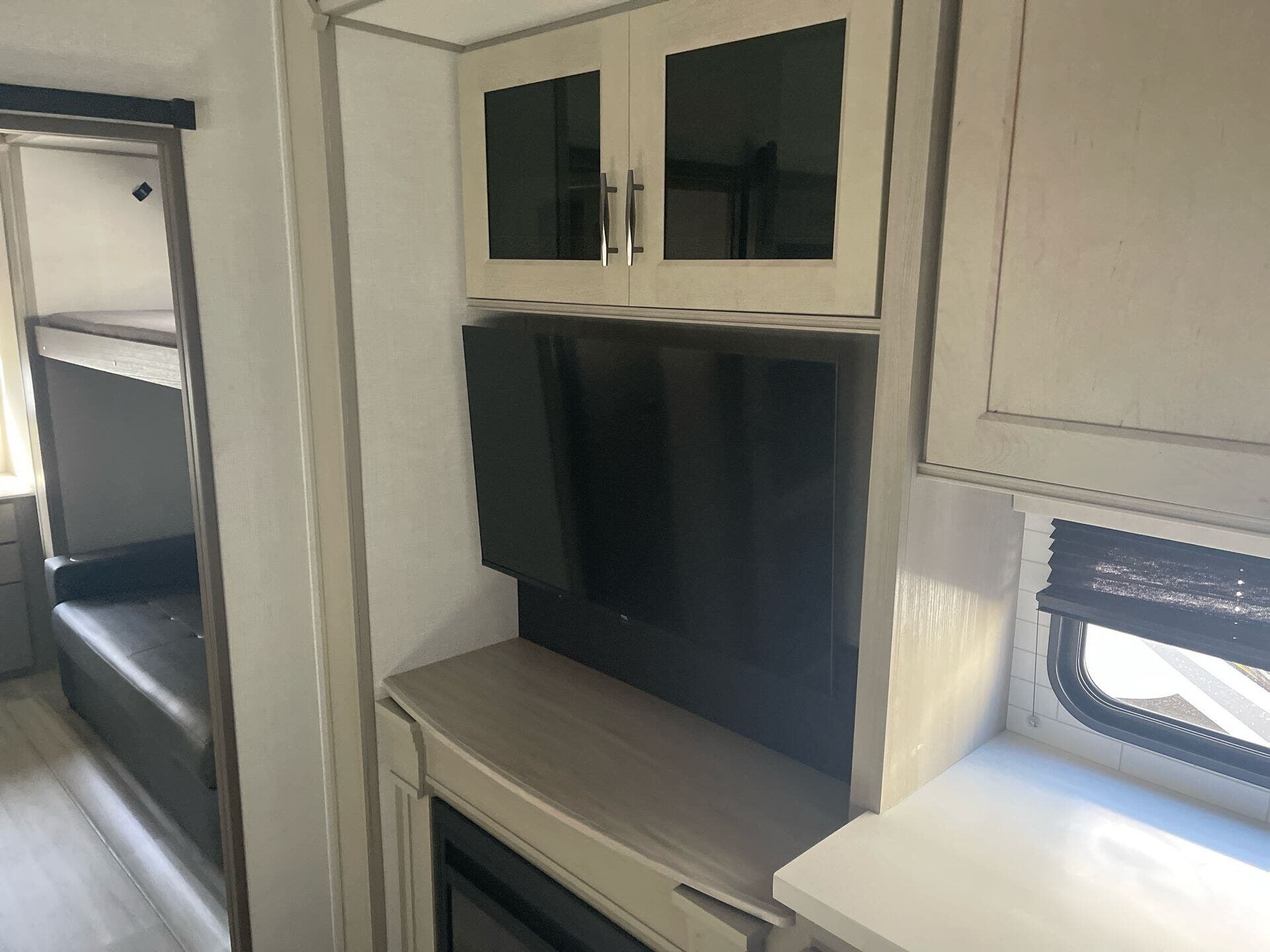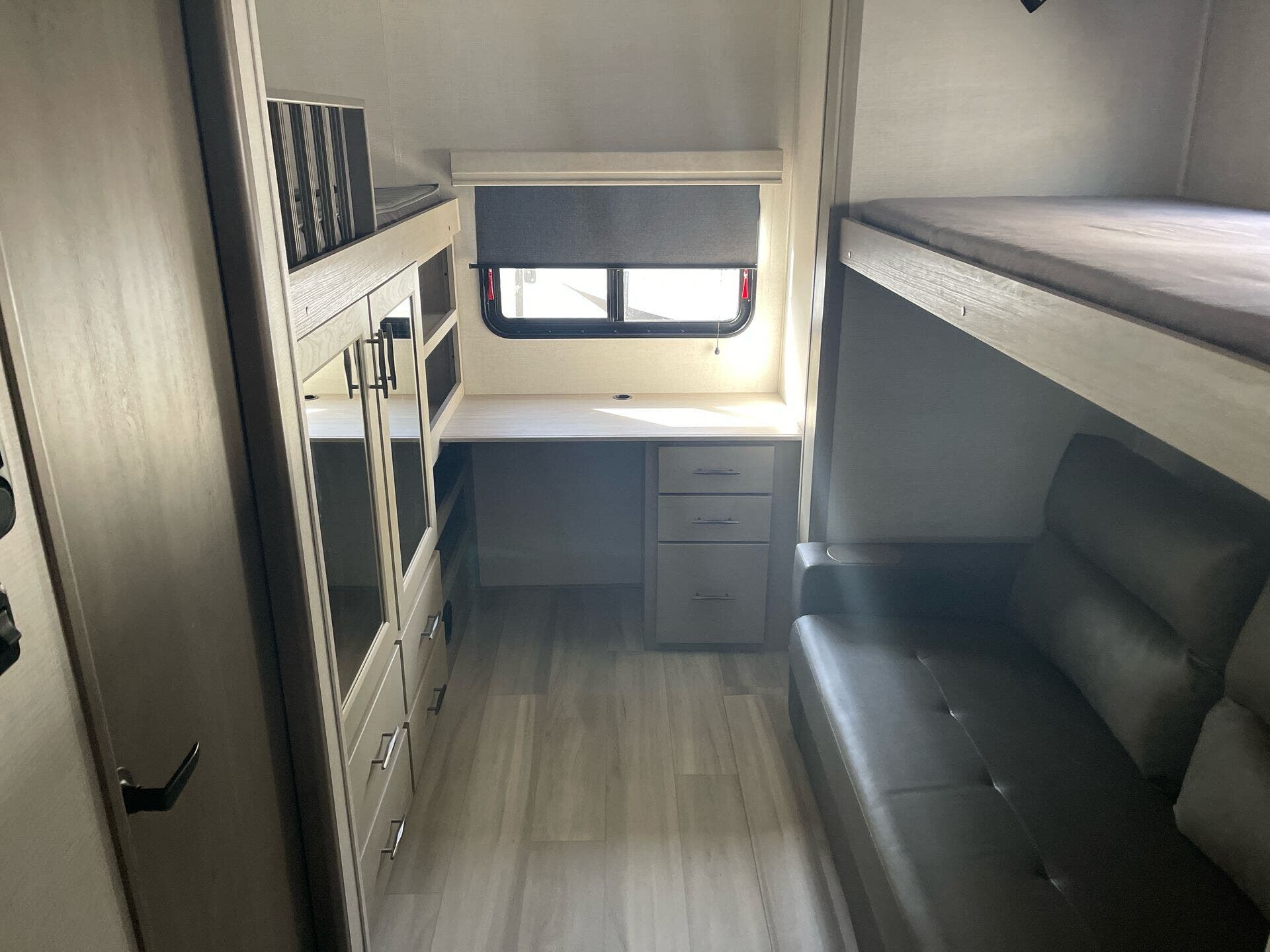 Inside the Influence 3704BH, you’ll find a thoughtfully designed kitchen with solid surface countertops, a generous pantry, and residential appliances that make meal prep a pleasure. The living area includes a Smart TV and a cozy fireplace, creating a welcoming atmosphere for family movie nights. The floorplan offers flexible sleeping arrangements with a Queen bed in the bedroom, a comfortable dinette area, and convertible seating to accommodate eight occupants. With one well-equipped main living zone and a second entry into the bunk/guest area, this RV blends convenience with privacy for everyone on board.