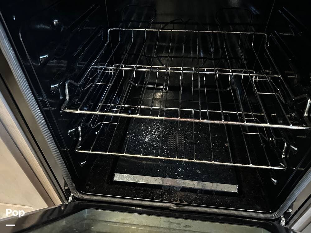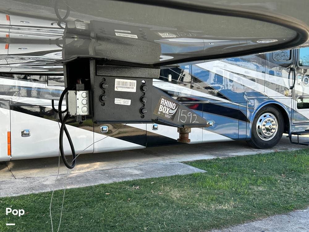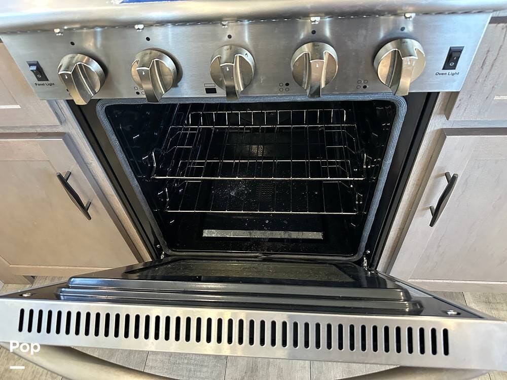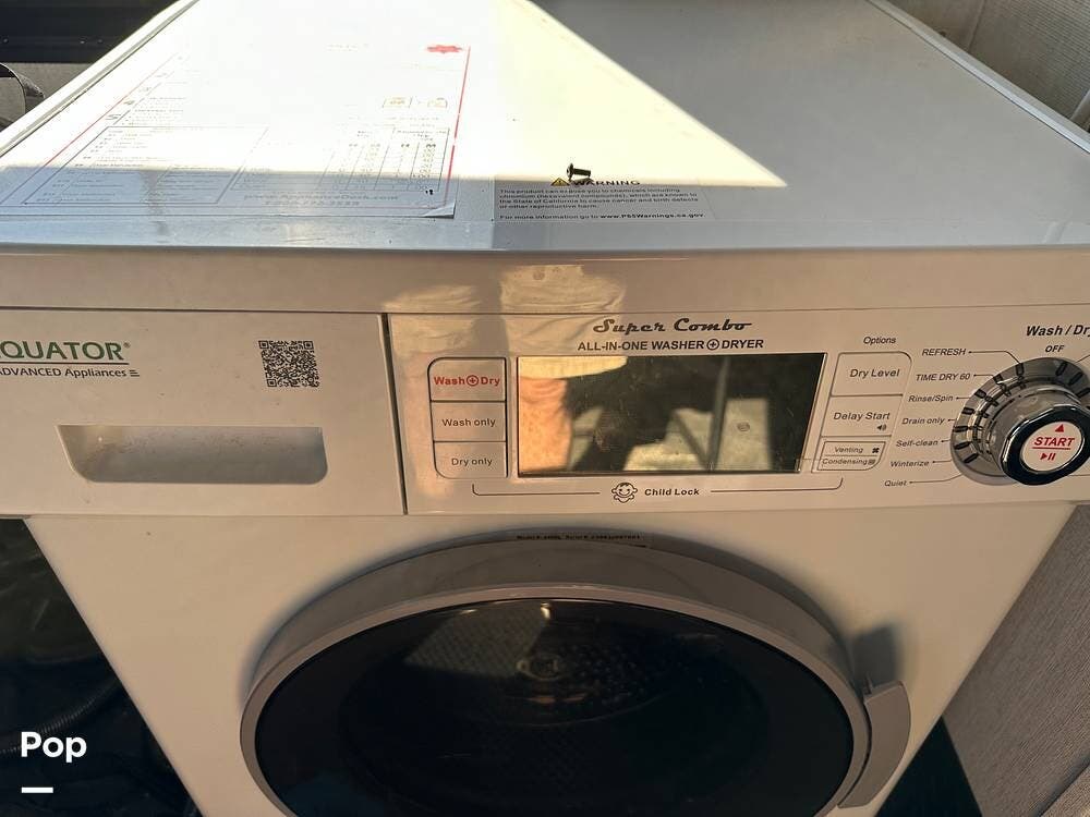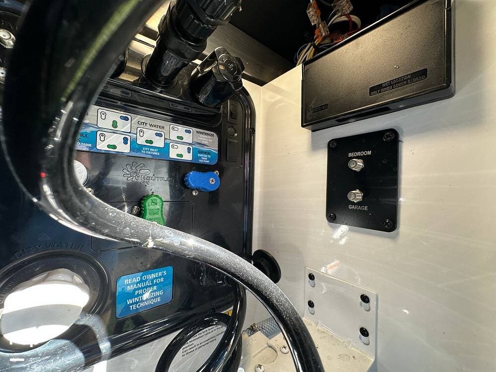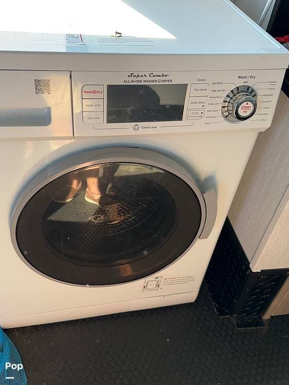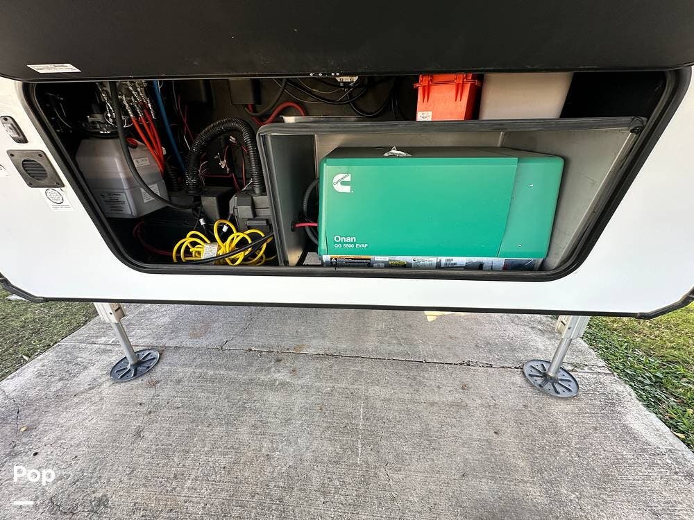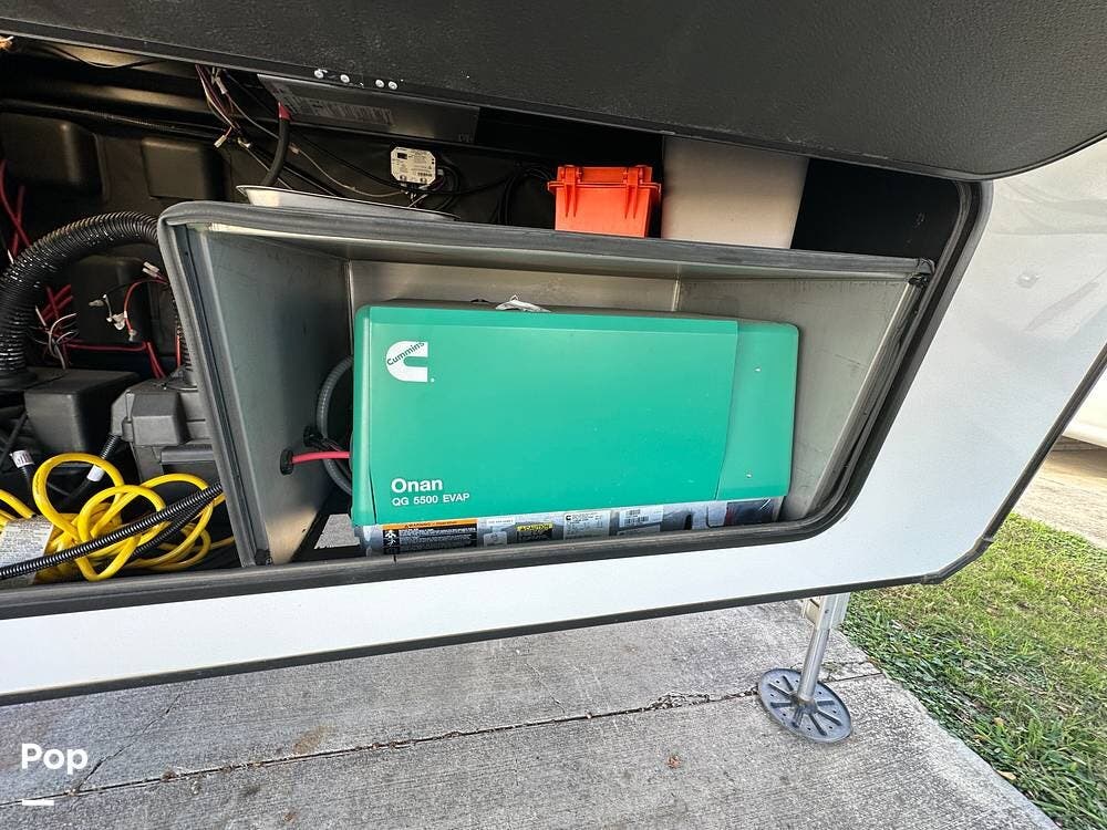 The 14-foot garage has a half bath, drop-down bunk, and sofa sleeper. A washer and dryer combo and an outdoor entertainment center are also included. You'll be prepared for any camping adventure with a 5500 Onan generator and a 60-gallon fuel station.