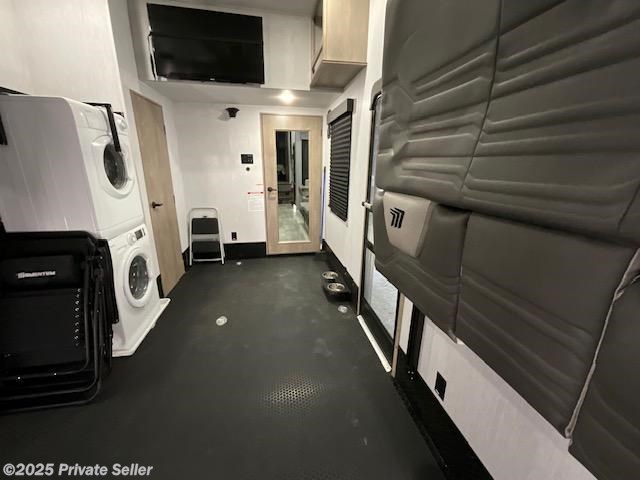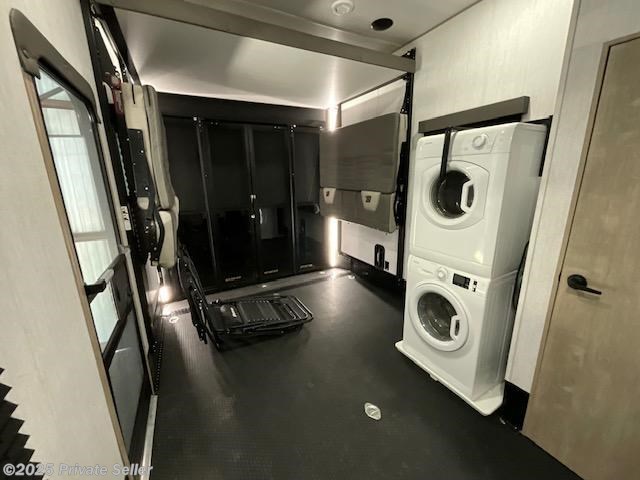The 14-foot garage has a half bath, two queen bunks, one of which converts to seating for six at the included second dining table. A stackable washer and dryer and built in dog feeding station are also in the garage with plenty of room for your larger toys ( SXS, ATV, UTV, MOTORCYCLES) Upgraded TV in the garage can be easily viewed from the outside patio. The outside patio has a perimeter fence, an extending canopy and two chaise lounges. There is a gate in the perimeter fence that leads to a third entry exit location with steps descending from the patio. The garage has glass doors with operable windows and screens for multi season use. You'll be prepared for any camping adventure with a 5500 watt generator with only 5 hours of run time and a 60-gallon fuel station.