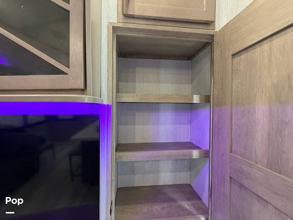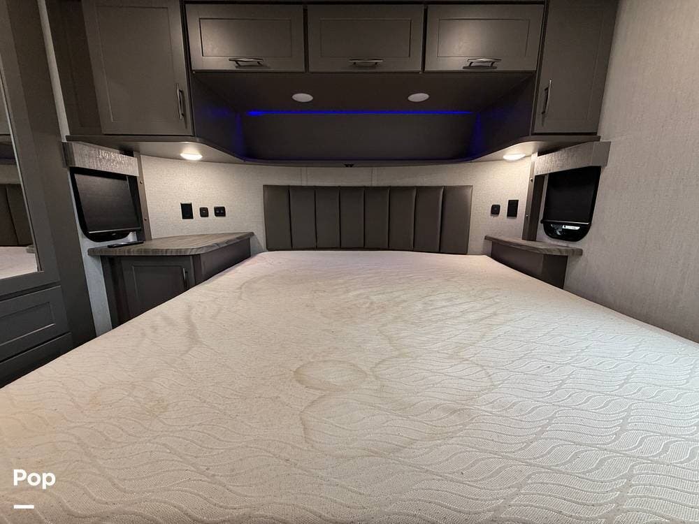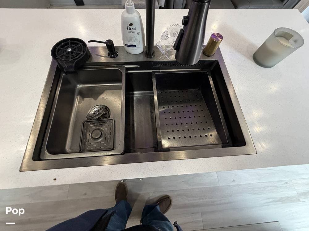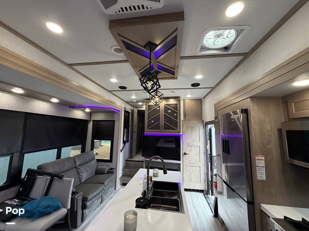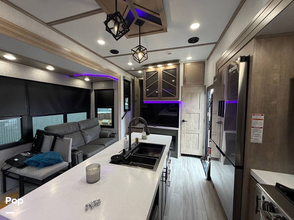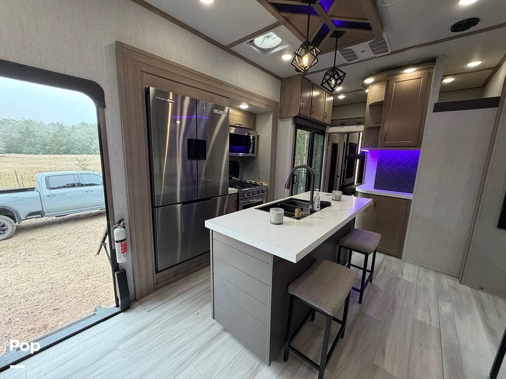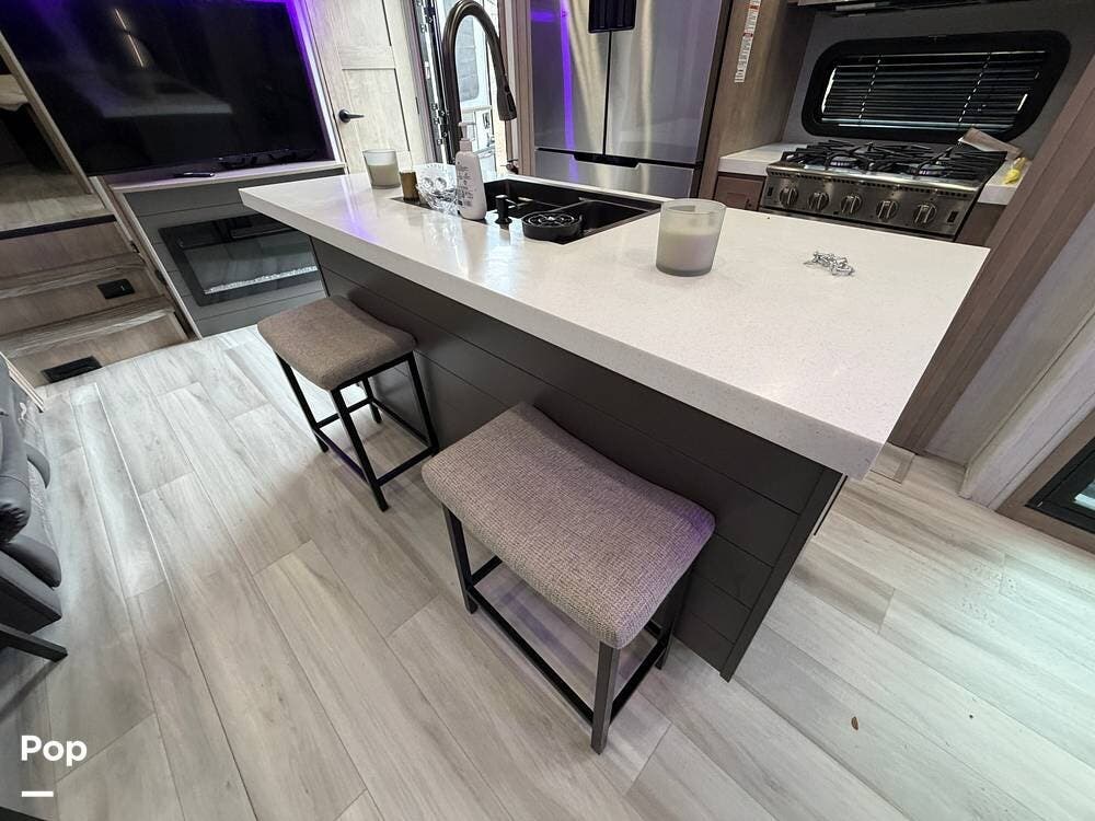 It has a well-laid-out kitchen with solid-surface countertops, a large island, modern appliances, and generous cabinet space, making it ideal for extended trips or full-time living. The open living area offers comfortable seating and an entertainment setup that creates a true residential feel while traveling.