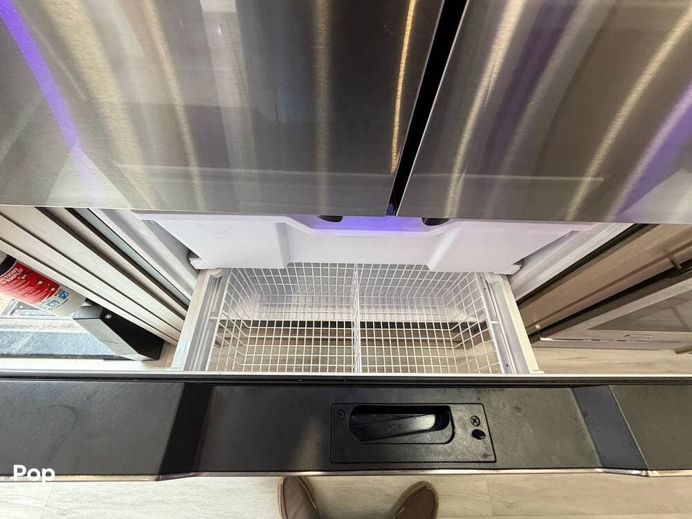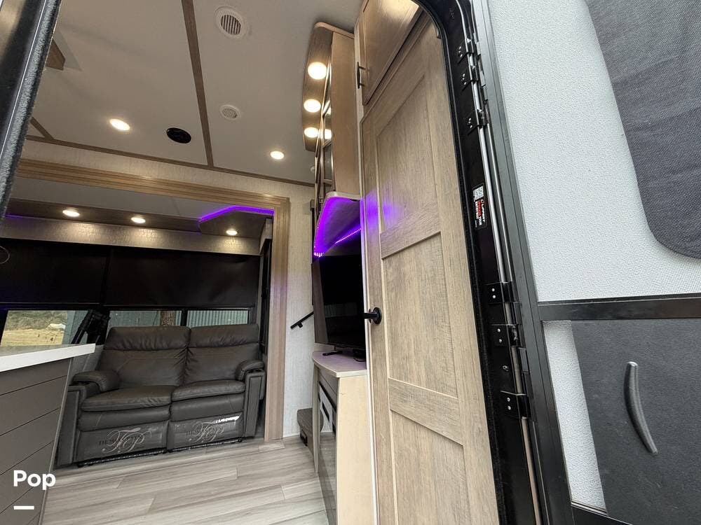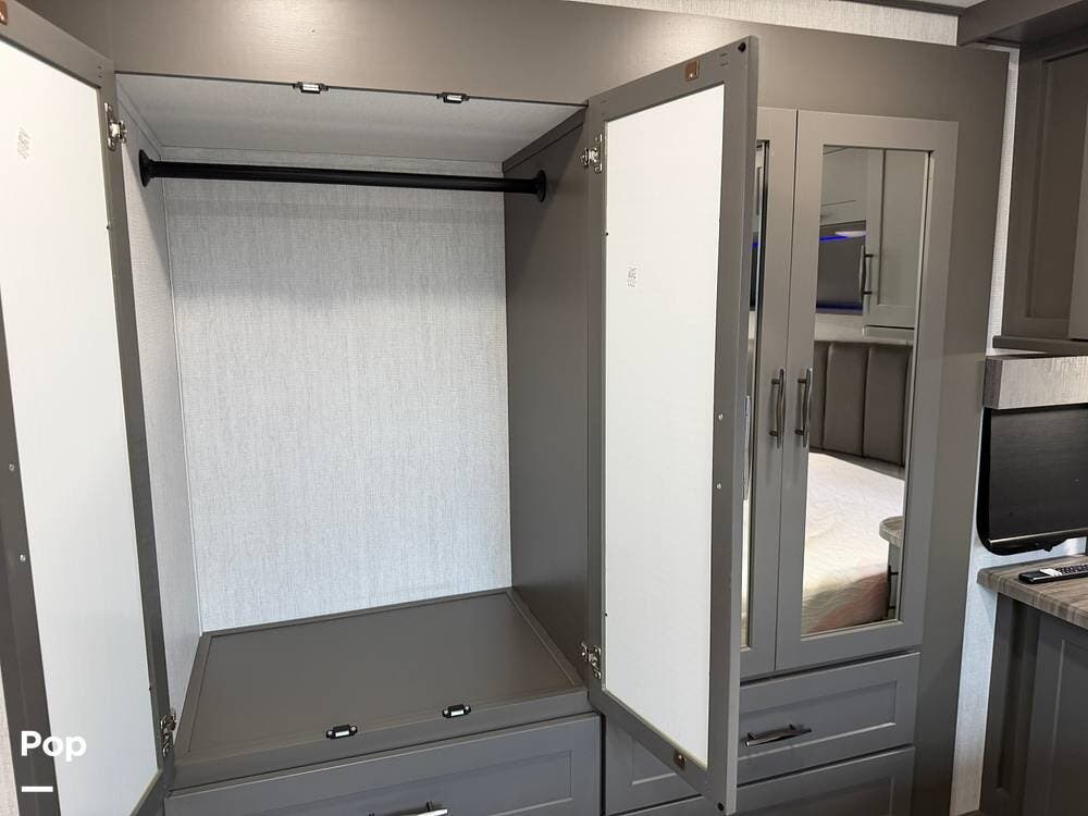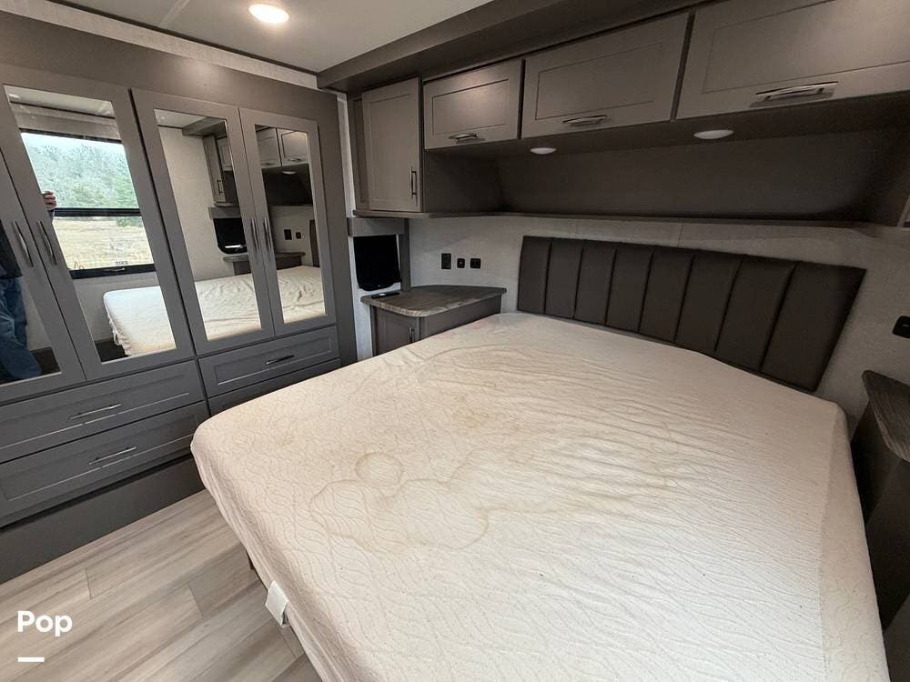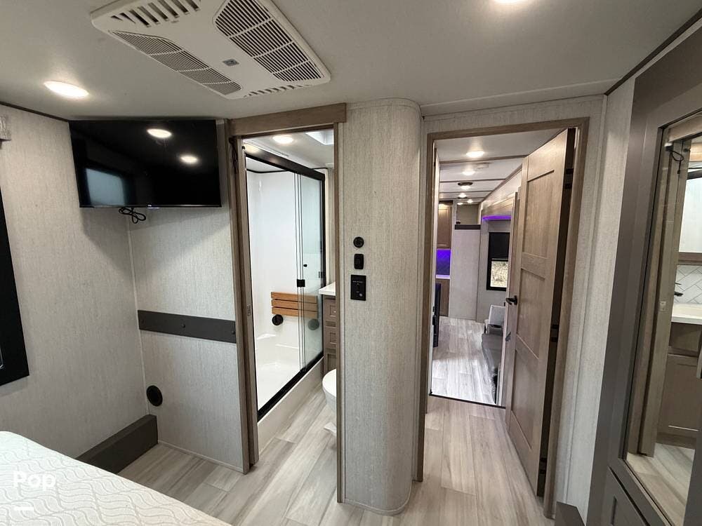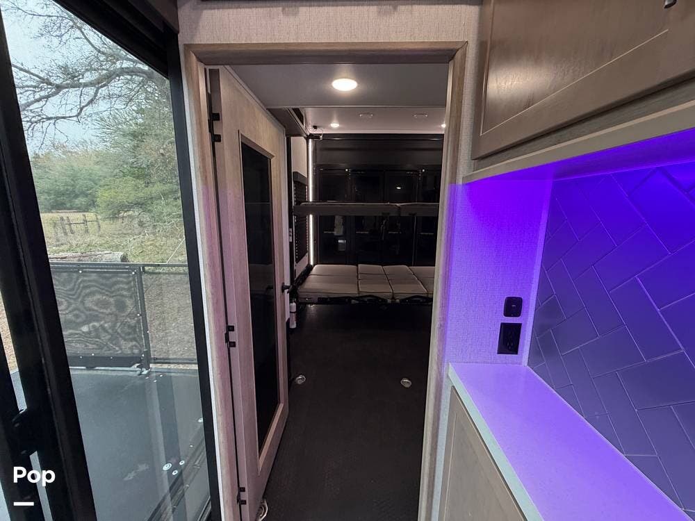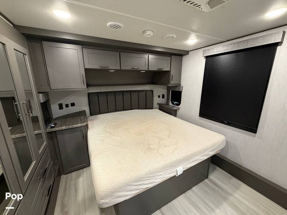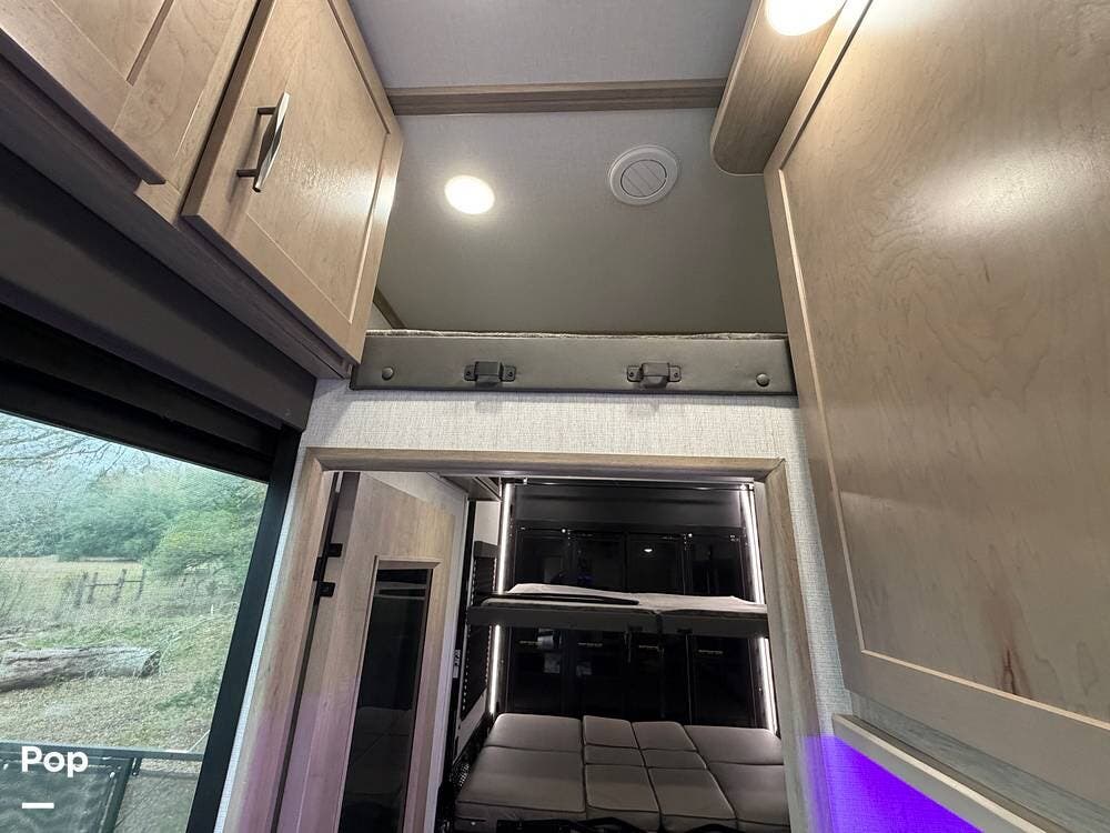 It has a well-laid-out kitchen with solid-surface countertops, a large island, modern appliances, and generous cabinet space, making it ideal for extended trips or full-time living. The open living area offers comfortable seating and an entertainment setup that creates a true residential feel while traveling.