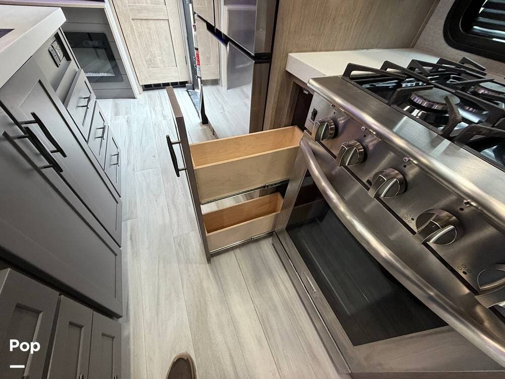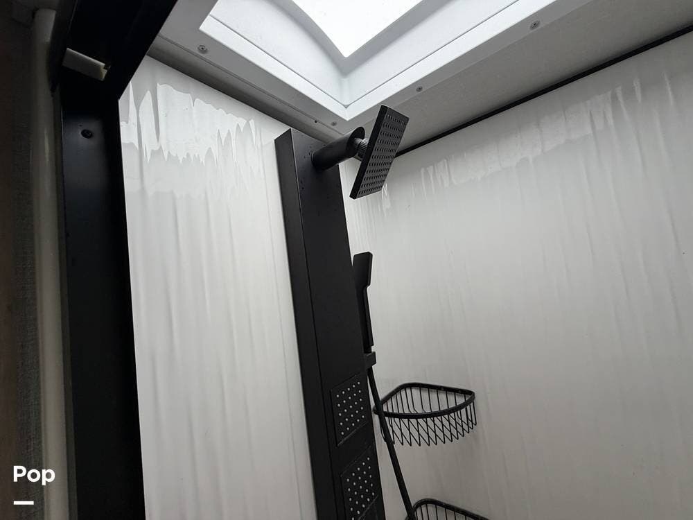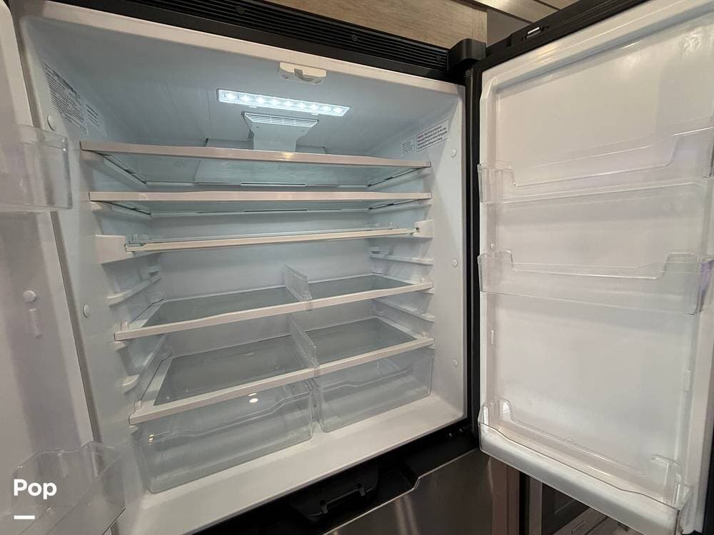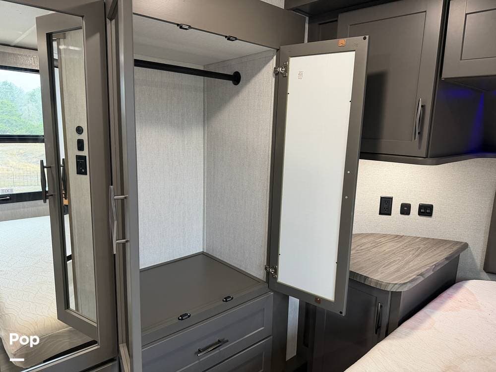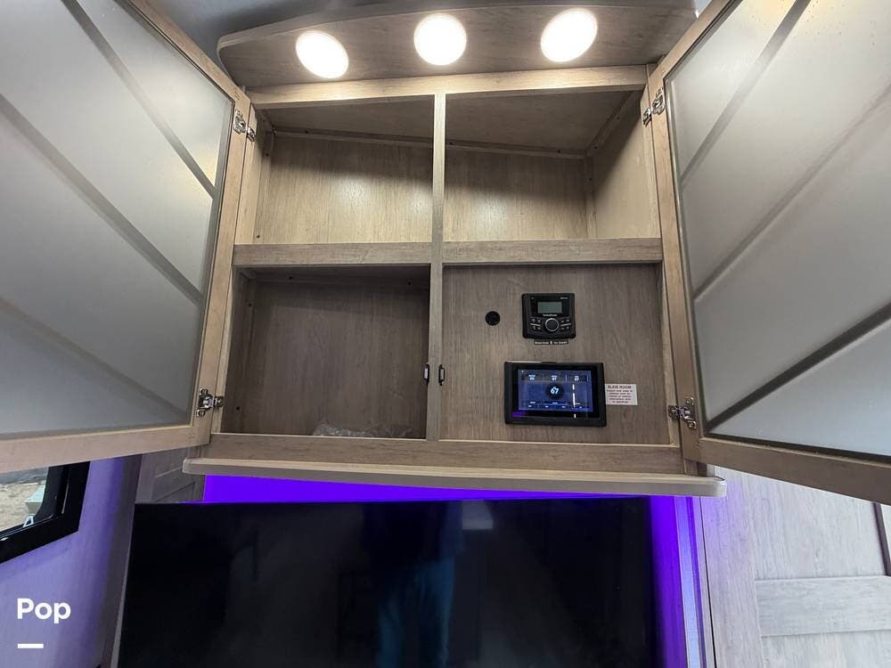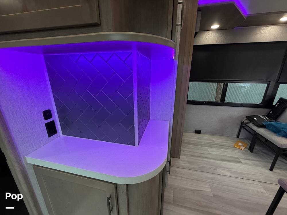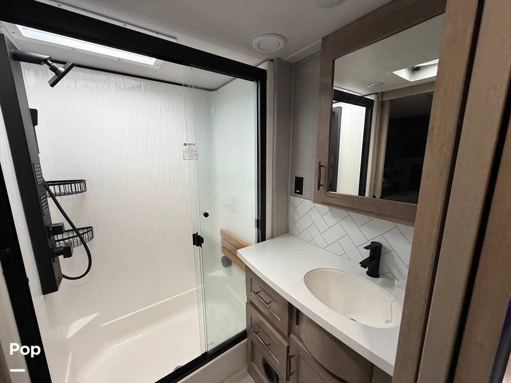 It has a well-laid-out kitchen with solid-surface countertops, a large island, modern appliances, and generous cabinet space, making it ideal for extended trips or full-time living. The open living area offers comfortable seating and an entertainment setup that creates a true residential feel while traveling.