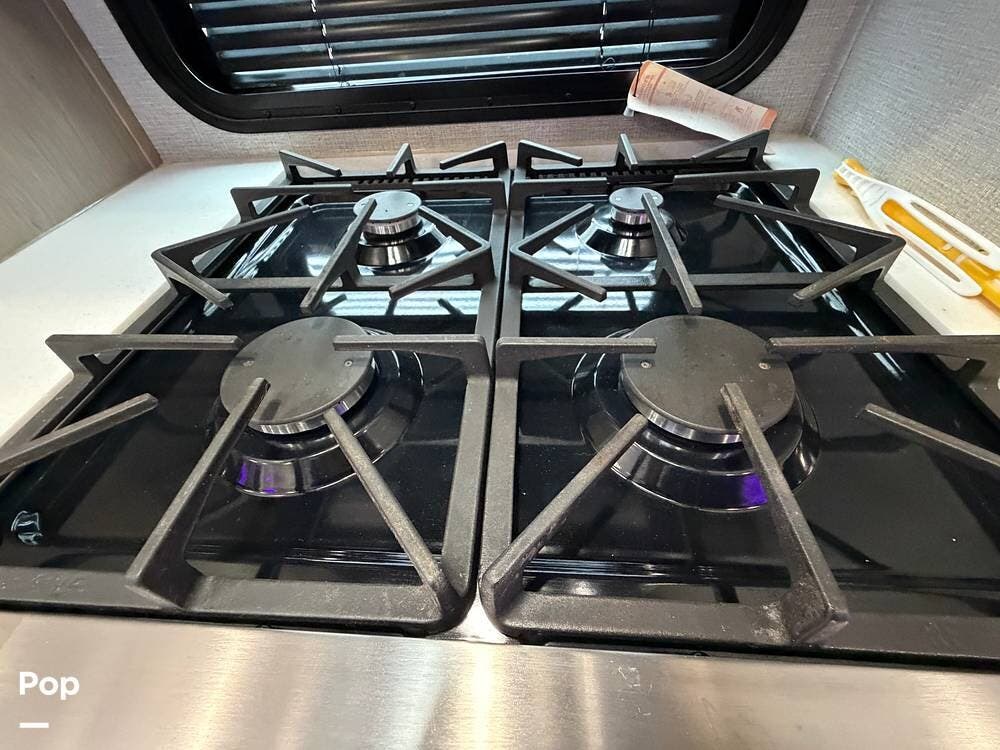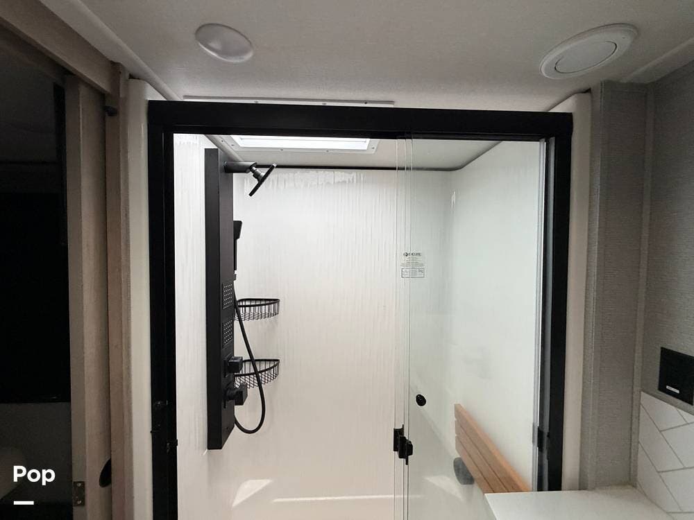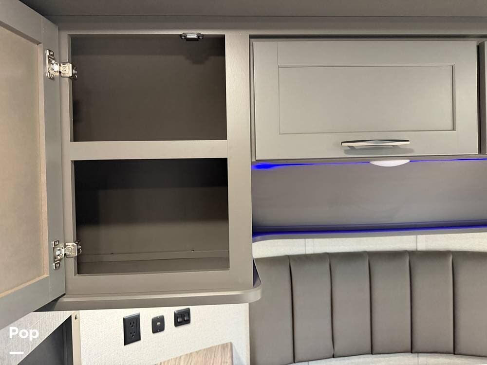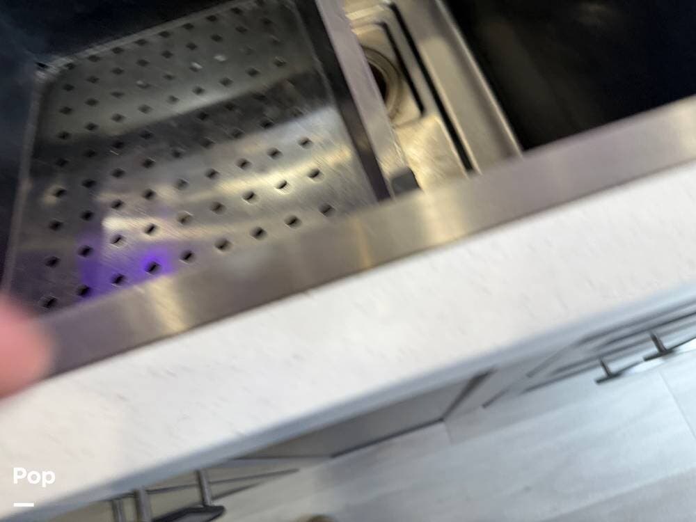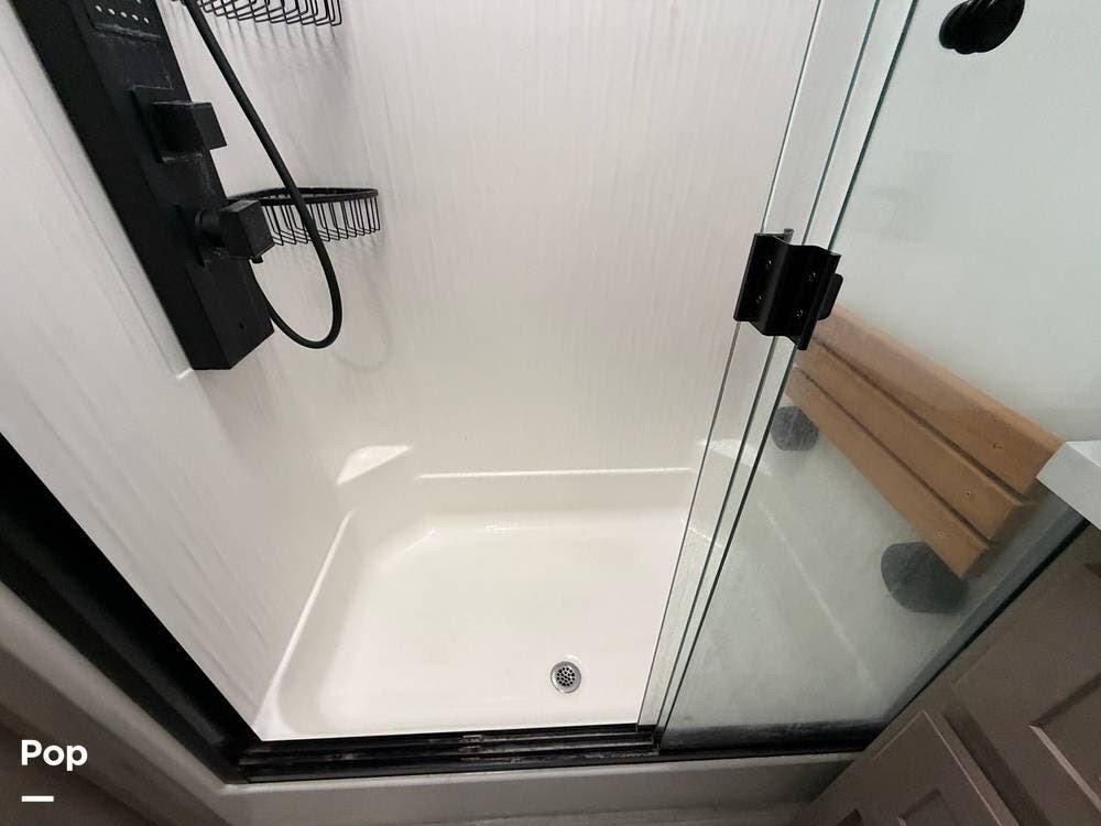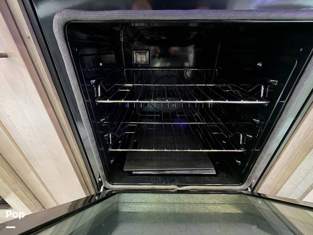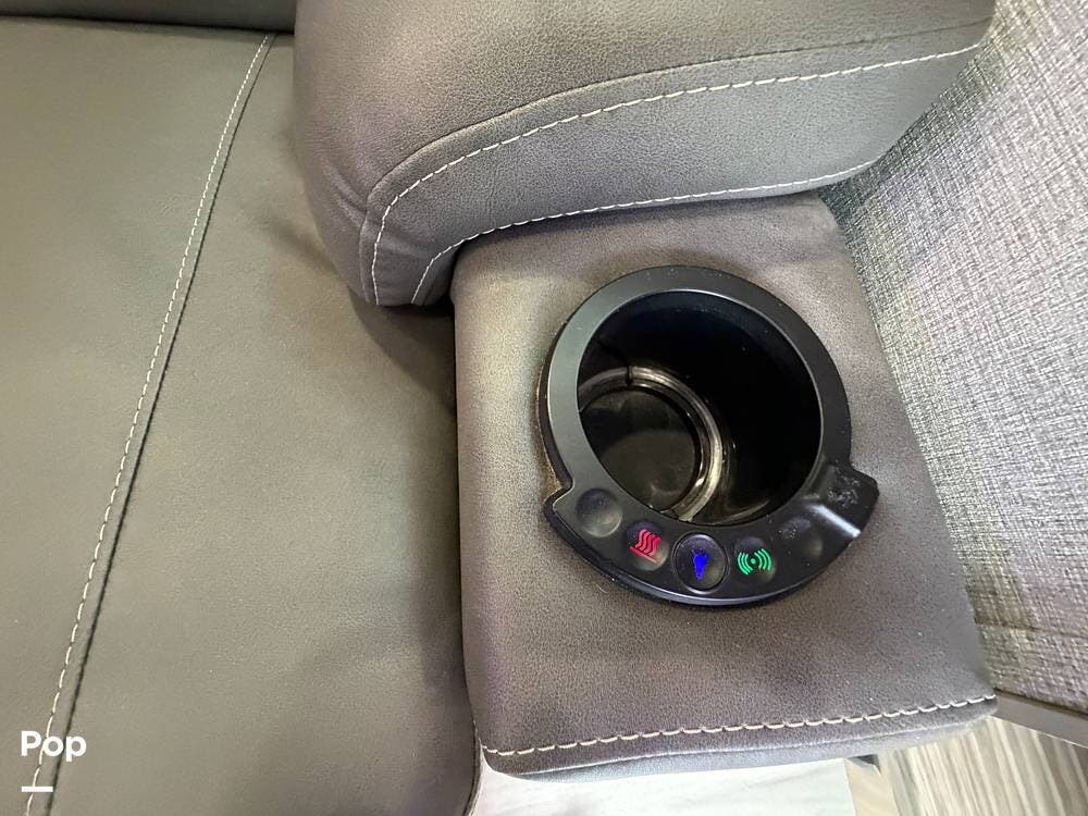 It has a well-laid-out kitchen with solid-surface countertops, a large island, modern appliances, and generous cabinet space, making it ideal for extended trips or full-time living. The open living area offers comfortable seating and an entertainment setup that creates a true residential feel while traveling.