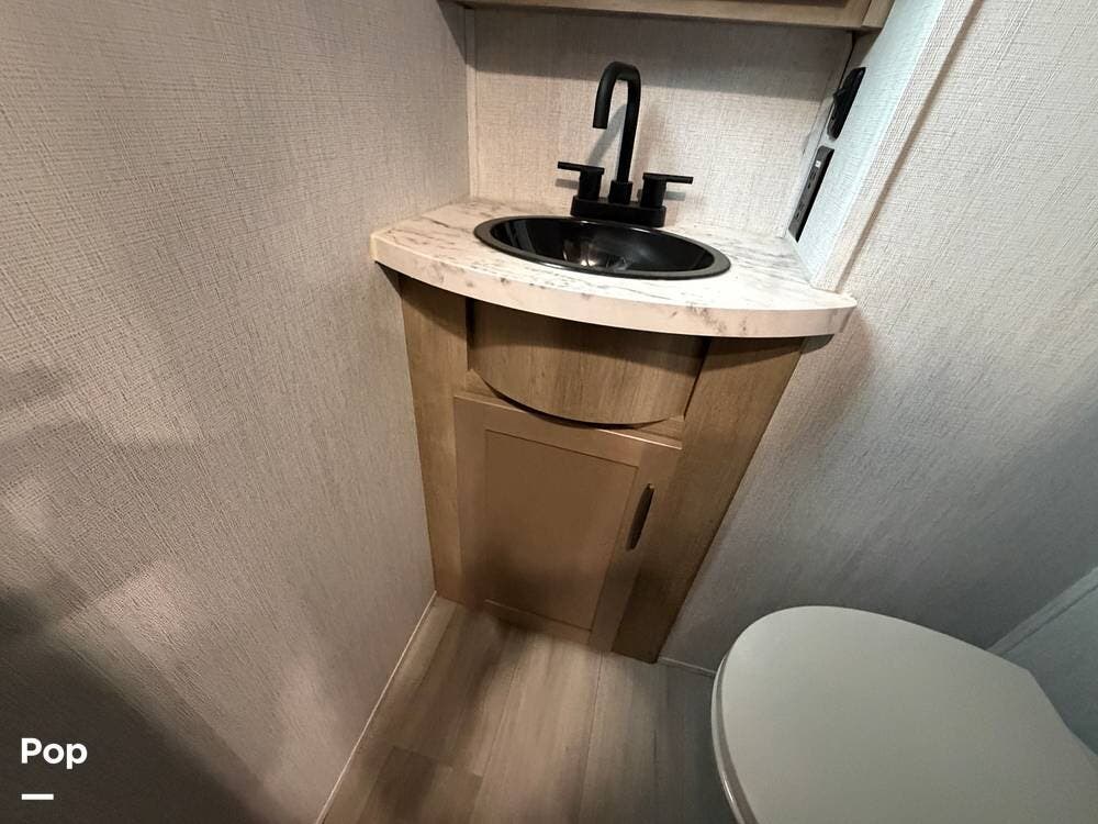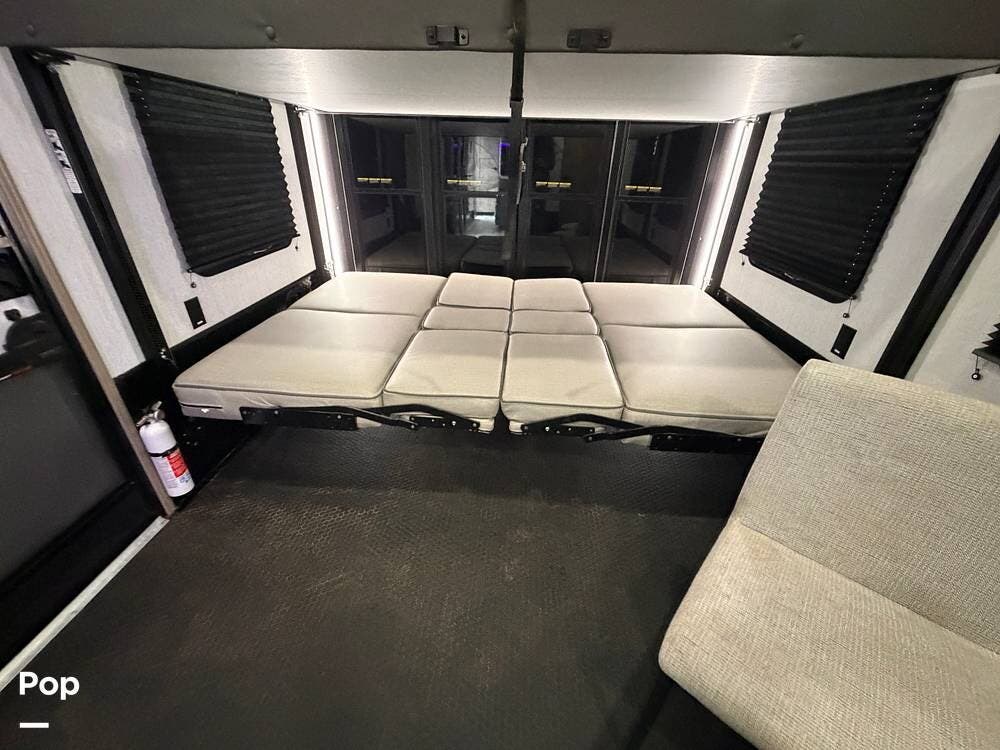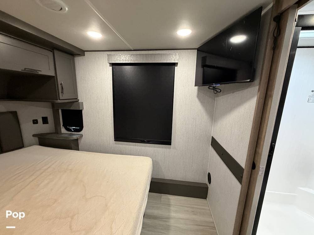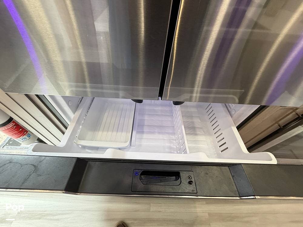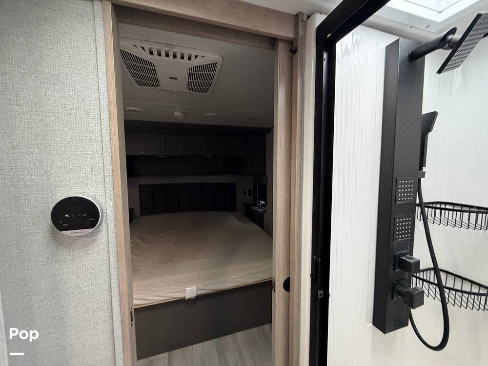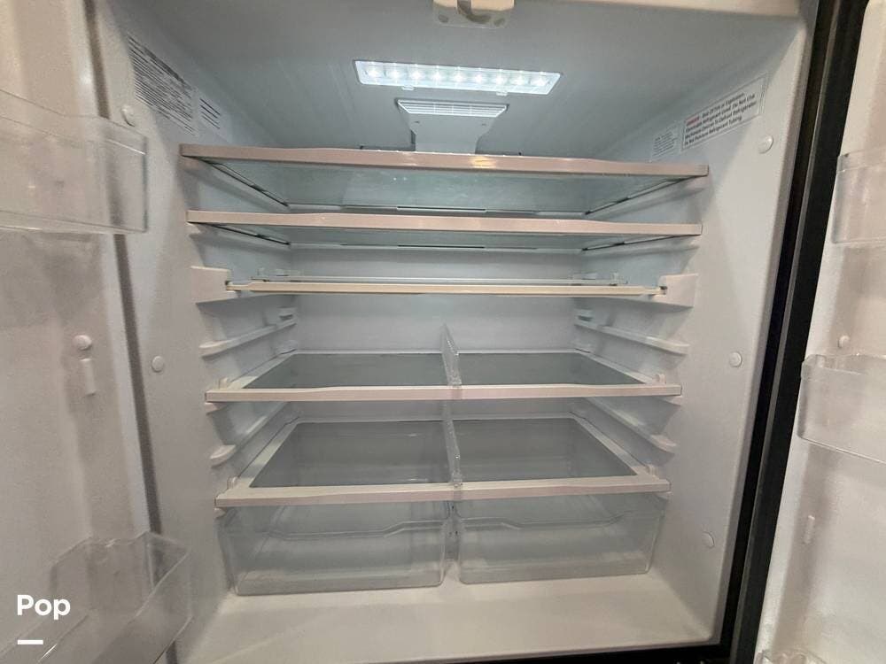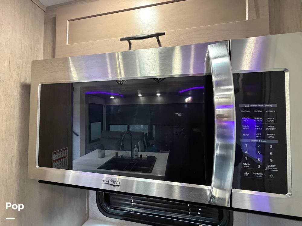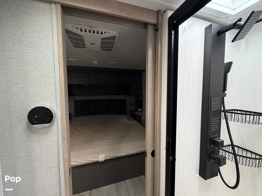 It has a well-laid-out kitchen with solid-surface countertops, a large island, modern appliances, and generous cabinet space, making it ideal for extended trips or full-time living. The open living area offers comfortable seating and an entertainment setup that creates a true residential feel while traveling.