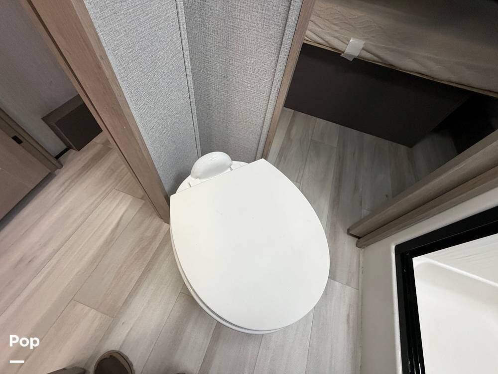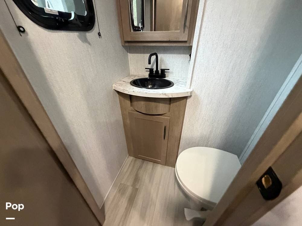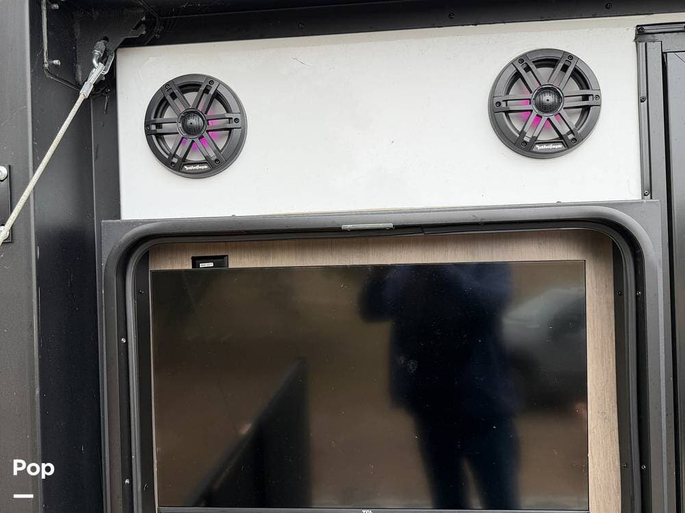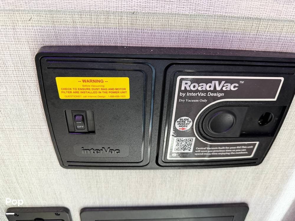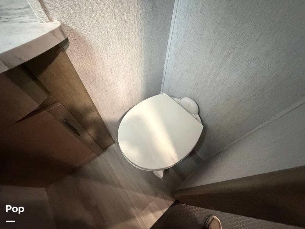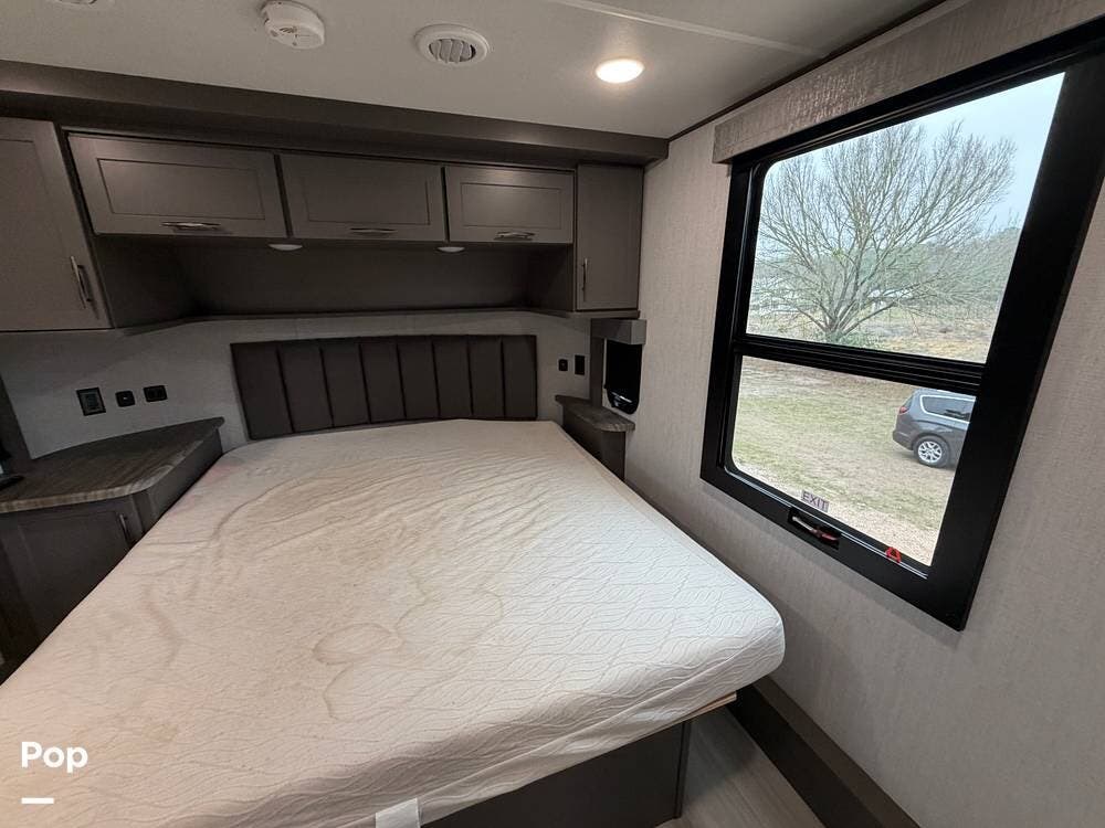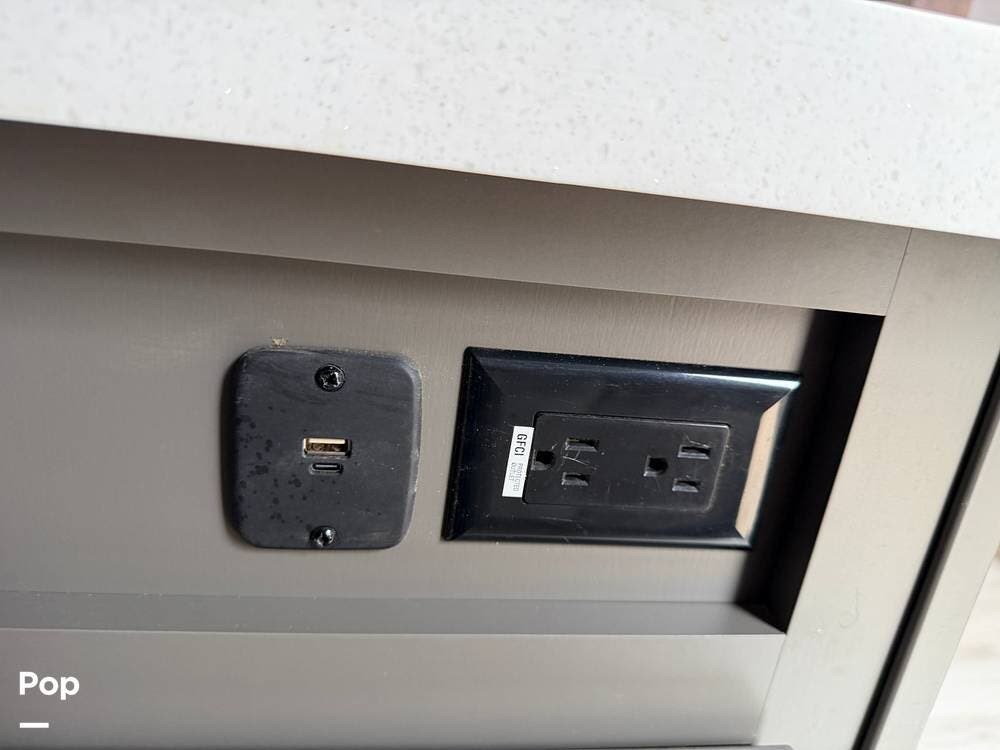 It has a well-laid-out kitchen with solid-surface countertops, a large island, modern appliances, and generous cabinet space, making it ideal for extended trips or full-time living. The open living area offers comfortable seating and an entertainment setup that creates a true residential feel while traveling.